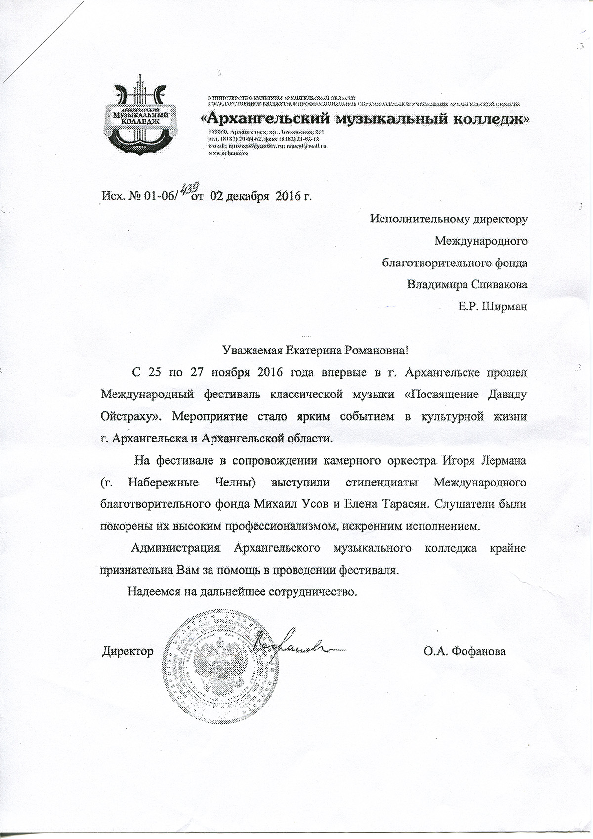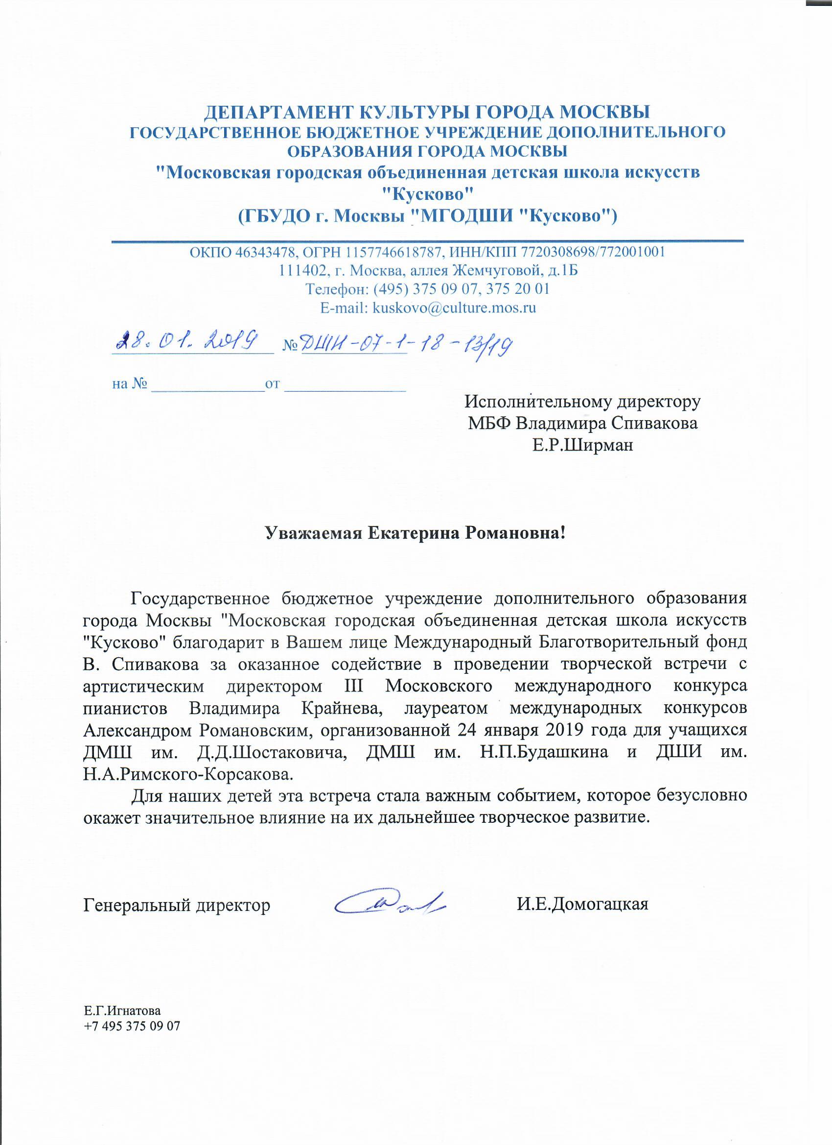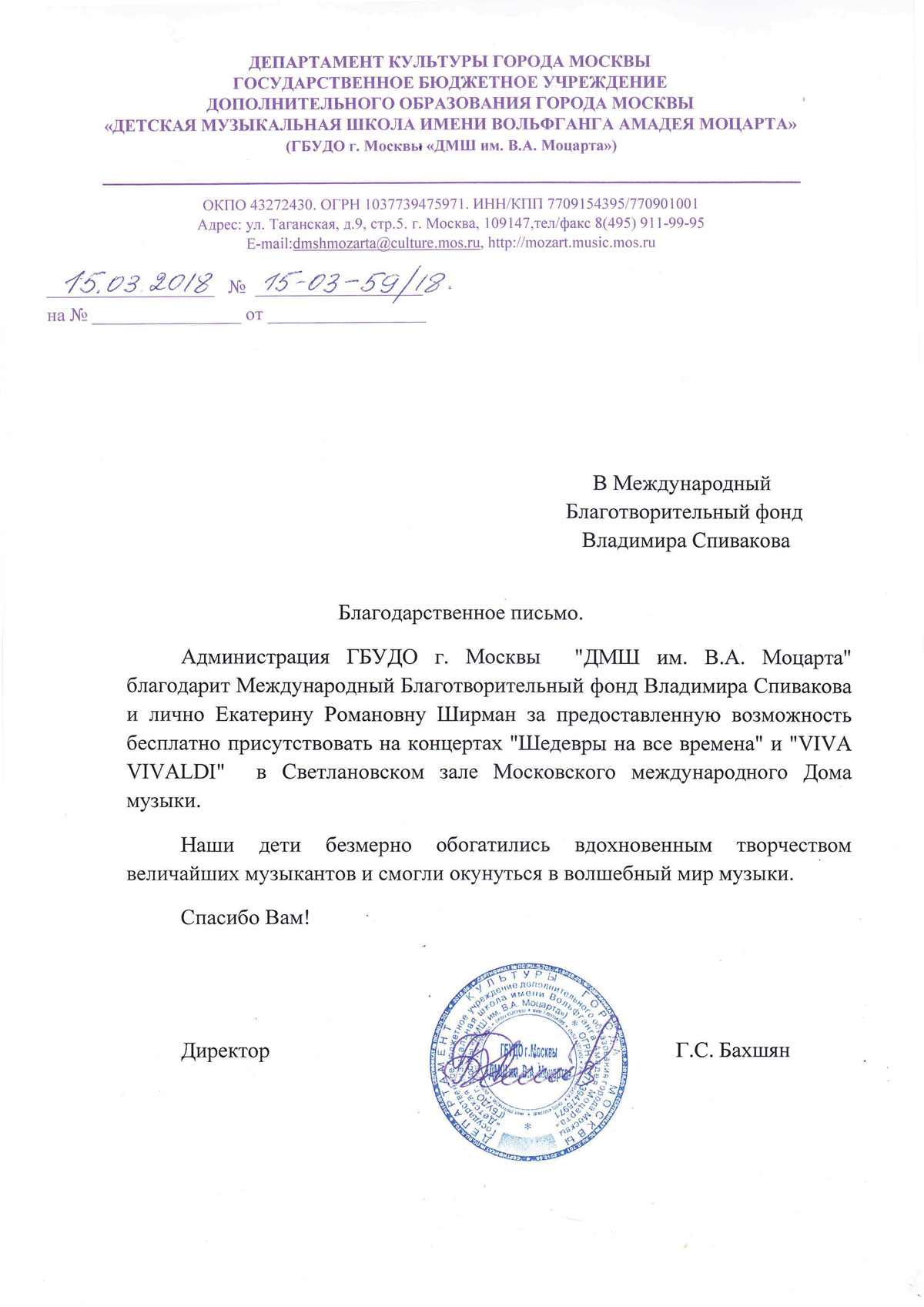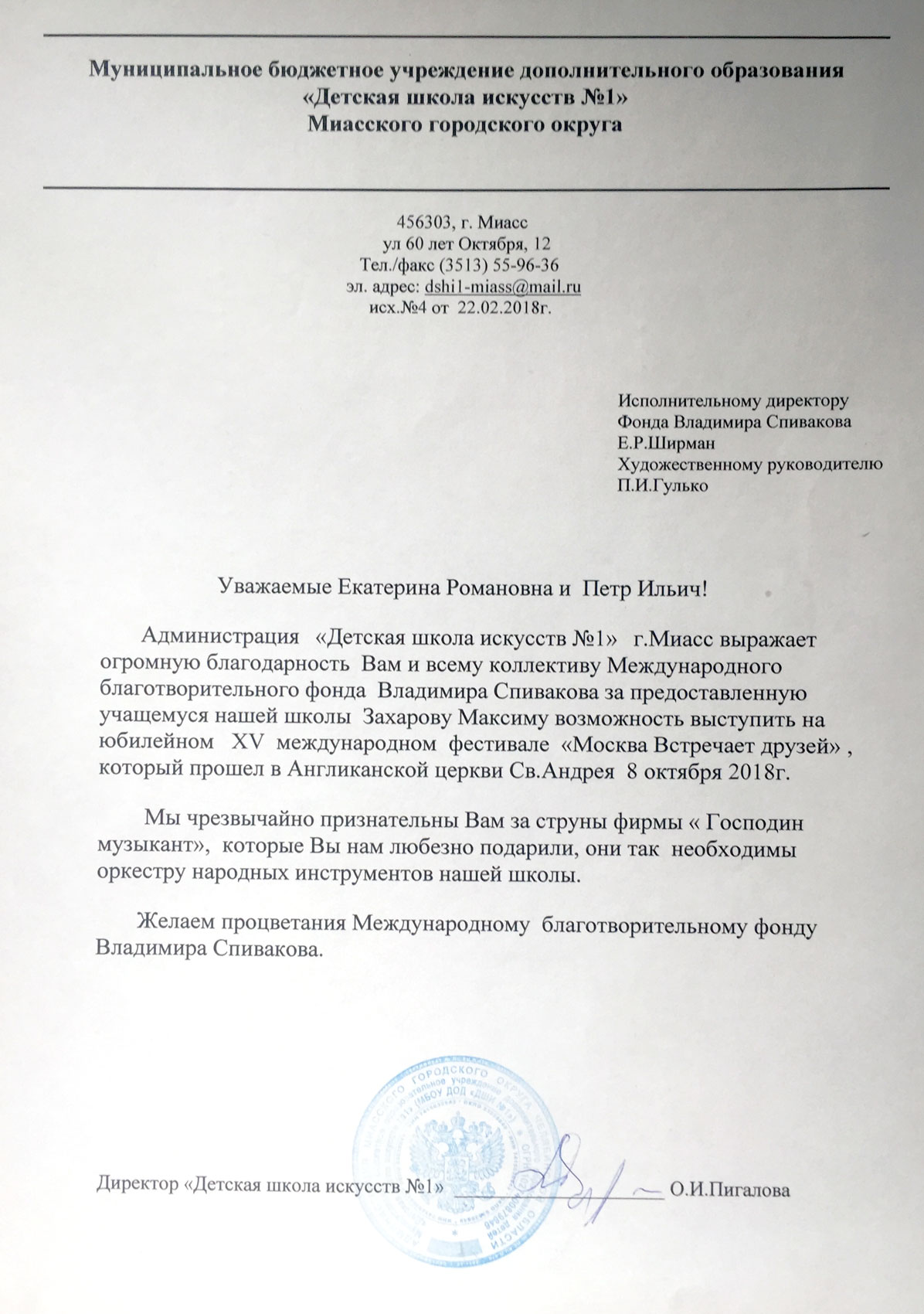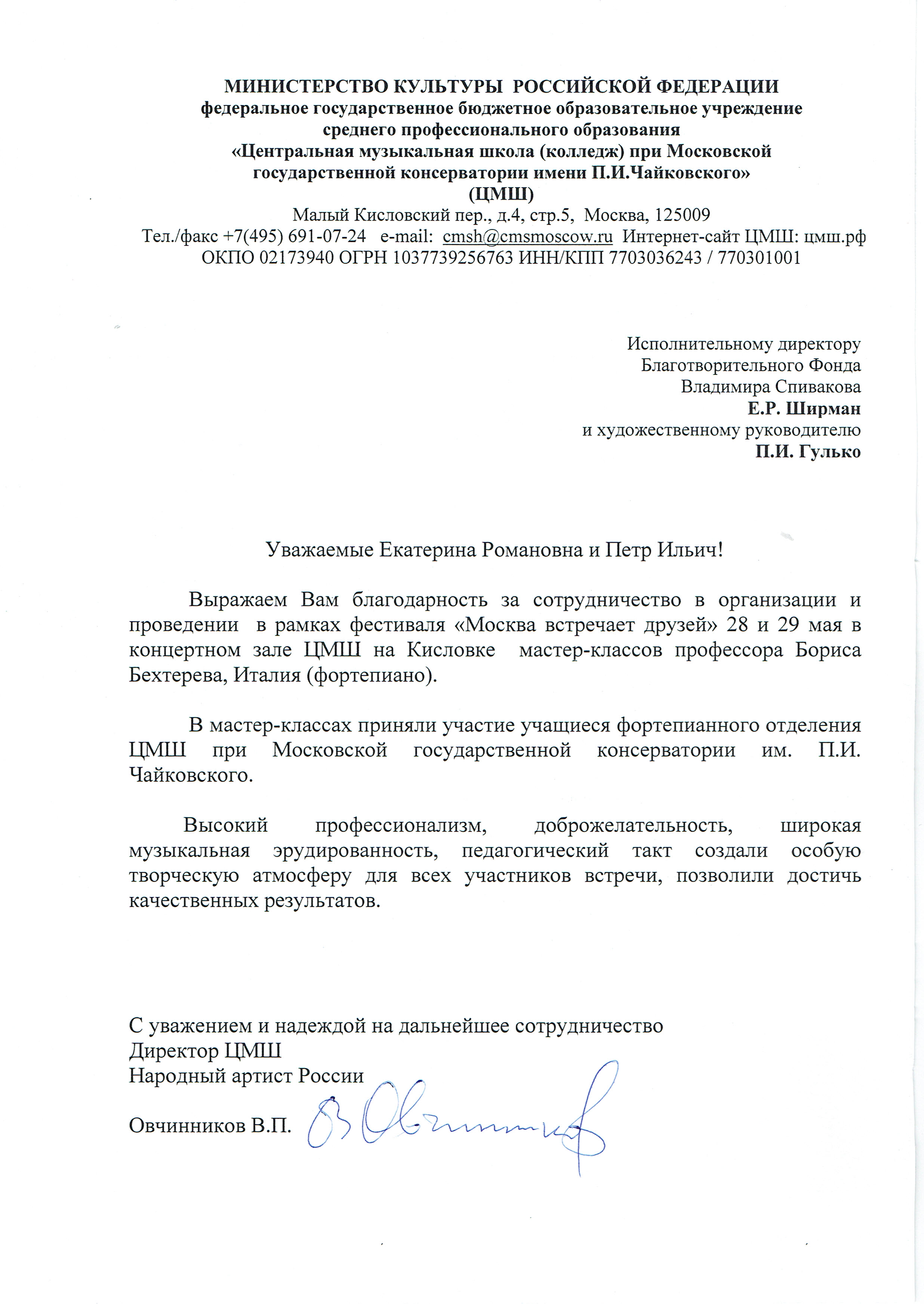Спасибо Вам и Международному благотворительному фонду В.Спивакова за организацию и поддержку таких замечательных проектов! С уважением и благодарностью,