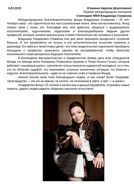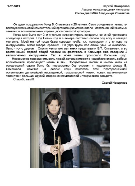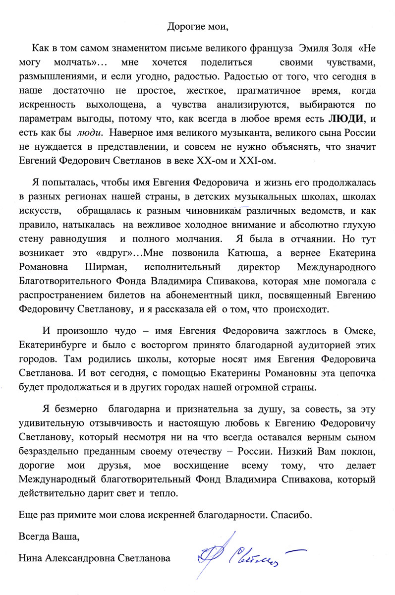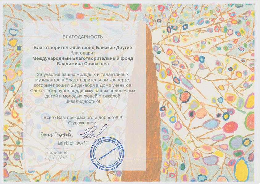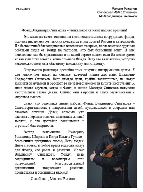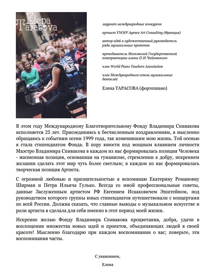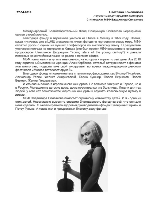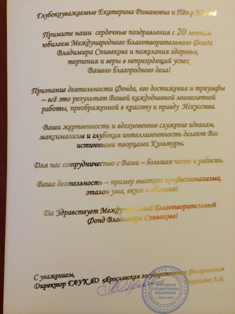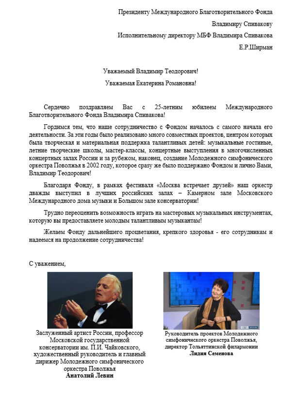 Хотим поблагодарить Вас за предоставленную возможность участия в концертной деятельности Международного Благотворительного фонда Владимира Спивакова.