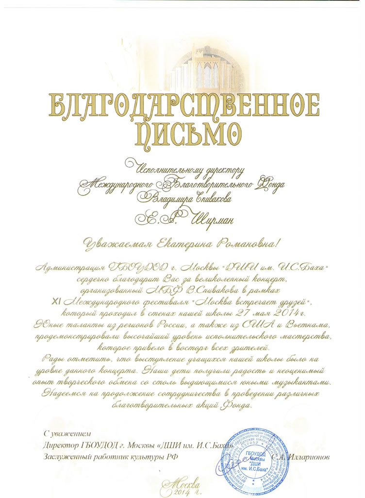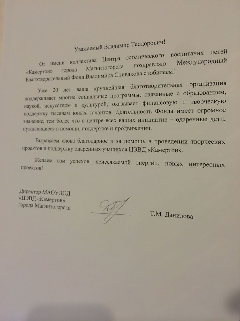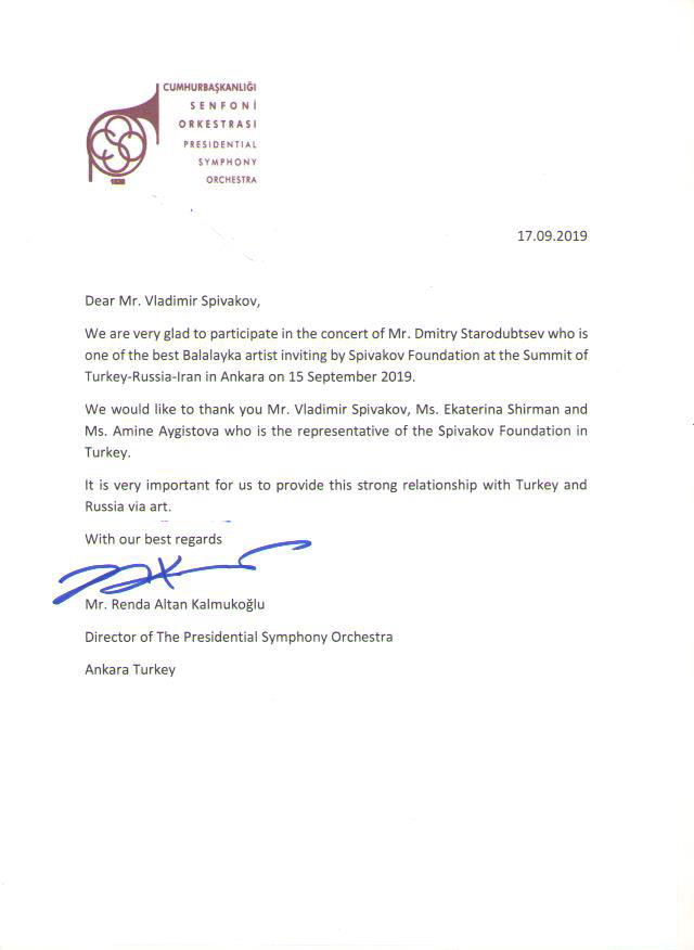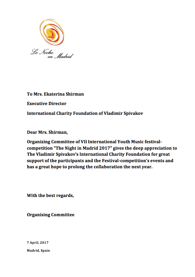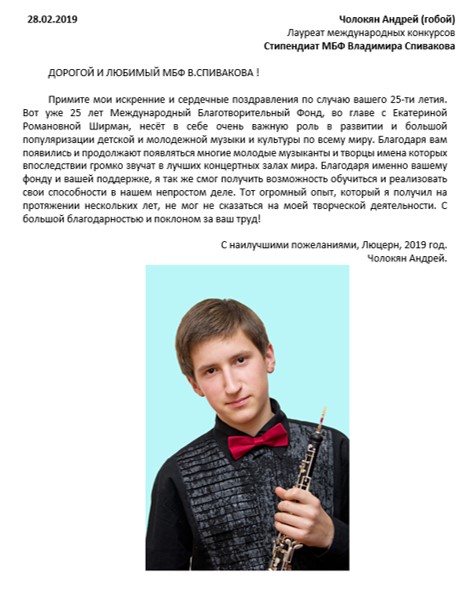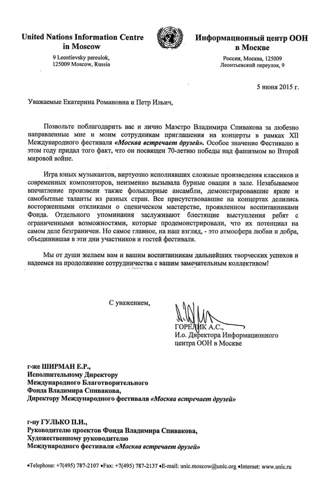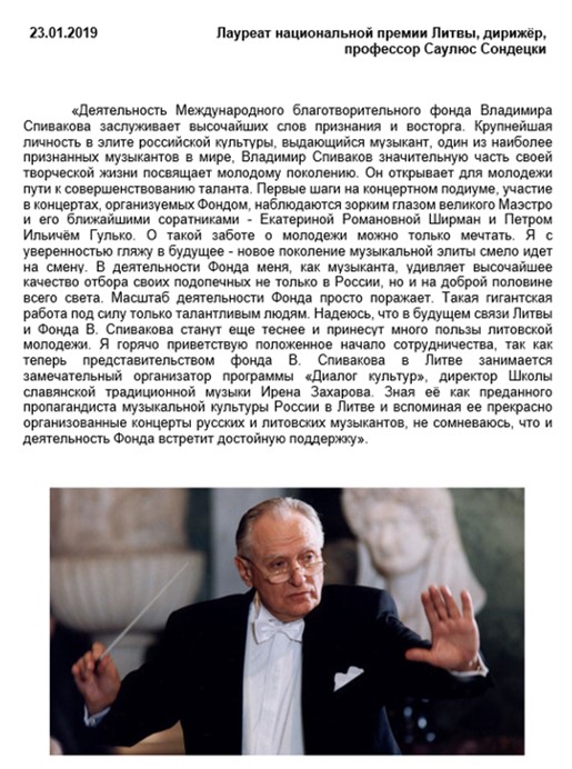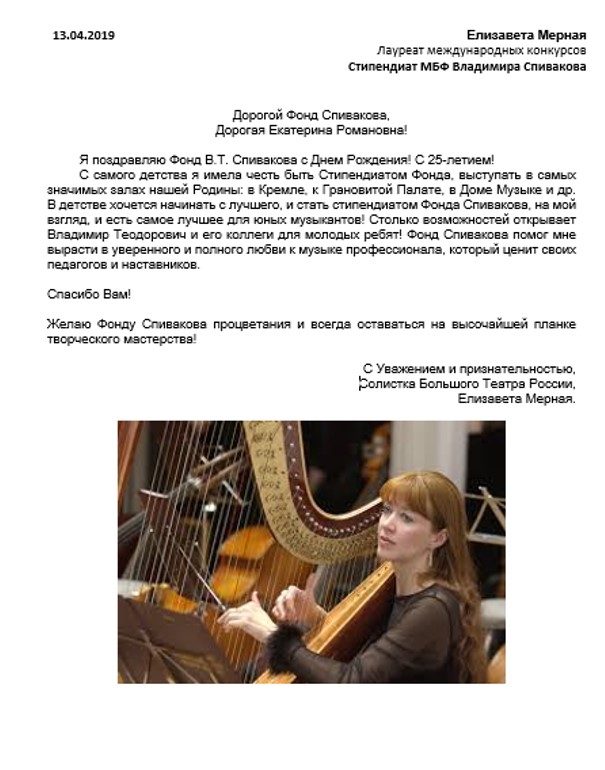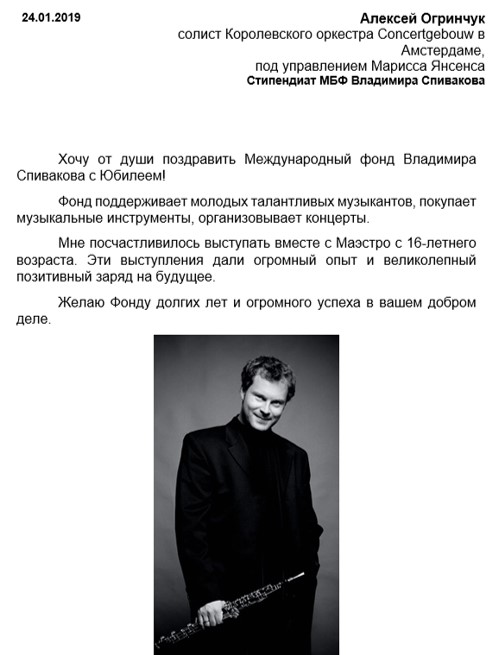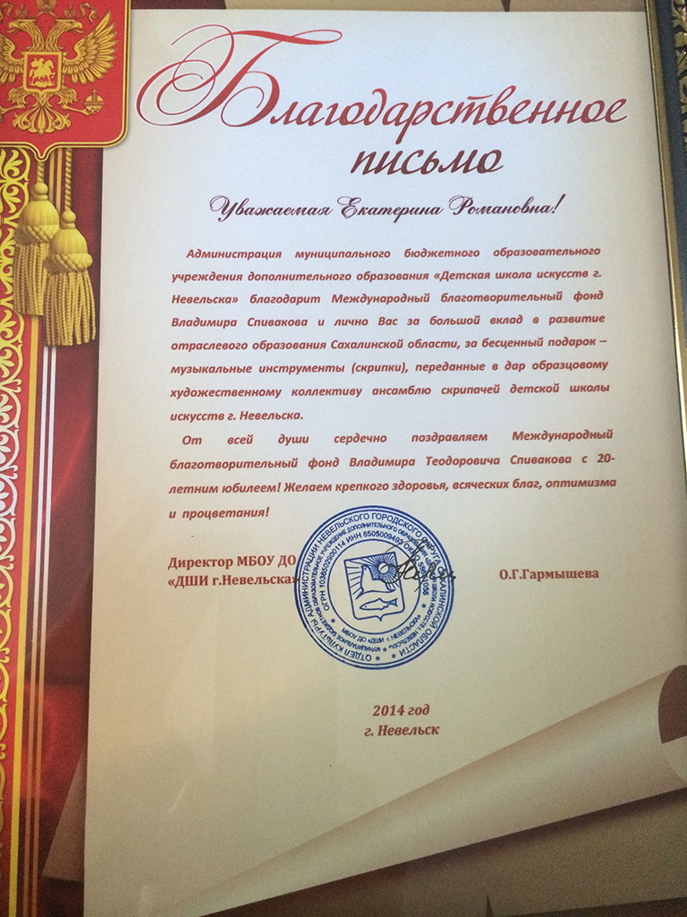 Хотим поблагодарить Вас за предоставленную возможность участия в концертной деятельности Международного Благотворительного фонда Владимира Спивакова.