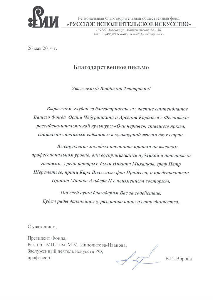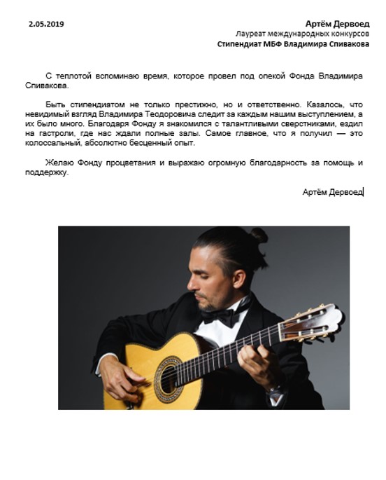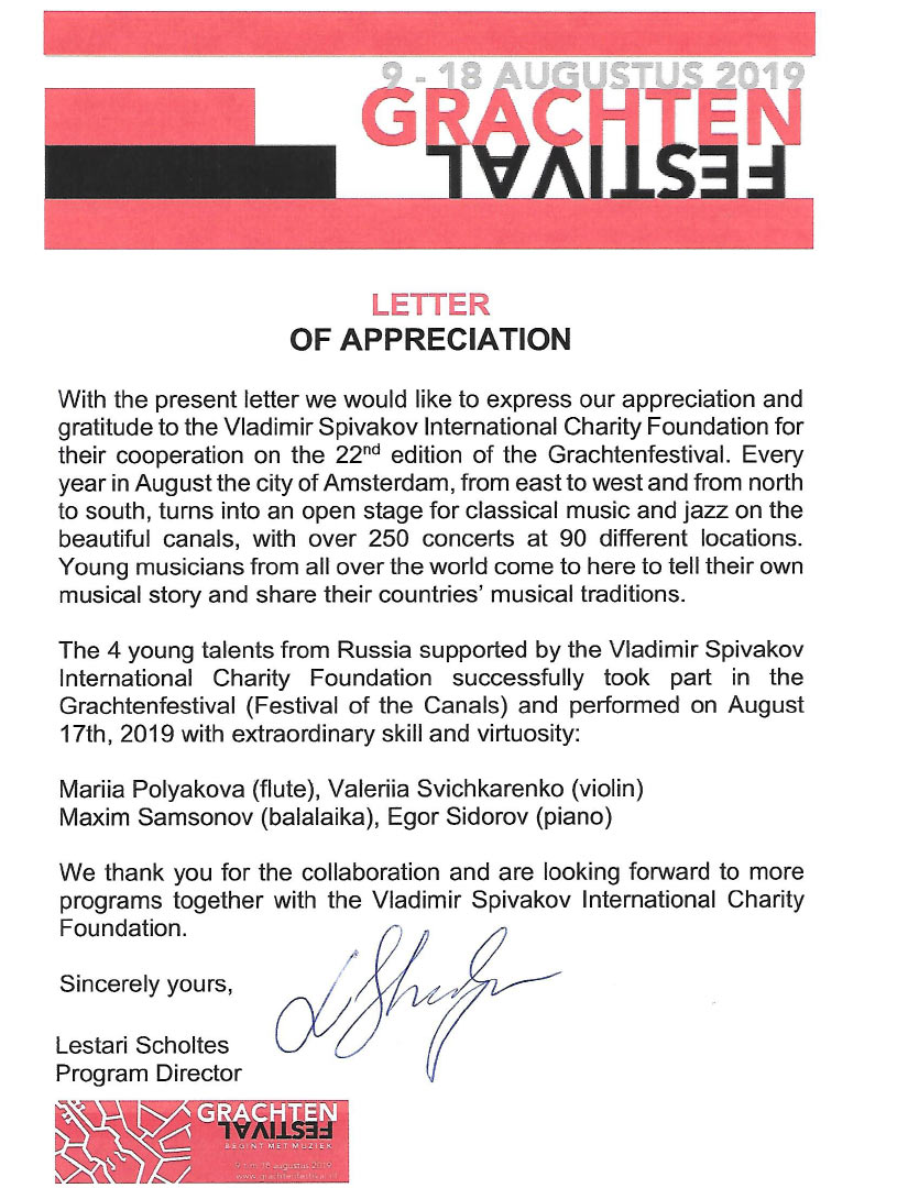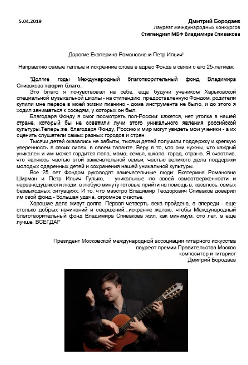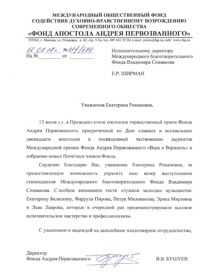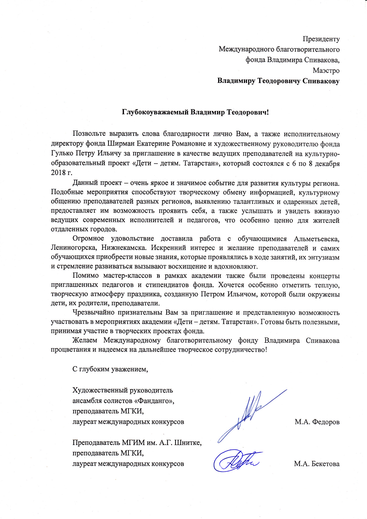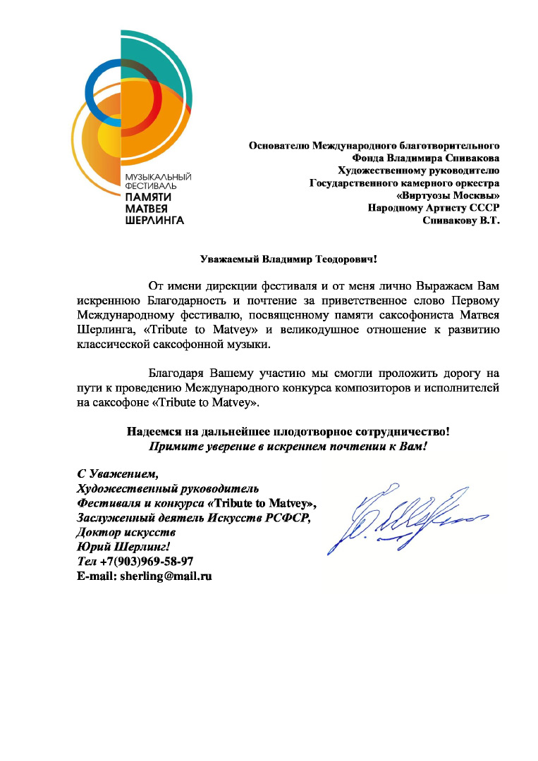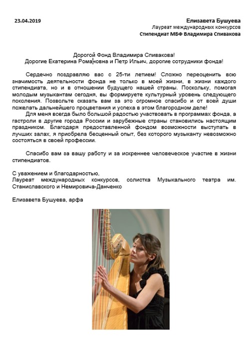 Хотим поблагодарить Вас за предоставленную возможность участия в концертной деятельности Международного Благотворительного фонда Владимира Спивакова.