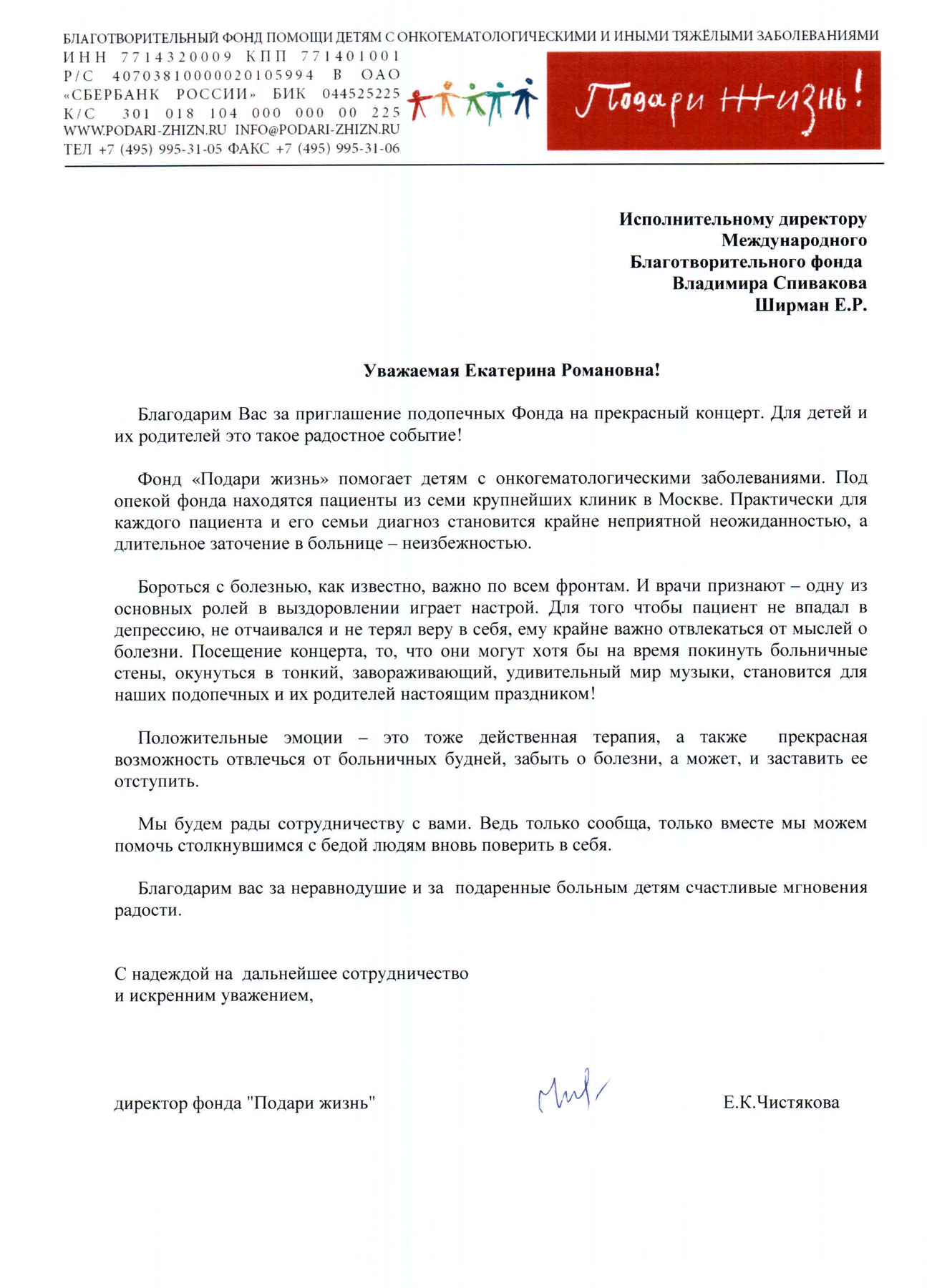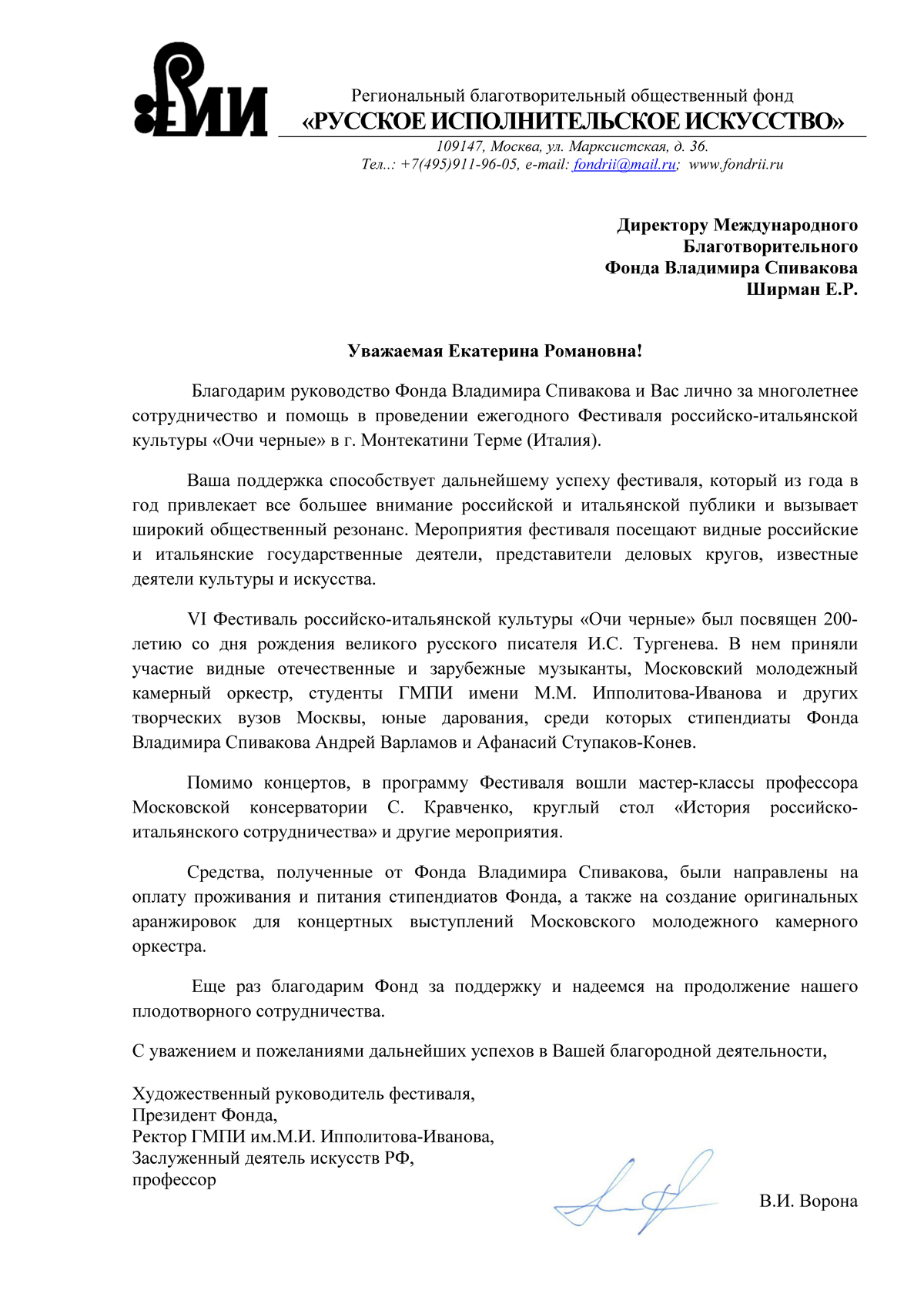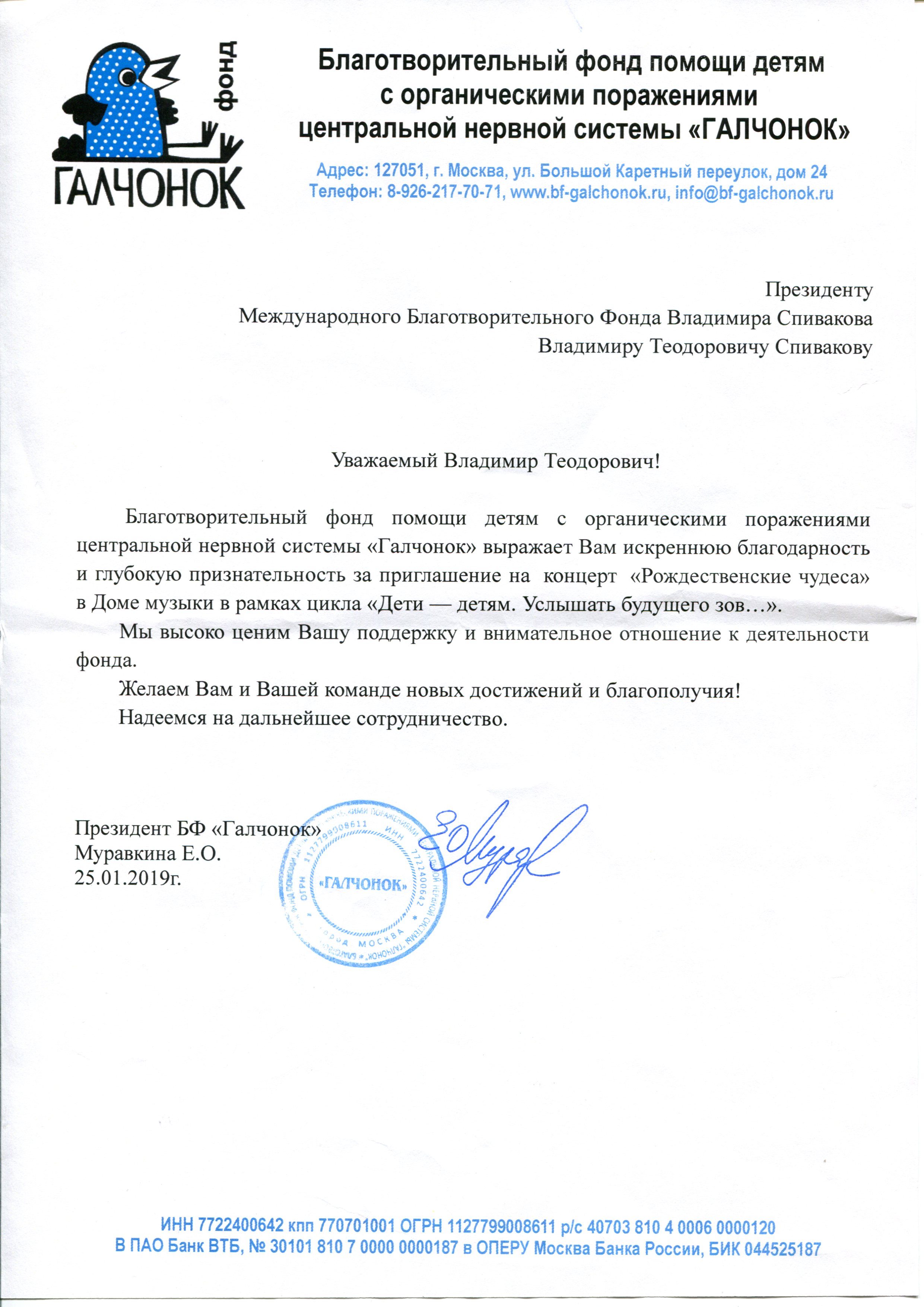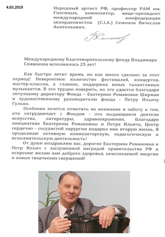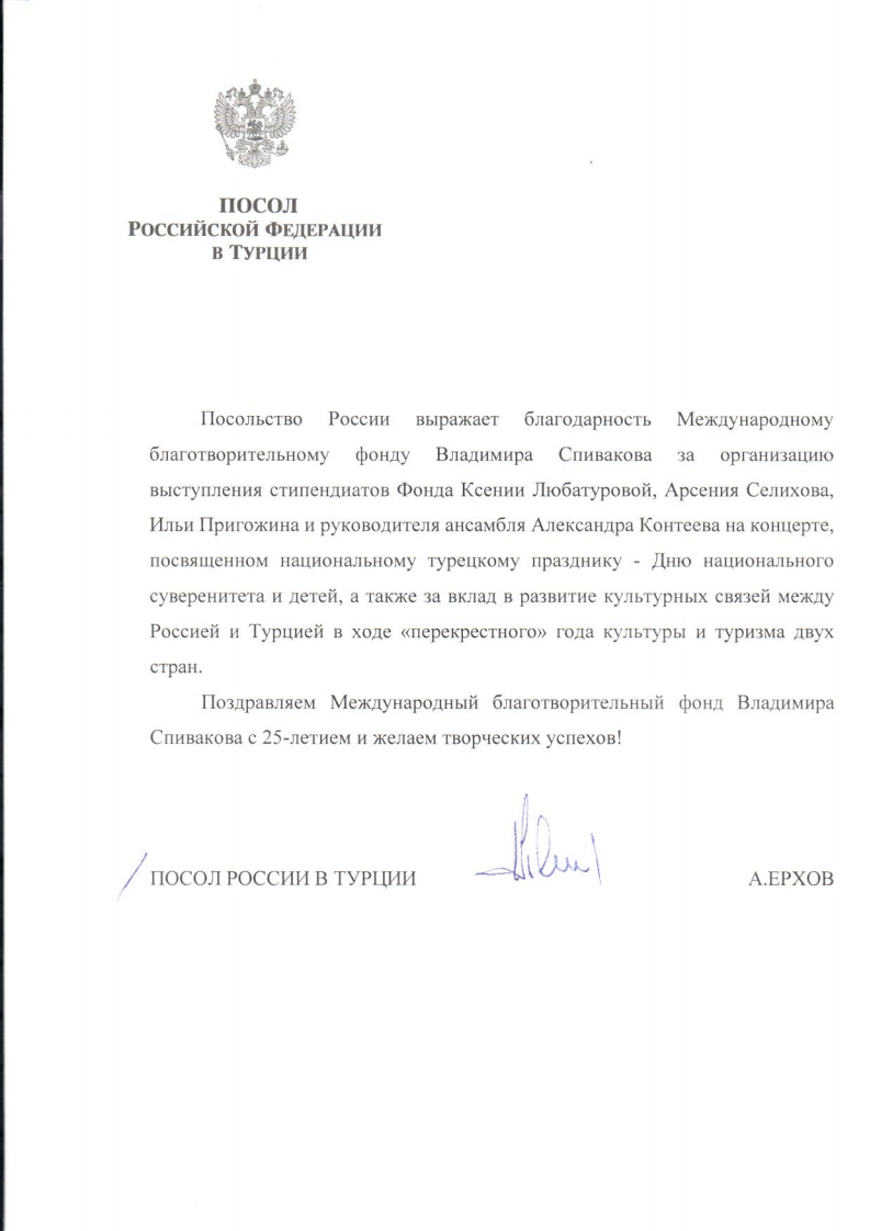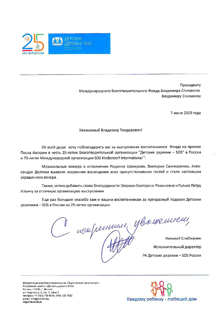 Хотим поблагодарить Вас за предоставленную возможность участия в концертной деятельности Международного Благотворительного фонда Владимира Спивакова.