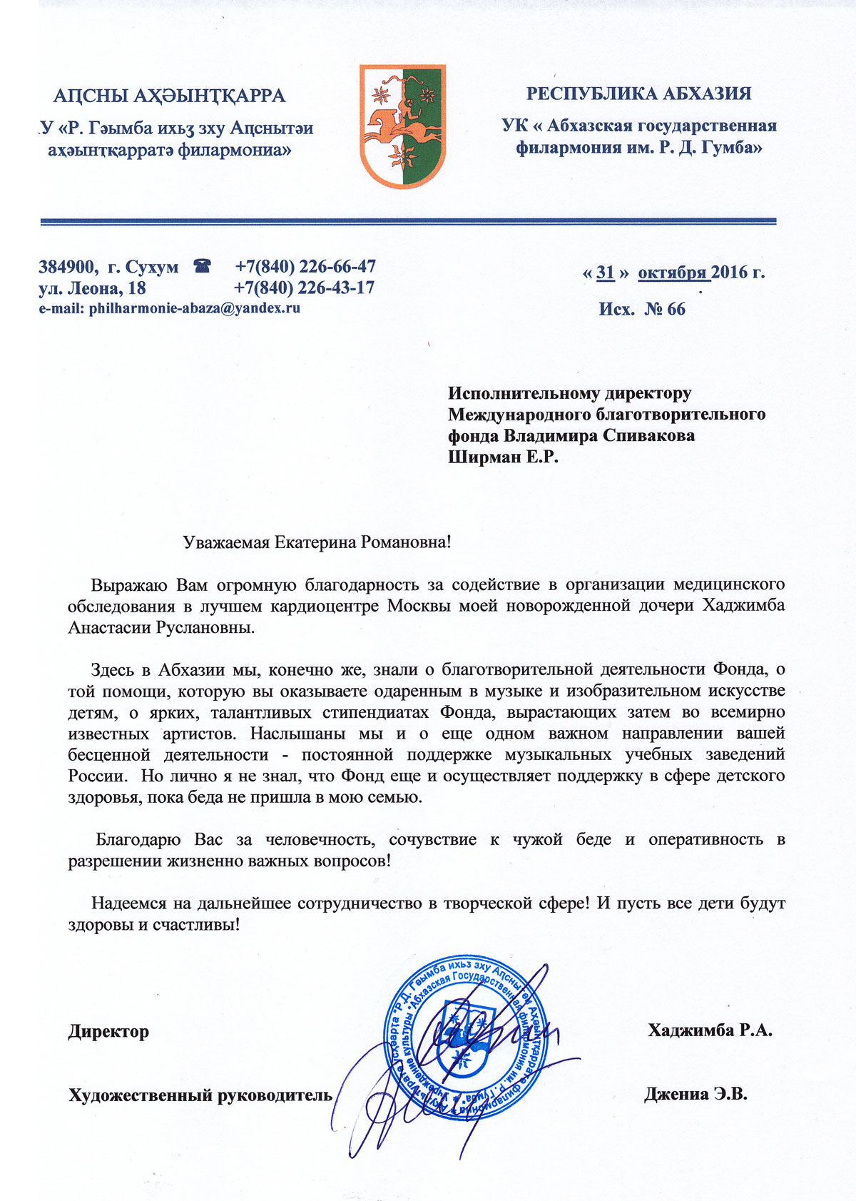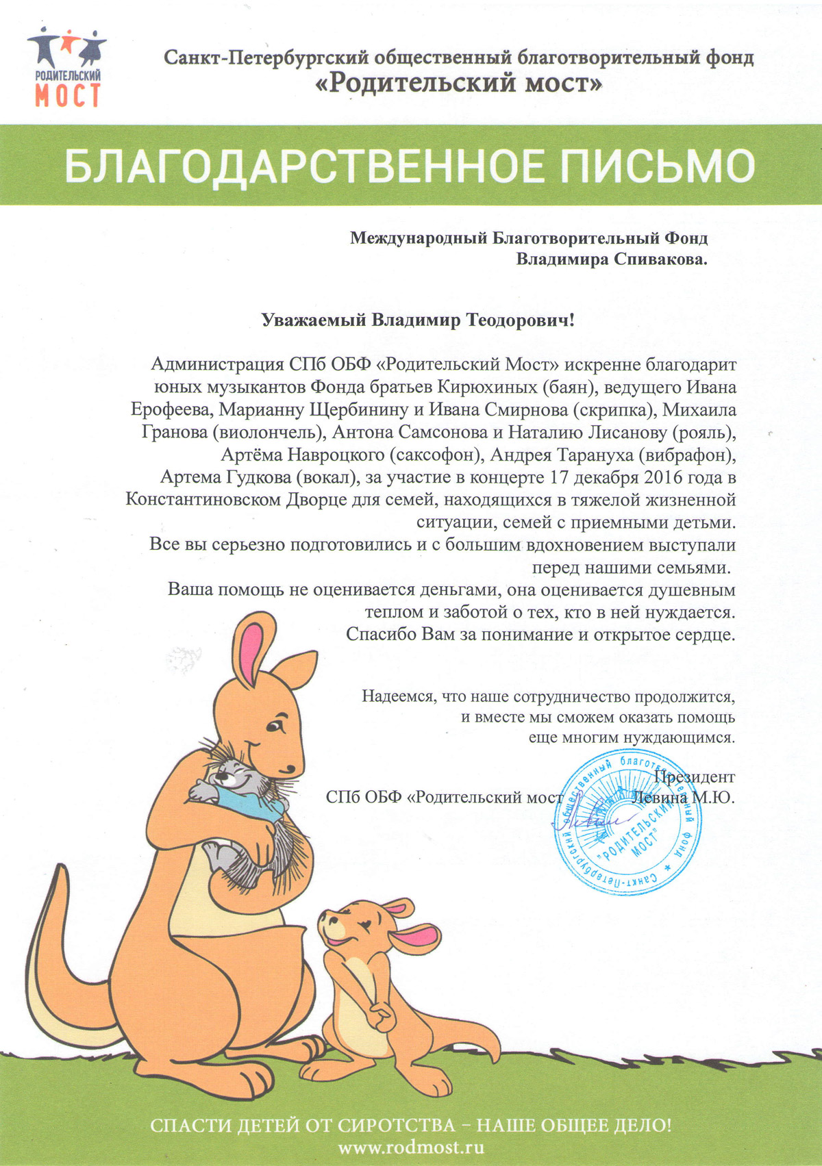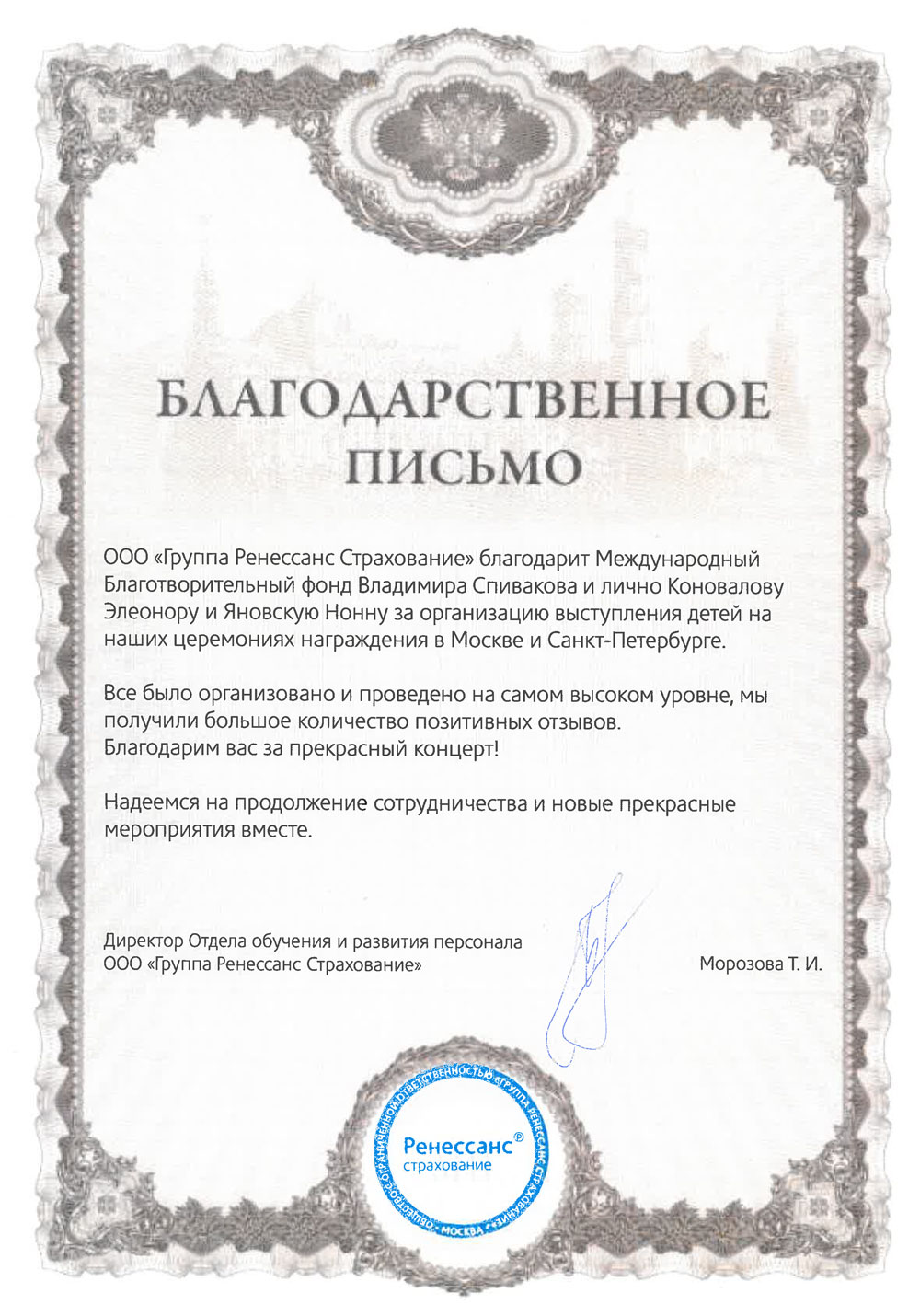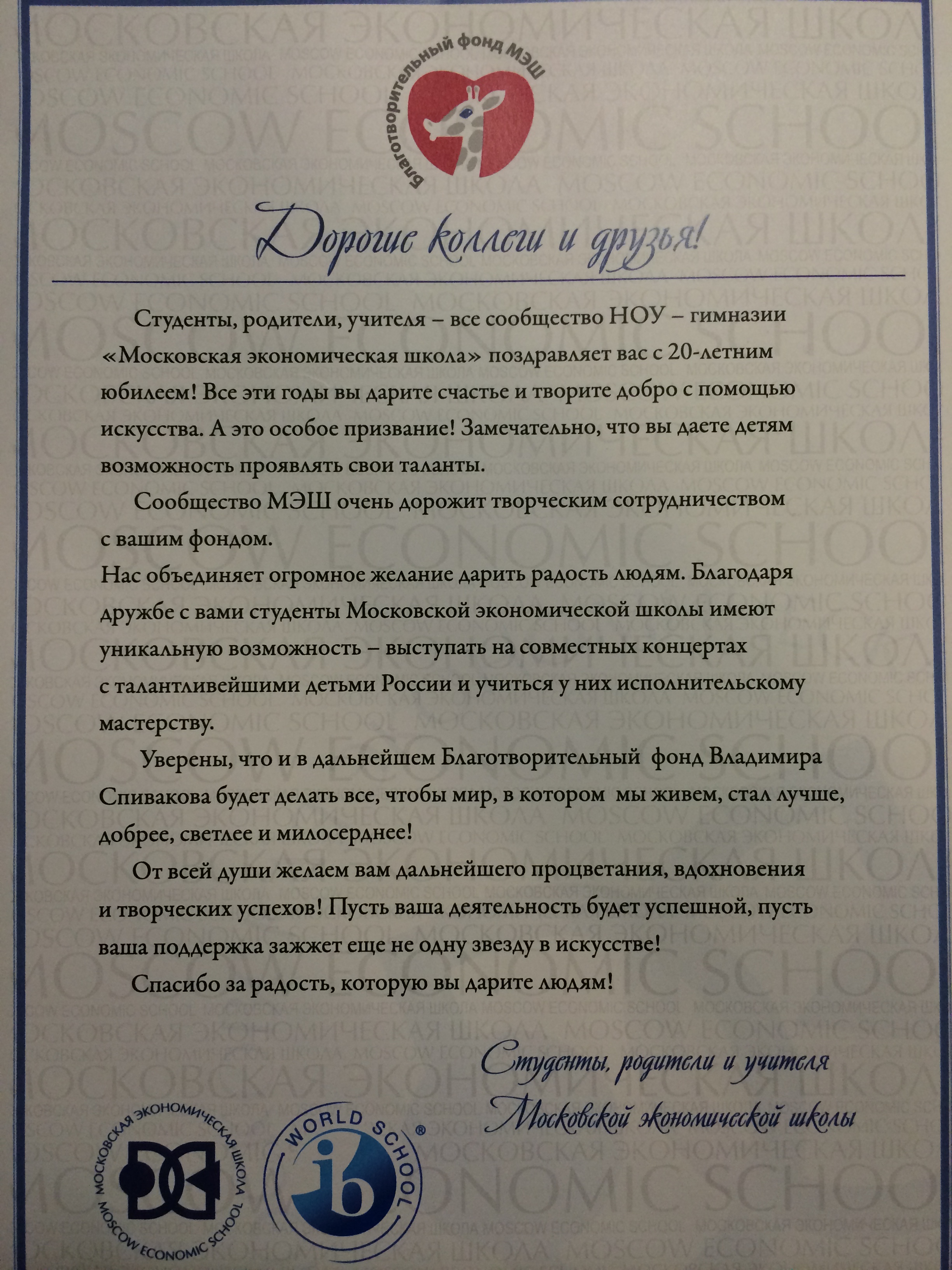 Хотим поблагодарить Вас за предоставленную возможность участия в концертной деятельности Международного Благотворительного фонда Владимира Спивакова.