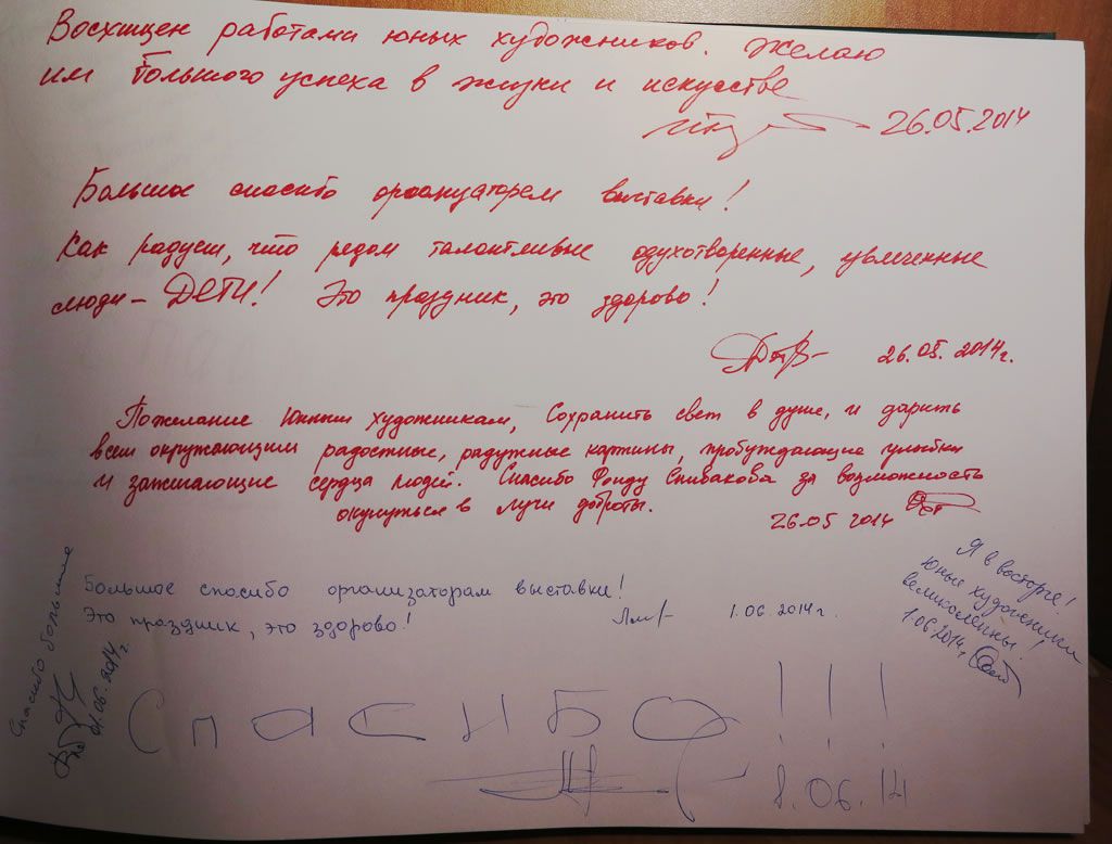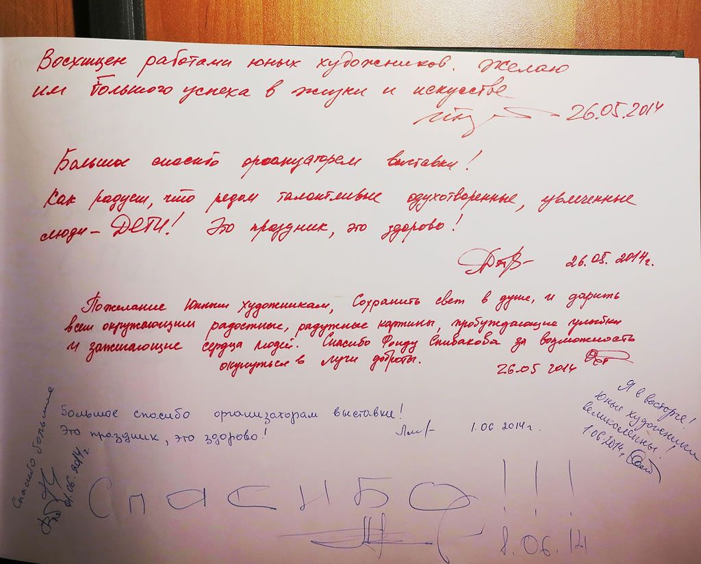 «Не знаю даже, как выразить Вам свою признательность и какими словами благодарности!!! Спасибо огромное за все: возможность участия в фестивале, за Ваше приглашение и за очень четкую оперативную работу! Снимки чудесные, очень приятно за моих подопечных, в каких чудесных залах находились их милые работы! Нельзя не отметить значимость фестиваля и самого фонда!»