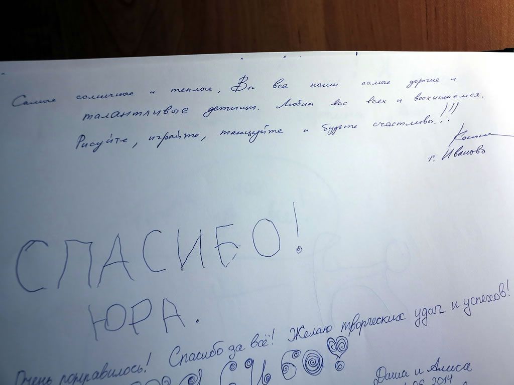 Благодарим Вас за все те возможности и все горизонты, которые, приоткрывая занавес, Вы показываете нашим детям, тем самым говоря: «Смотри! Это всё может быть и у тебя! Только надо немного постараться, потрудиться на благо Музыки, заниматься, учиться, расти – и всё это у тебя рано или поздно появится. Ведь я смог. Сможешь и ты.»