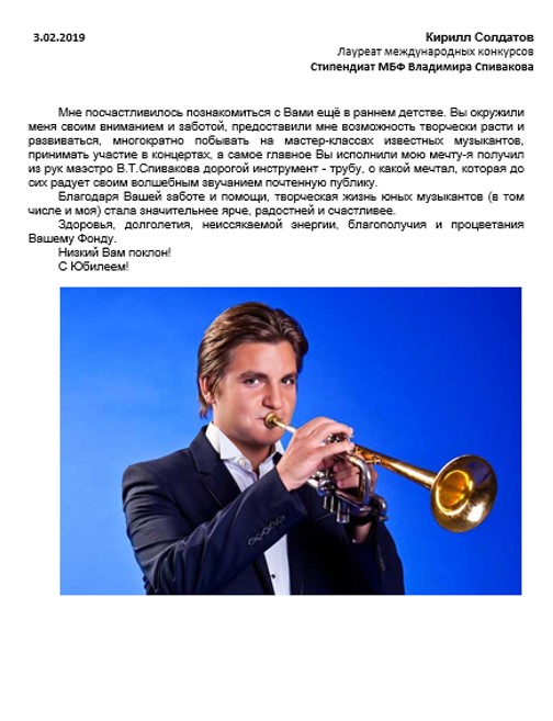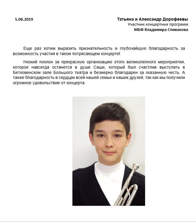 Примите слова сердечной благодарности — сбылась мечта нашего сына Матвея Блюмина увидеть и услышать скрипача и дирижера Владимира Спивакова и его оркестр «Виртуозы Москвы». Он стал участником великолепного проекта МБФ — Международного фестиваля «Москва встречает друзей»