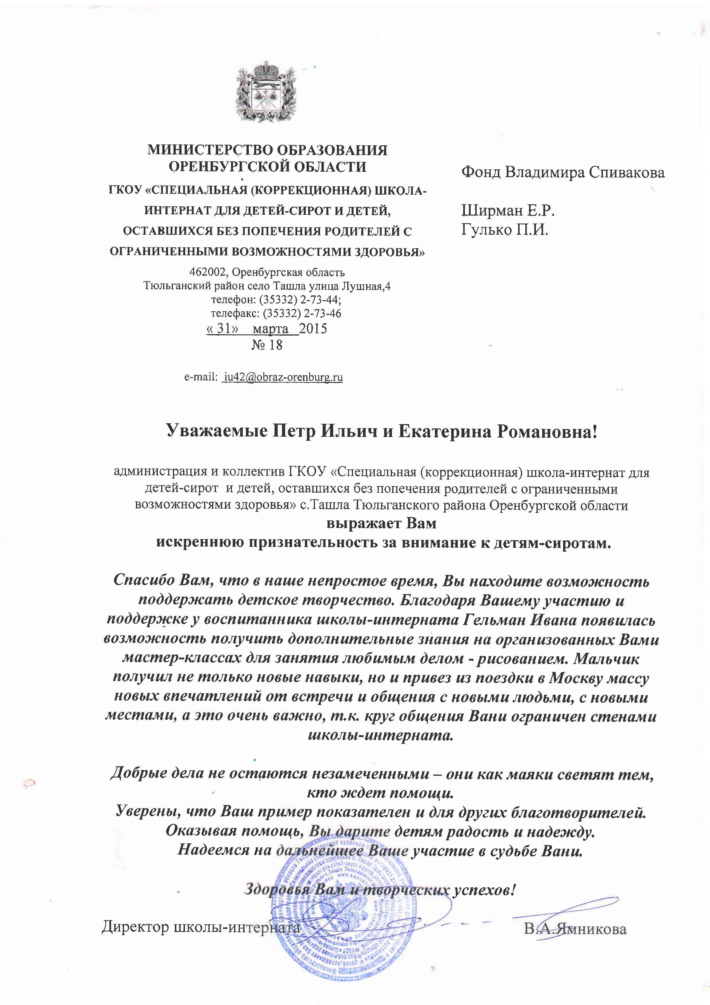 Спасибо большое Вам, Владимиру Теодоровичу и всем сотрудникам Фонда за то настоящее,доброе,что Вы делаете! Вы пробуждаете в людях, в детях самые лучшие чувства. Заставляете мыслить широко, глобально.