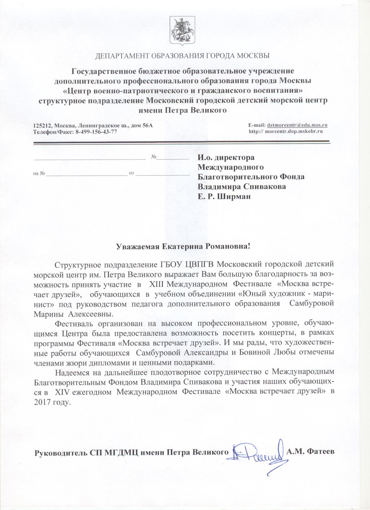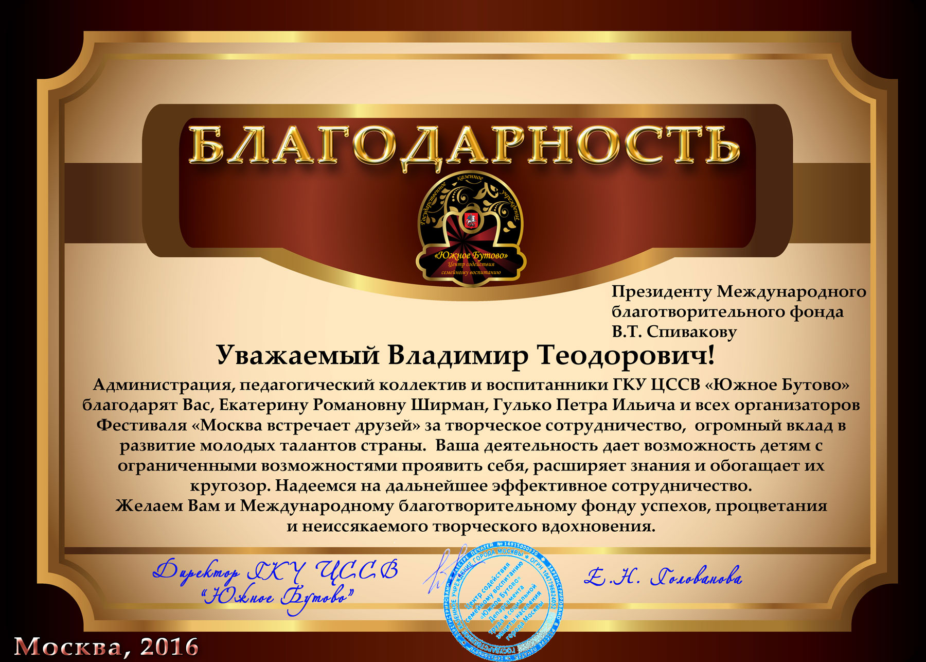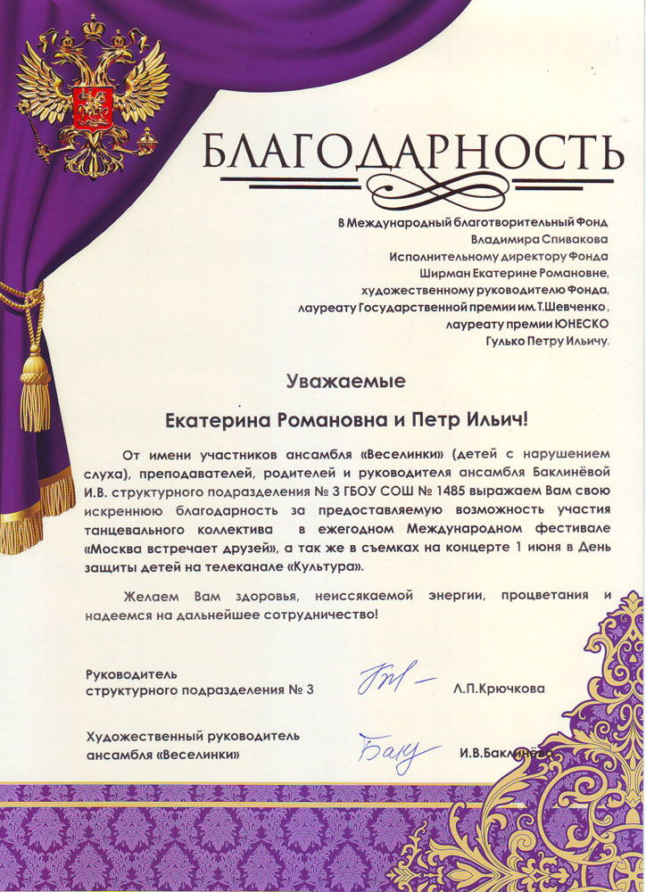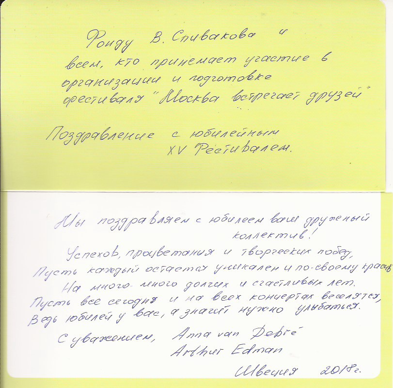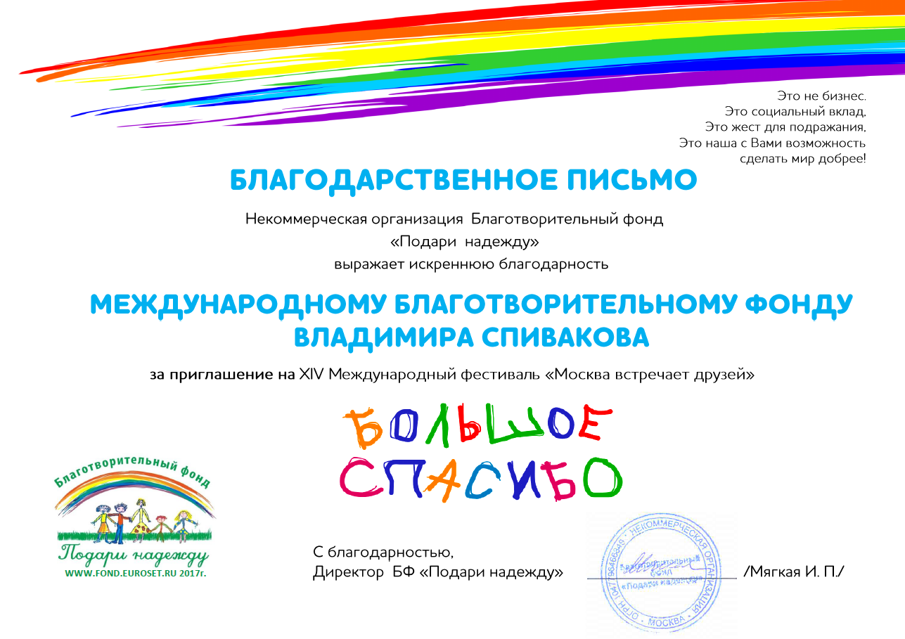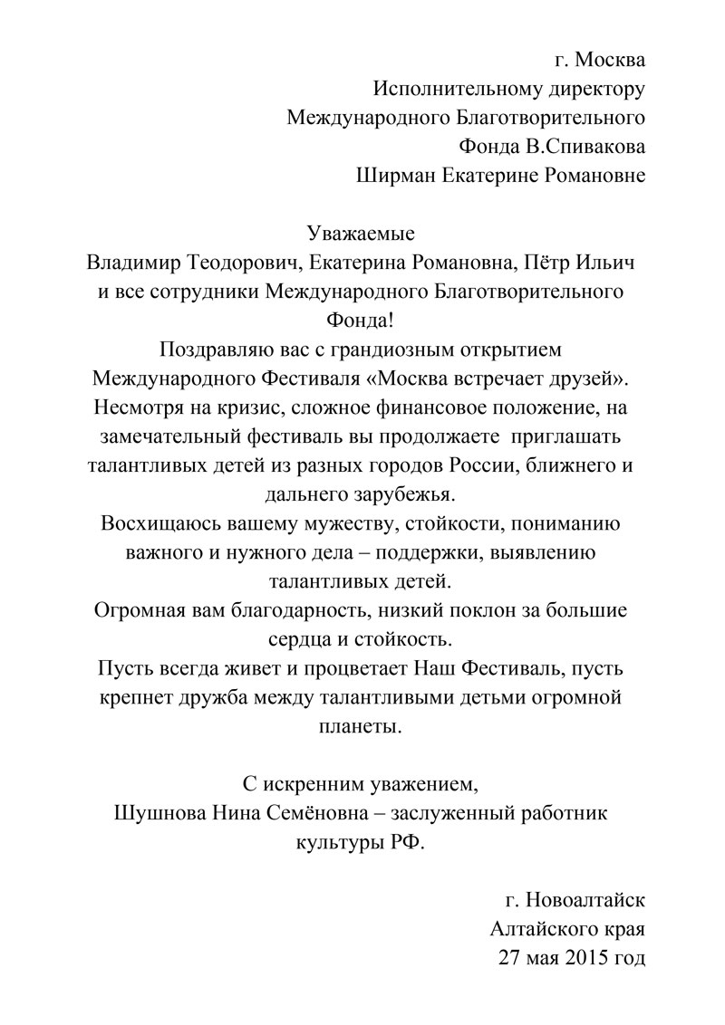 Выражаем Вам и работникам (консультантам, помощникам) Фонда огромную благодарность за организацию и проведение грандиозного мероприятия фестиваля «Москва встречает друзей», за то искренние внимание и участие к каждому и непосредственно к нам.
