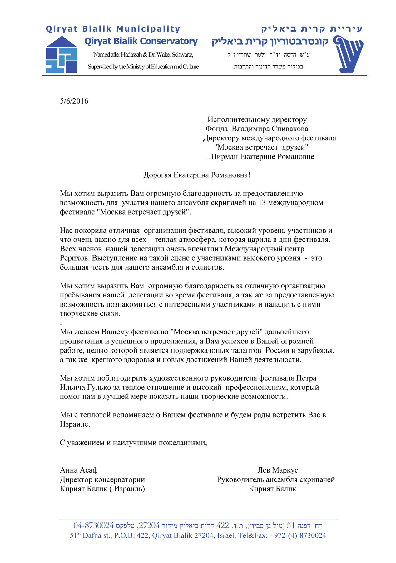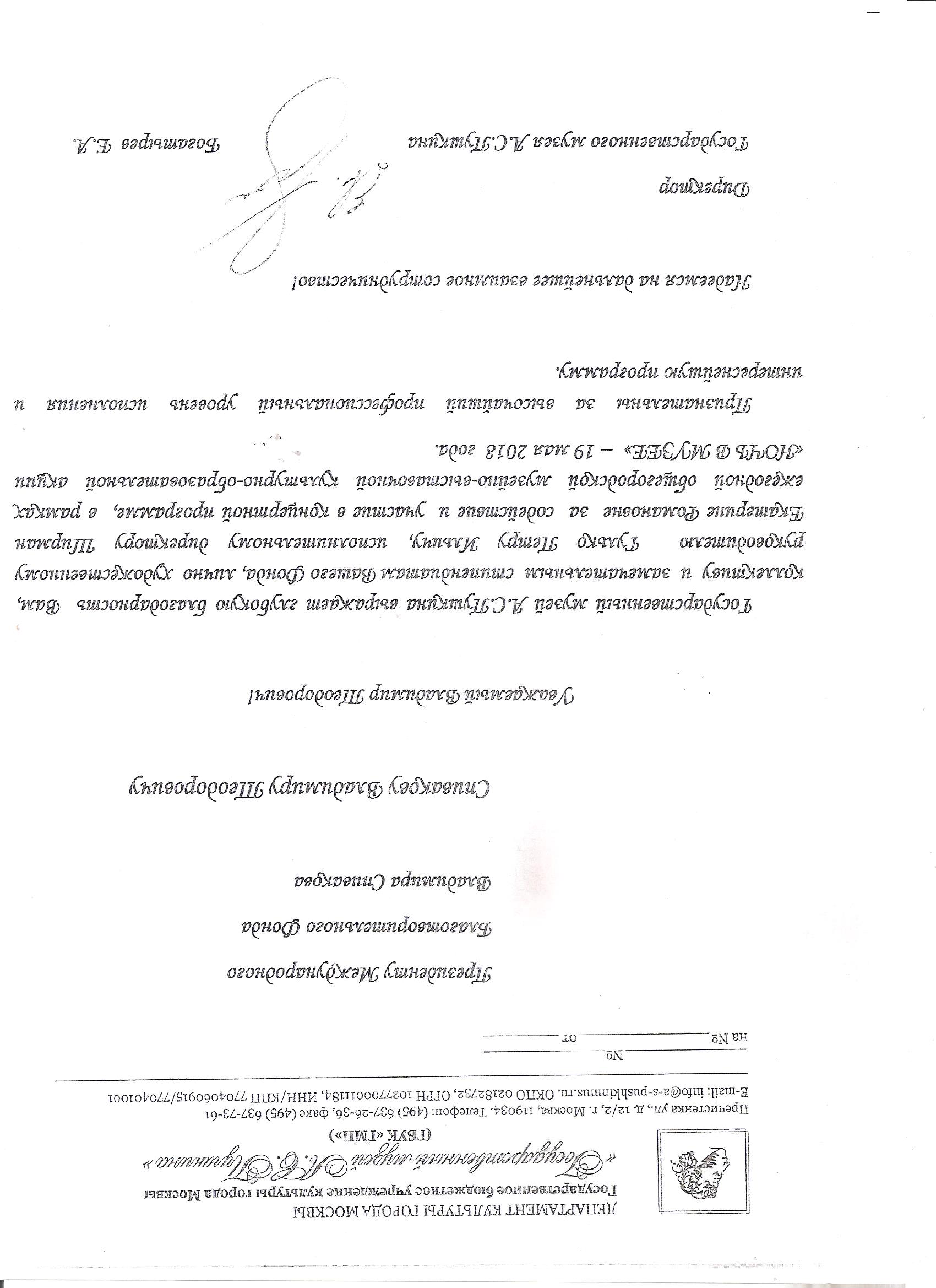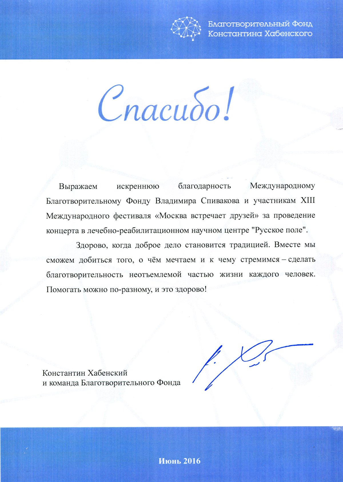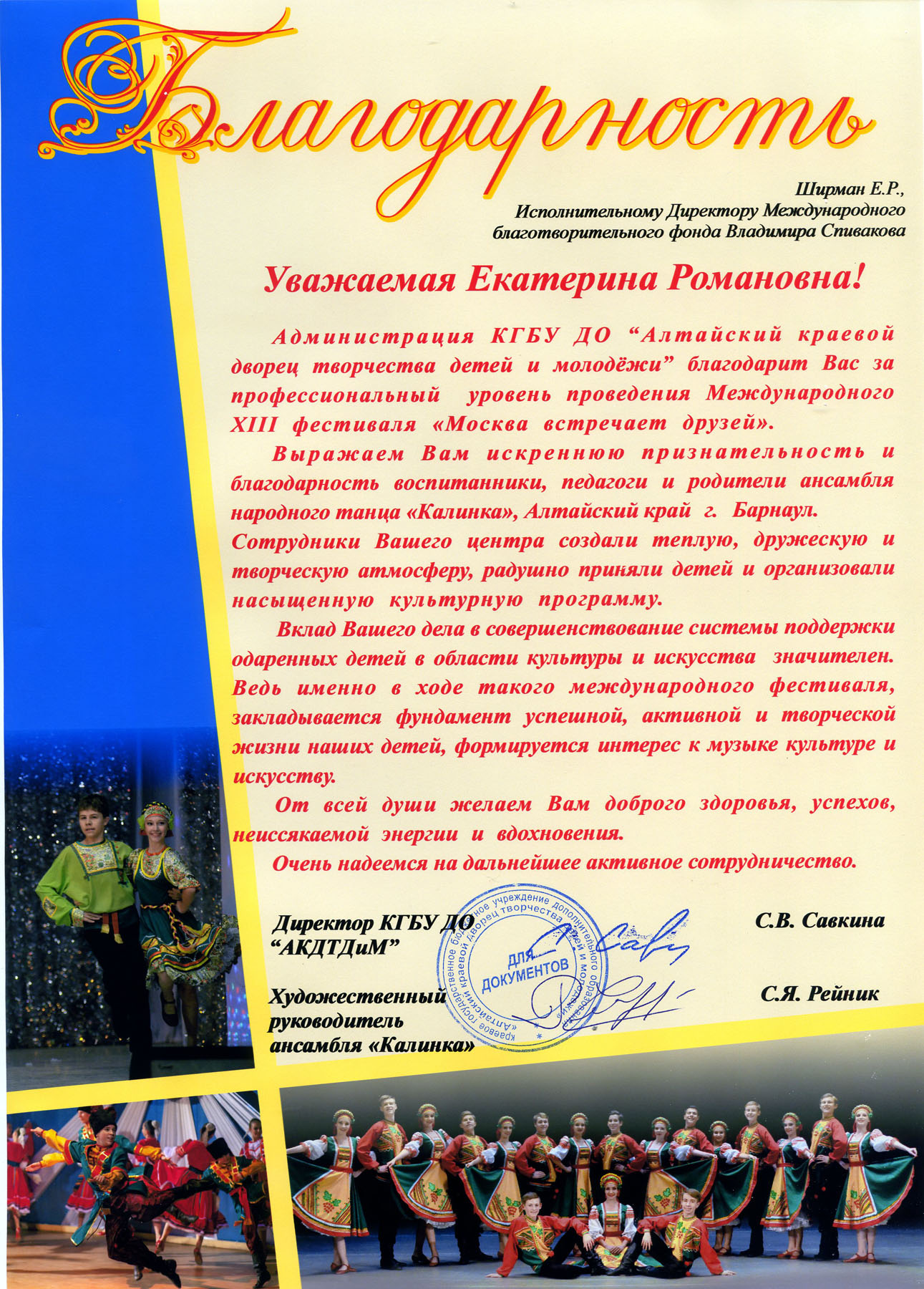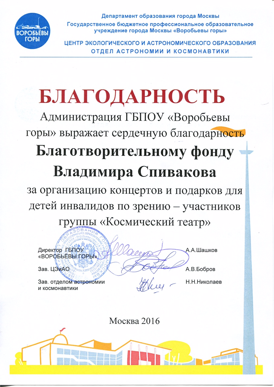 Выражаем Вам и работникам (консультантам, помощникам) Фонда огромную благодарность за организацию и проведение грандиозного мероприятия фестиваля «Москва встречает друзей», за то искренние внимание и участие к каждому и непосредственно к нам.