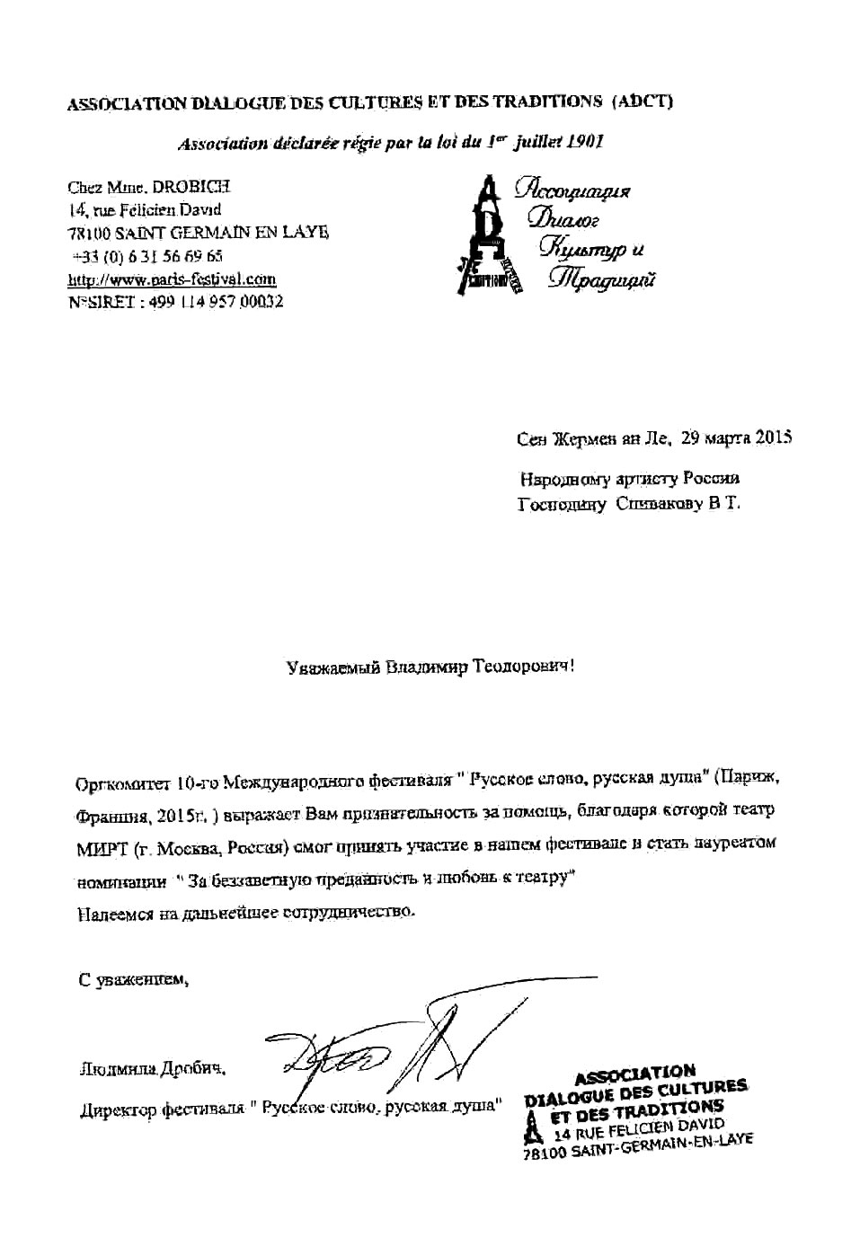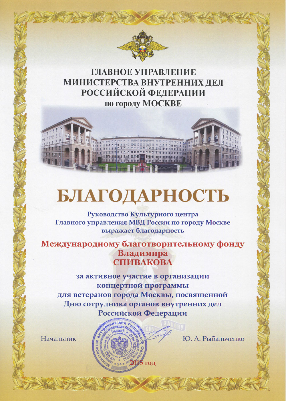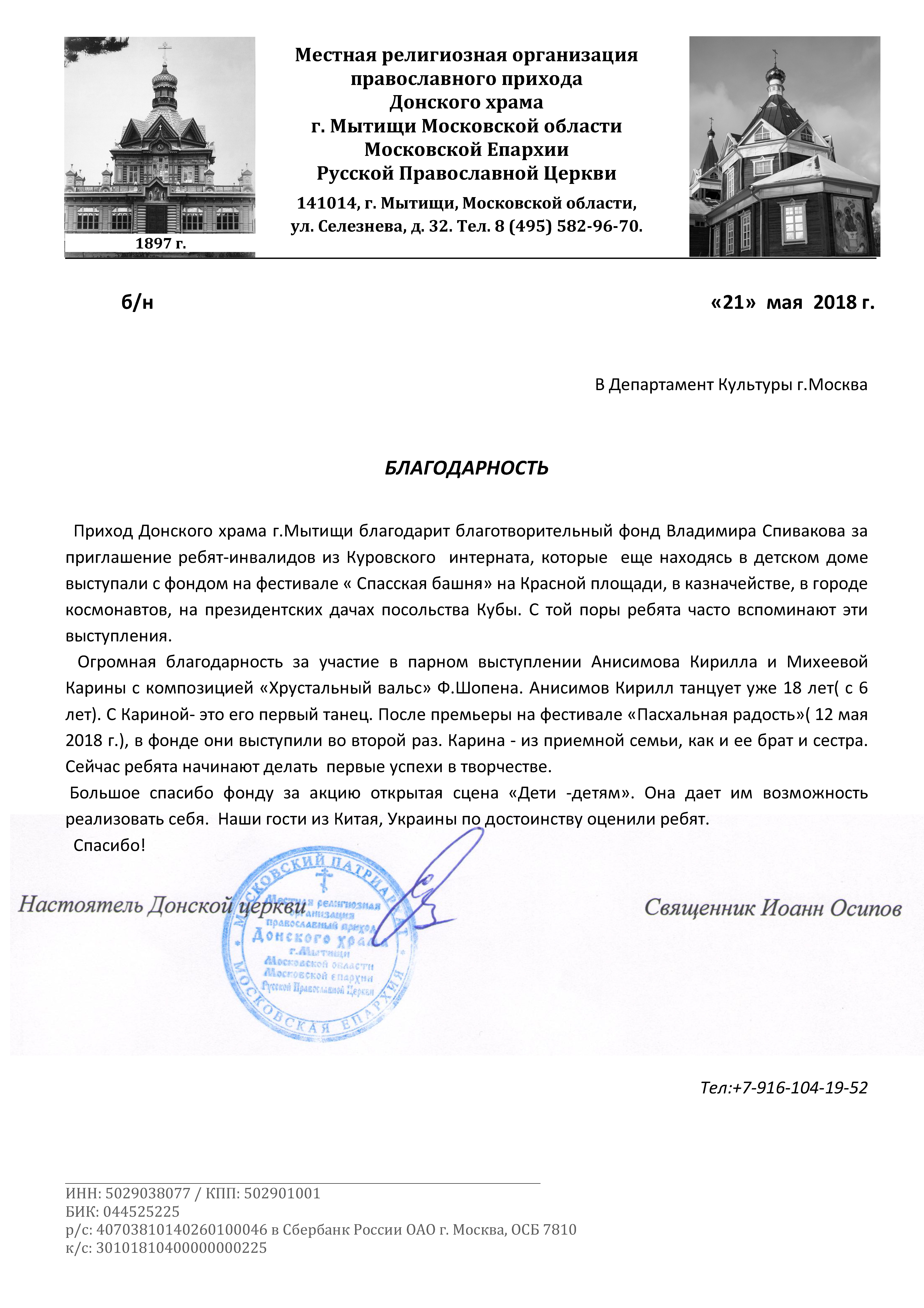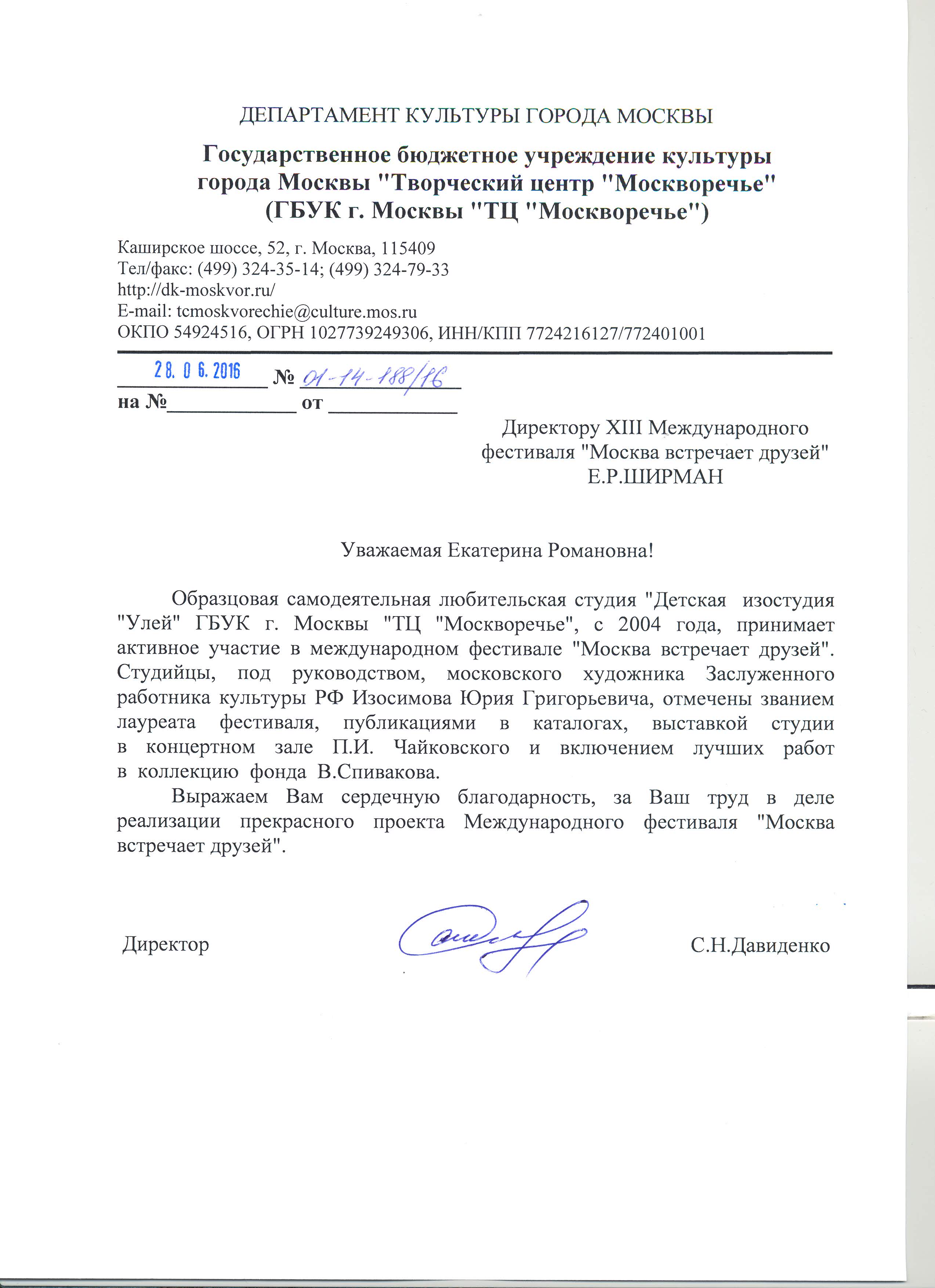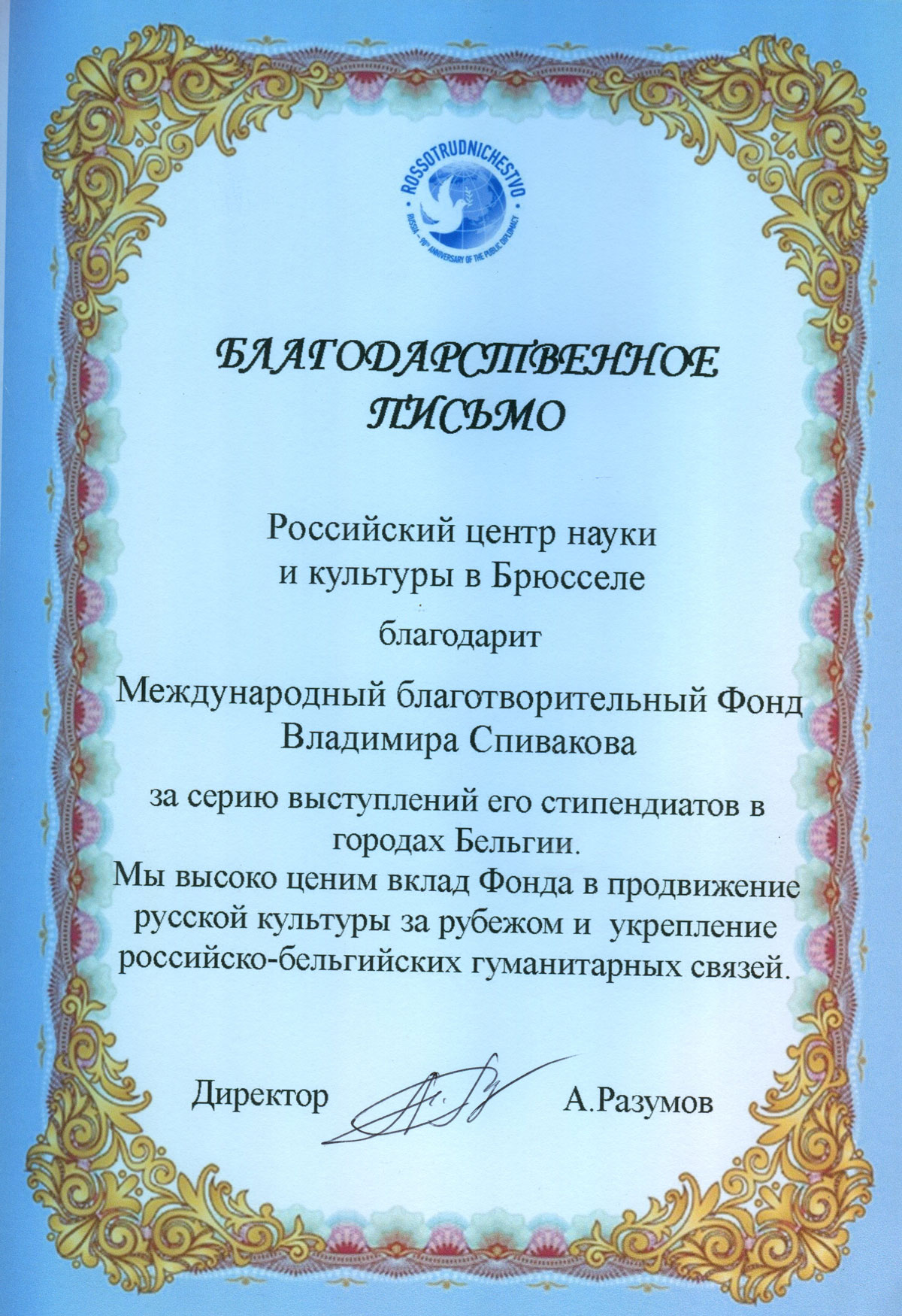 Выражаем Вам и работникам (консультантам, помощникам) Фонда огромную благодарность за организацию и проведение грандиозного мероприятия фестиваля «Москва встречает друзей», за то искренние внимание и участие к каждому и непосредственно к нам.