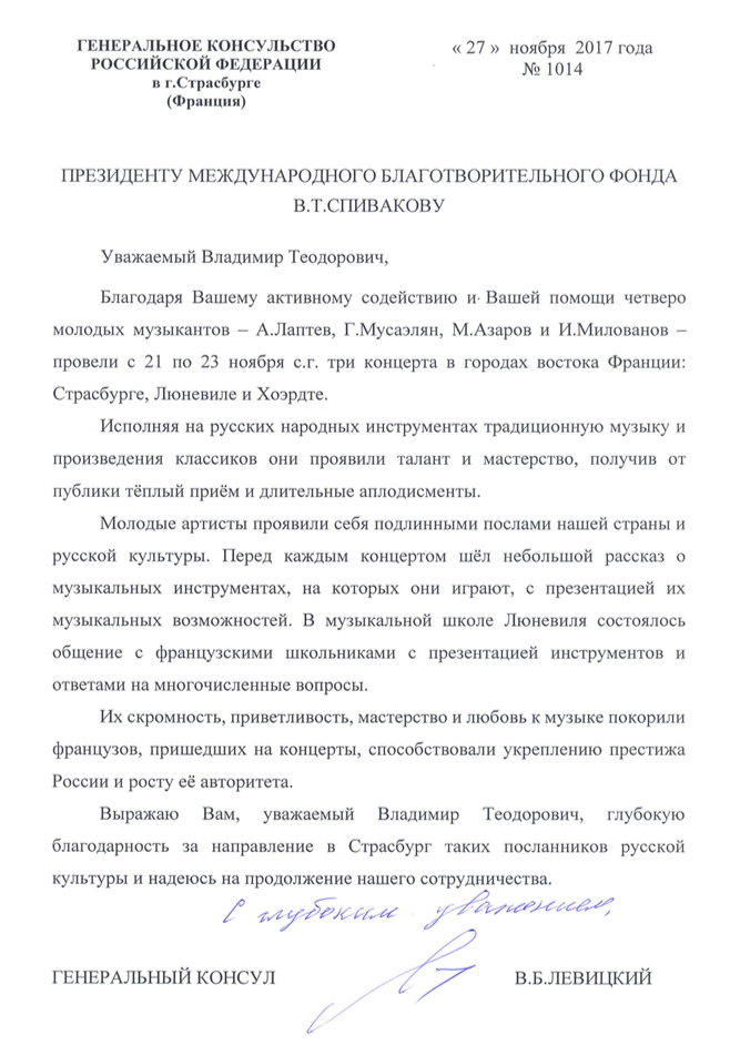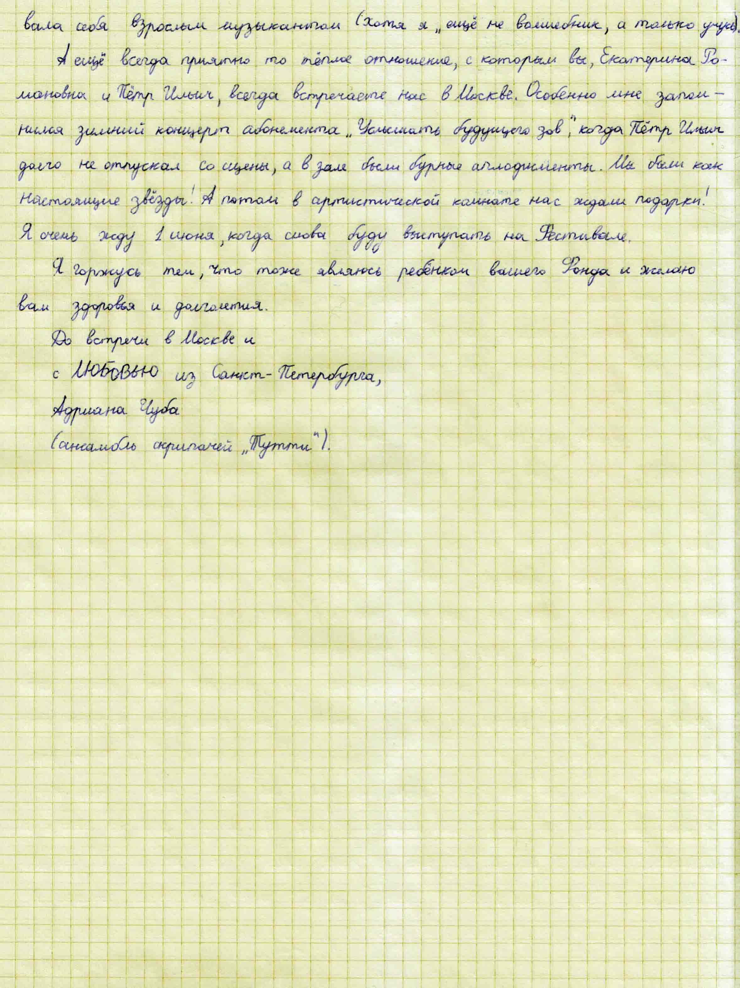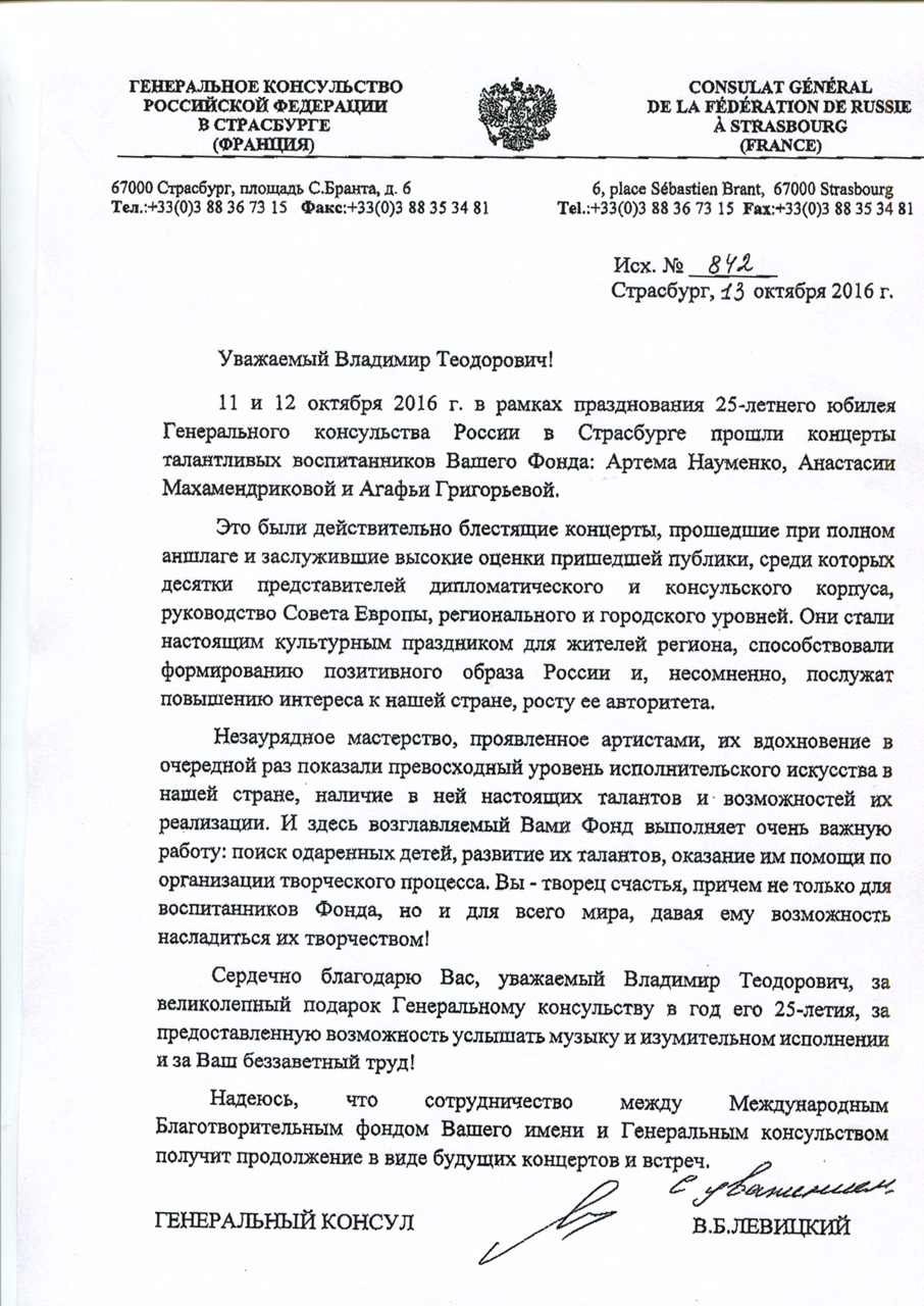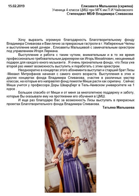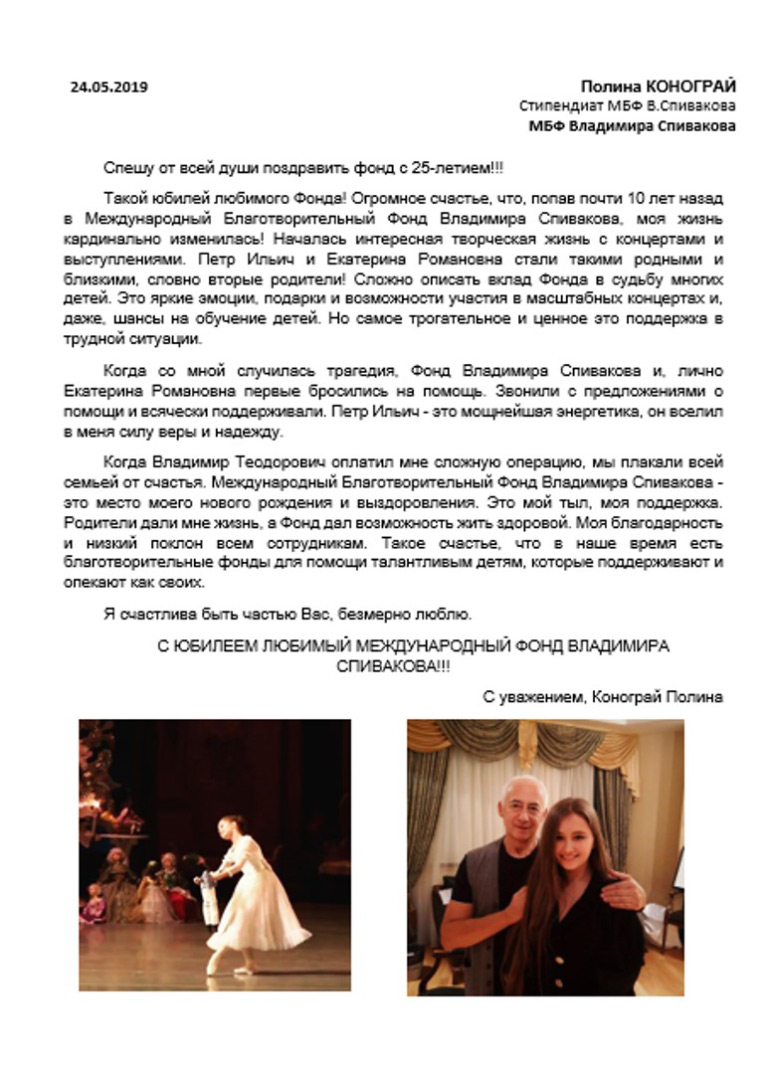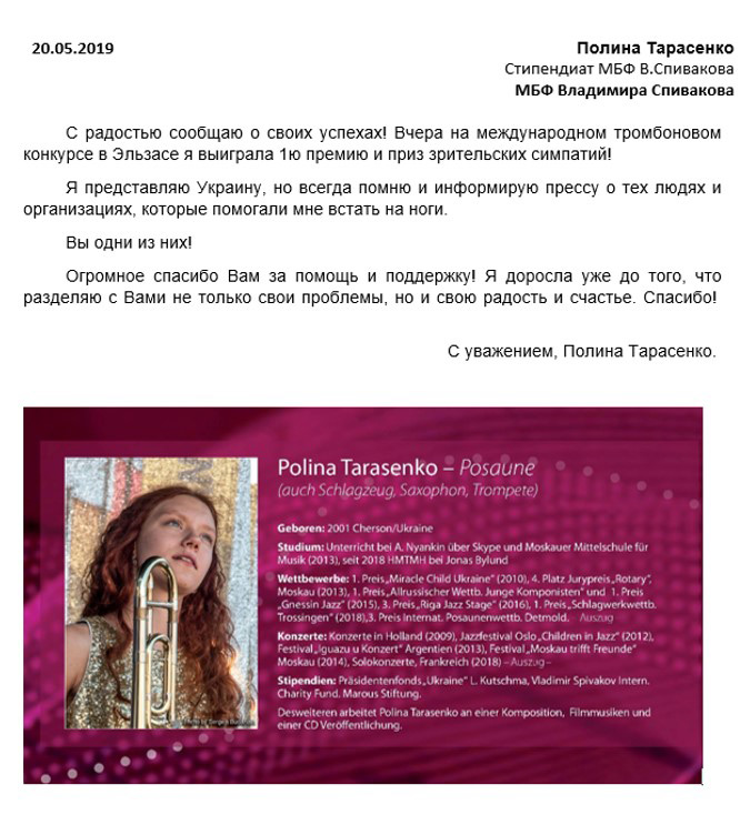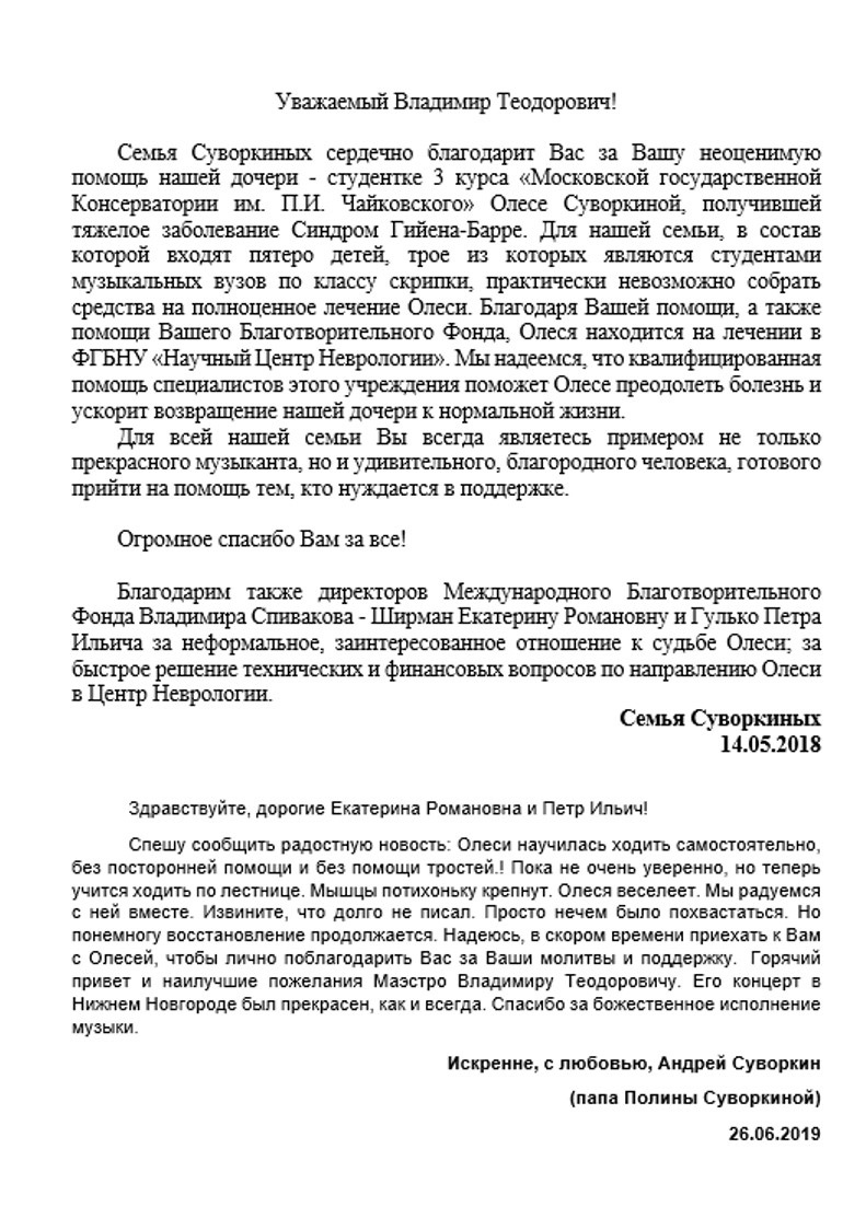 Спасибо Вам большое за всю Вашу заботу и участие! Я уверена, что без Вашей поддержки и помощи замечательных врачей, которых Вы посоветовали нам, я бы не стала лучше себя чувствовать к настоящему времени. Поездка была совершенно потрясающая, мне так понравилось в Париже и в целом во Франции! Нас очень тепло и с овациями на каждом концерте принимали зрители, а это для любого музыканта наибольшее счастье! Спасибо Вам за такую активную поддержку! Нам с мамой и папой казалось, что Вы наши родственники — потому что только очень близкие люди обычно так искренне заботятся и постоянно думают о тебе! С уважением, Полина Сенатулова