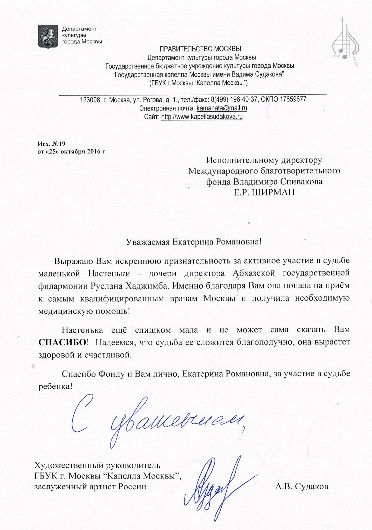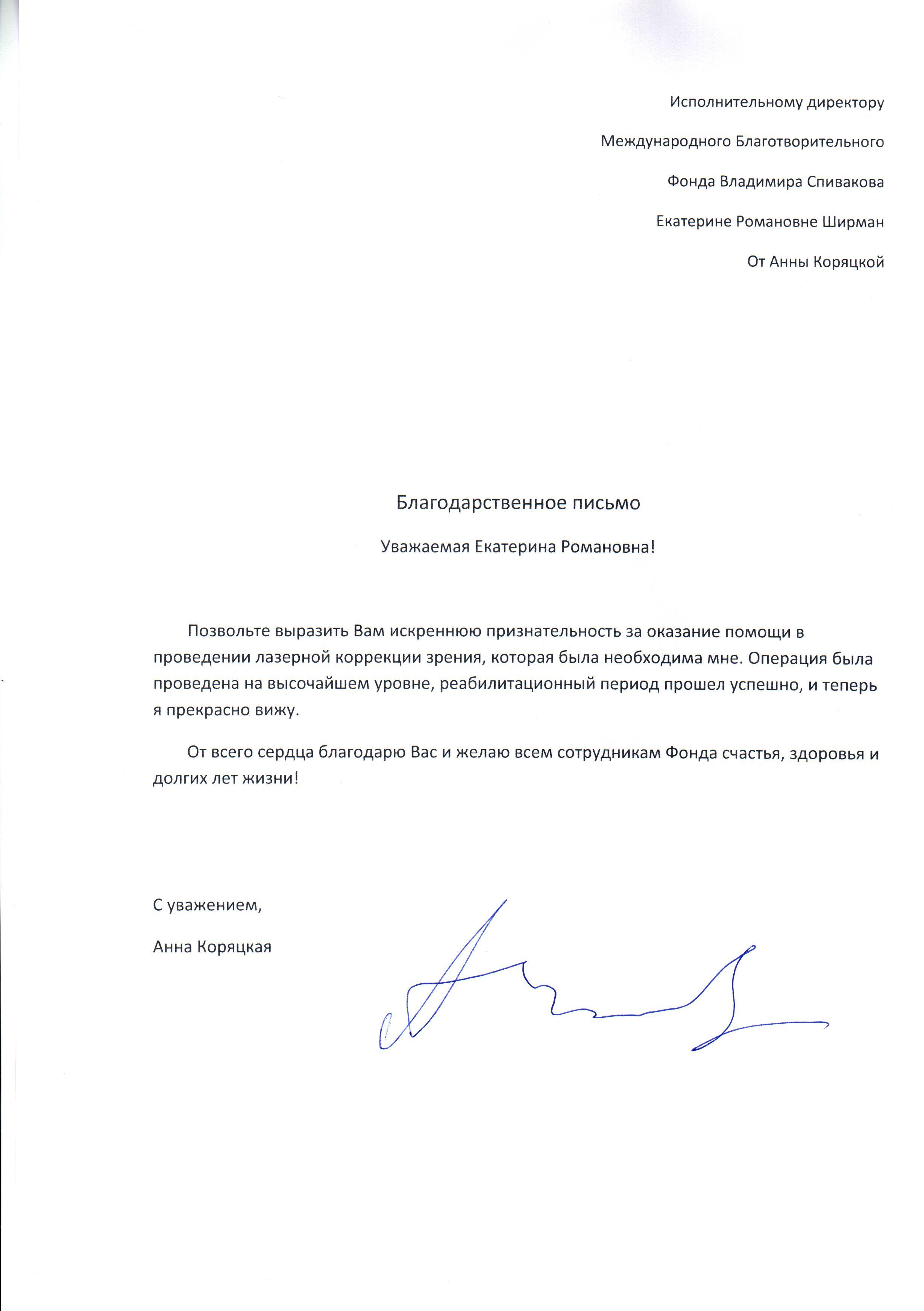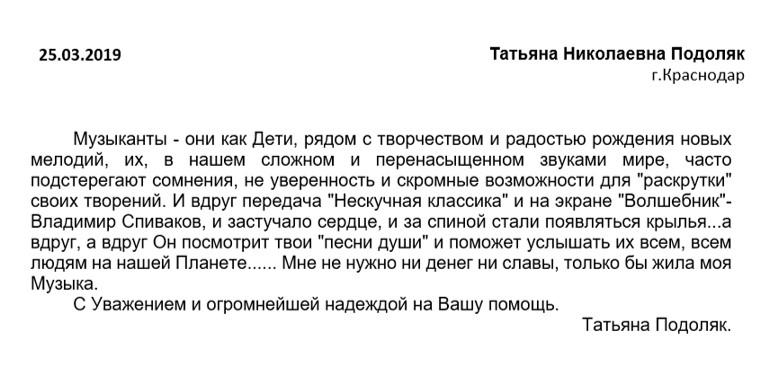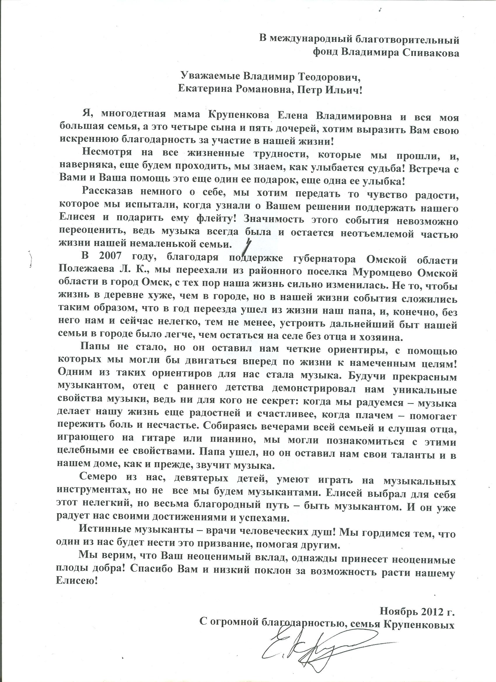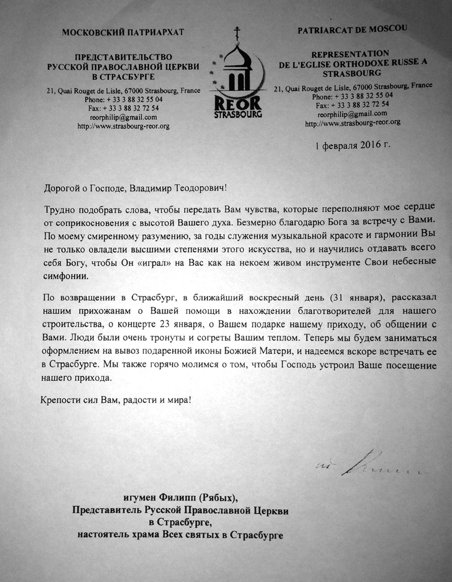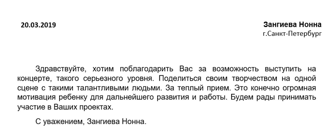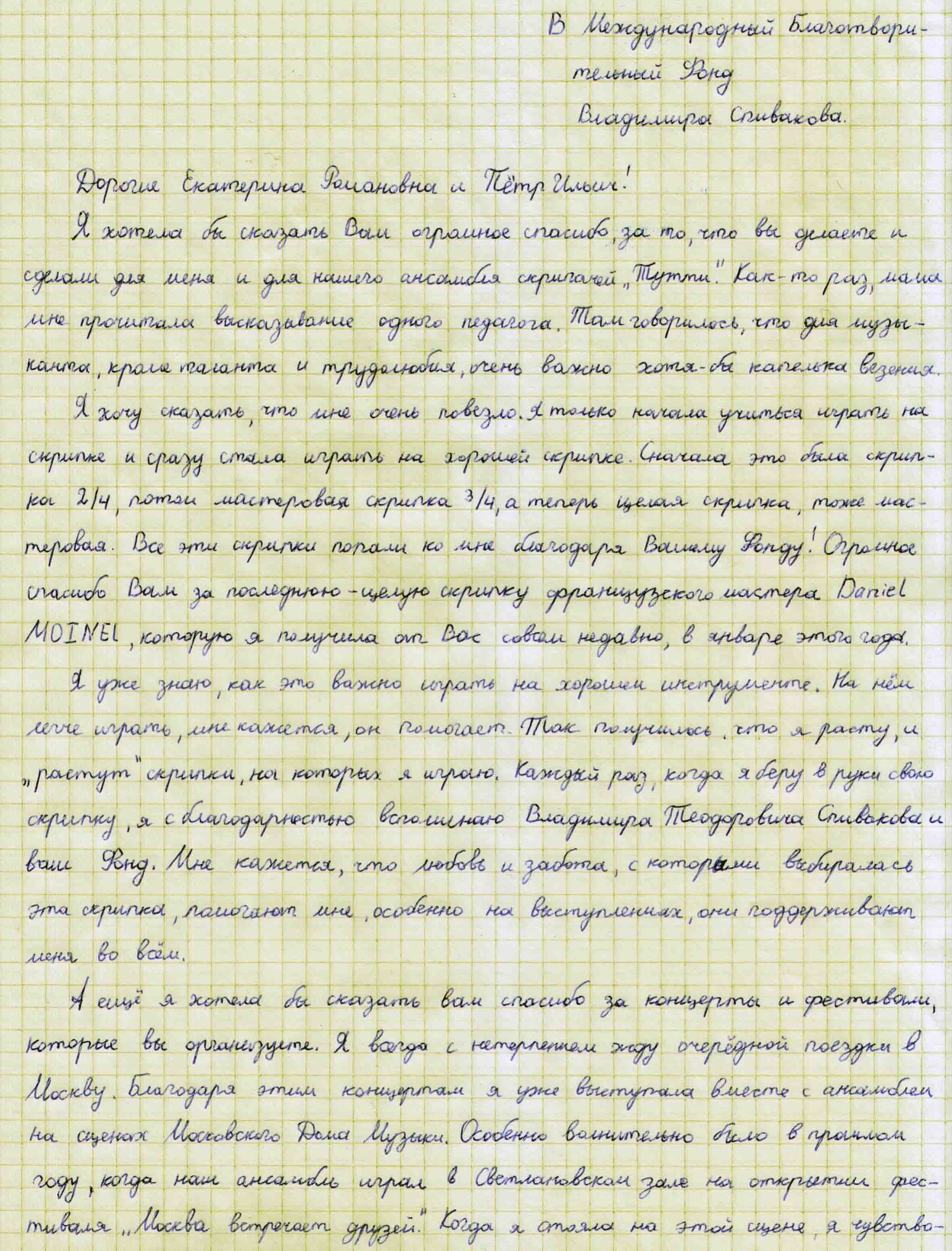 Спасибо Вам большое за всю Вашу заботу и участие! Я уверена, что без Вашей поддержки и помощи замечательных врачей, которых Вы посоветовали нам, я бы не стала лучше себя чувствовать к настоящему времени. Поездка была совершенно потрясающая, мне так понравилось в Париже и в целом во Франции! Нас очень тепло и с овациями на каждом концерте принимали зрители, а это для любого музыканта наибольшее счастье! Спасибо Вам за такую активную поддержку! Нам с мамой и папой казалось, что Вы наши родственники — потому что только очень близкие люди обычно так искренне заботятся и постоянно думают о тебе! С уважением, Полина Сенатулова