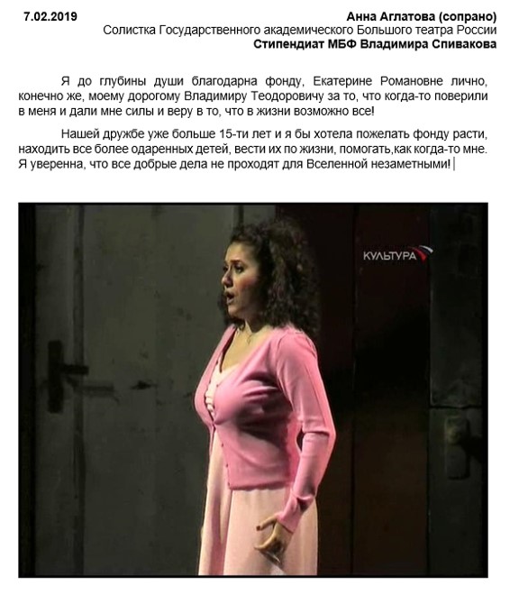 Если бы в наше правительство входили такие неравнодушные люди, страна давно бы полюбила своих детей так, как любят детей они. Их помощь детям неоценима. Их заботу мы испытали и на себе, за что очень им благодарны и приносим свою признательность и любовь тех детей, которых они взяли под свое покровительство. То, что делает Фонд Владимира Теодоровича Спивакова ничем не оценить и не измерить. Фонд просто работает и приносит пользу.
