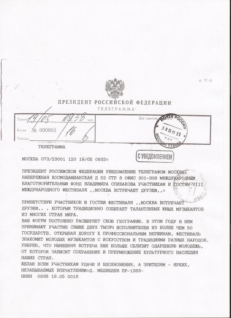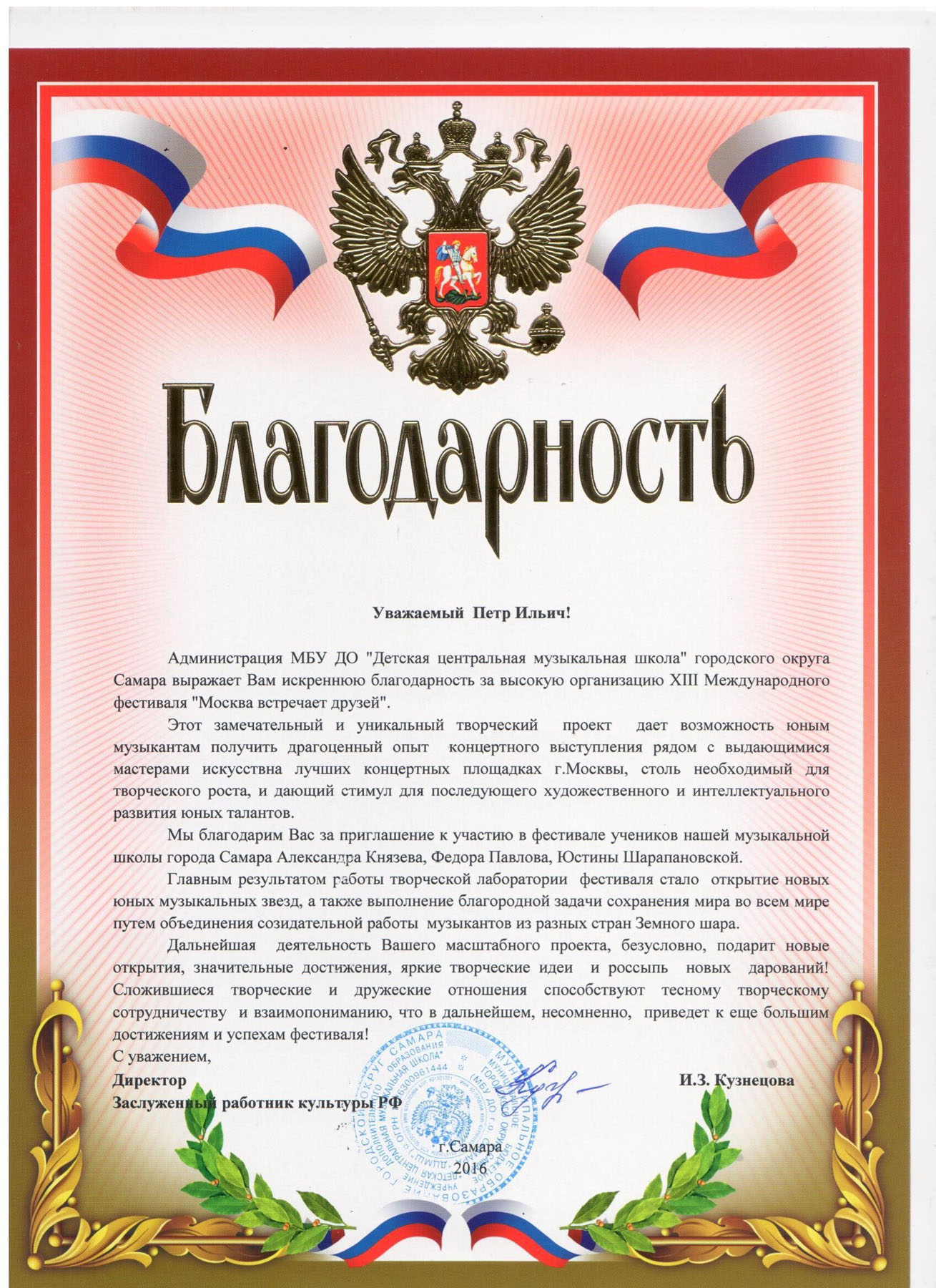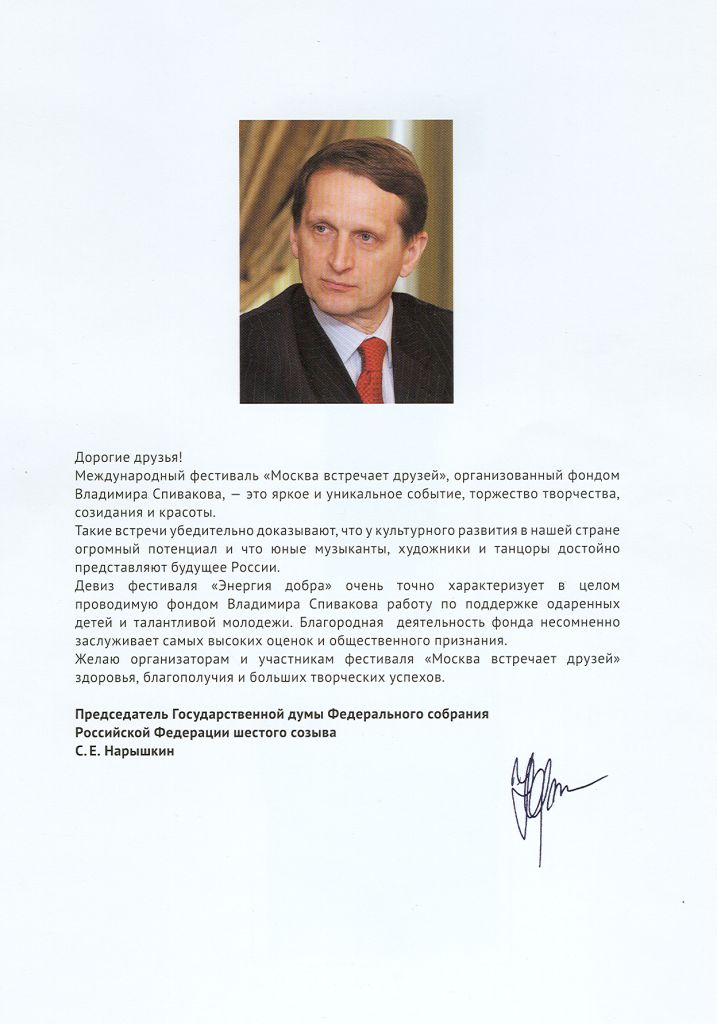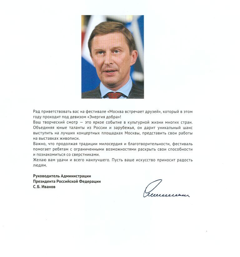 Разрешите выразить Вам огромную сердечную благодарность в подготовке и проведении XI Международного фестиваля «Москва встречает друзей»!