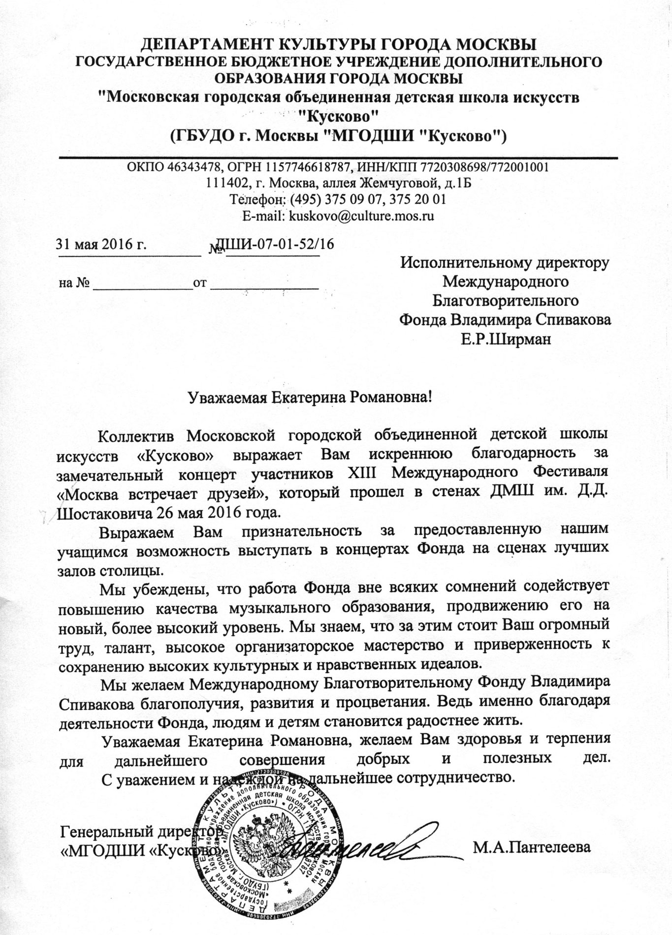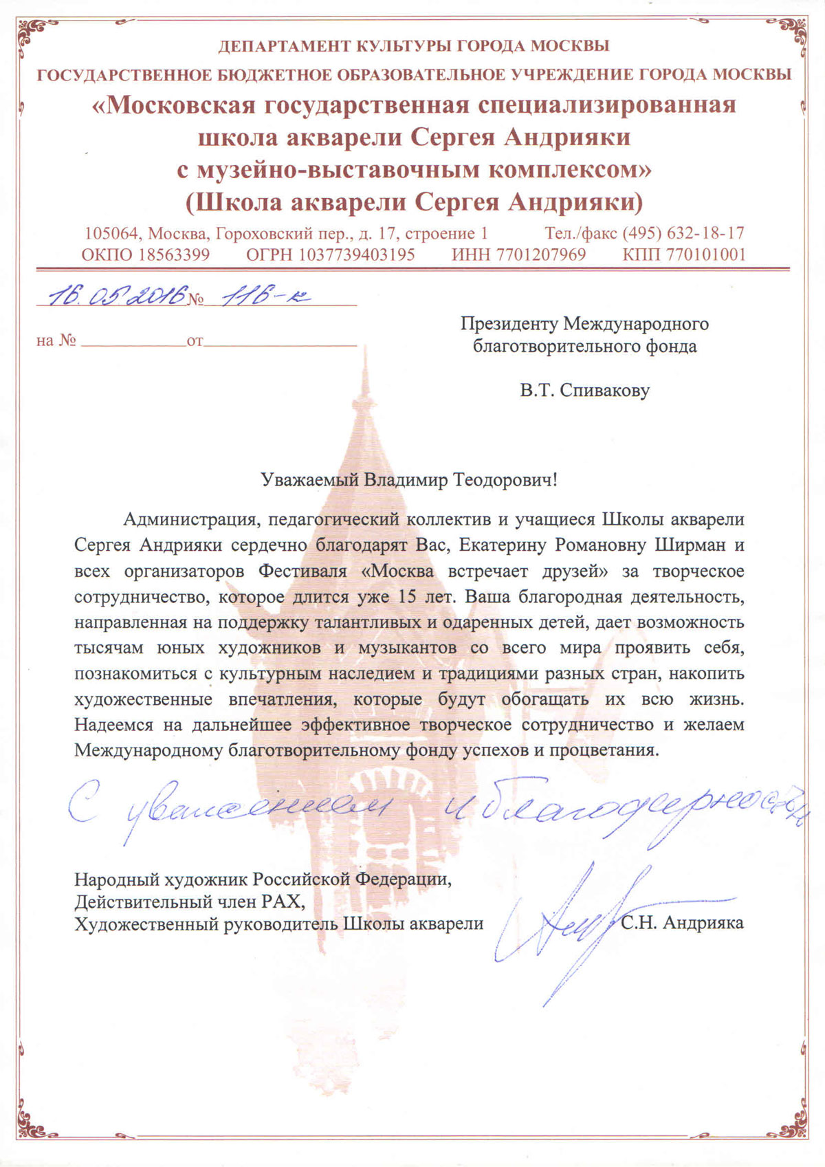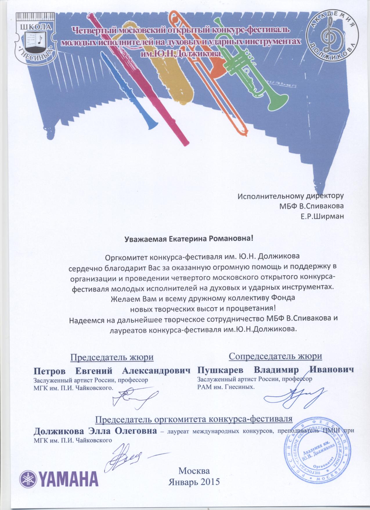 Разрешите выразить Вам огромную сердечную благодарность в подготовке и проведении XI Международного фестиваля «Москва встречает друзей»!