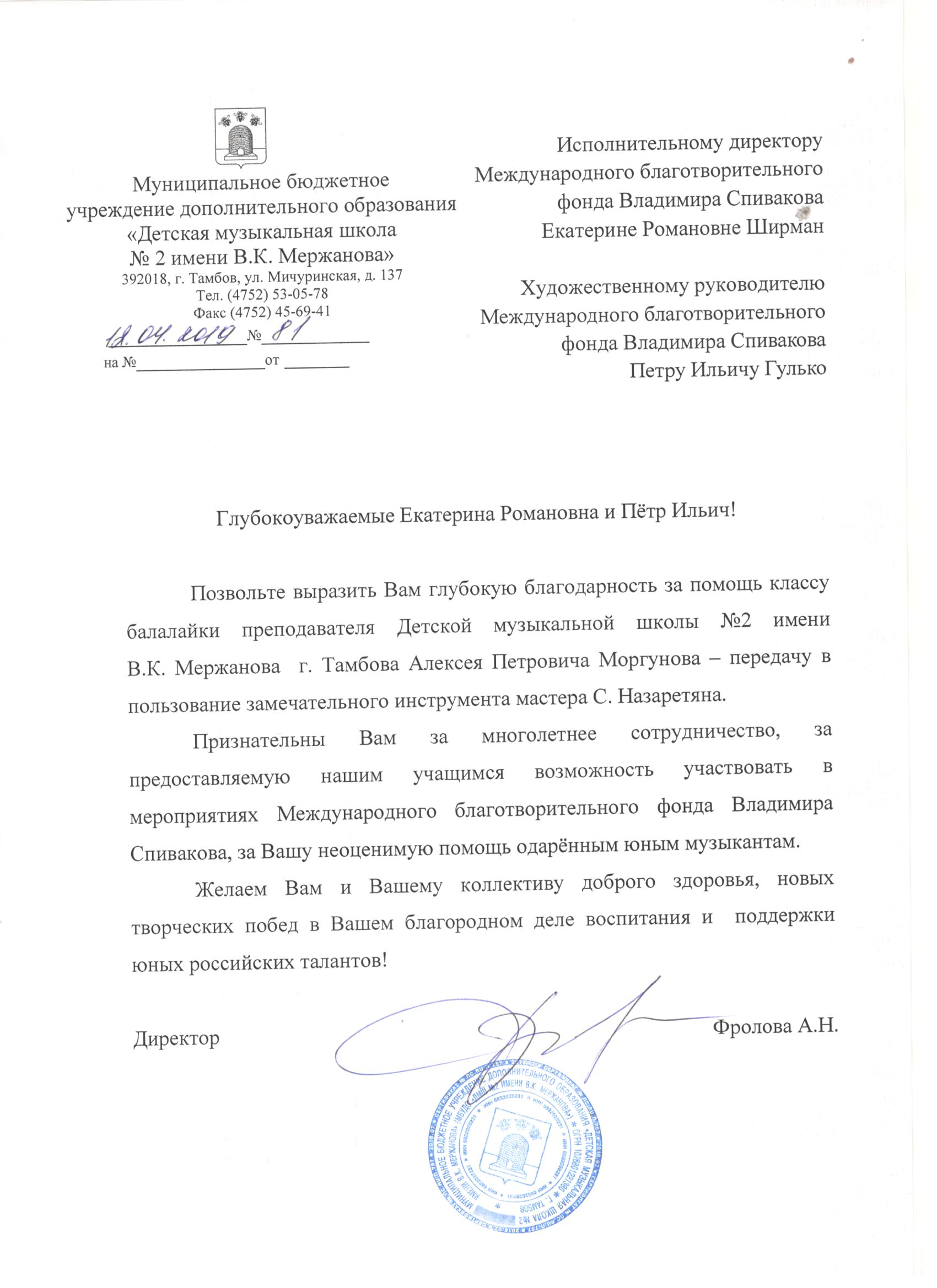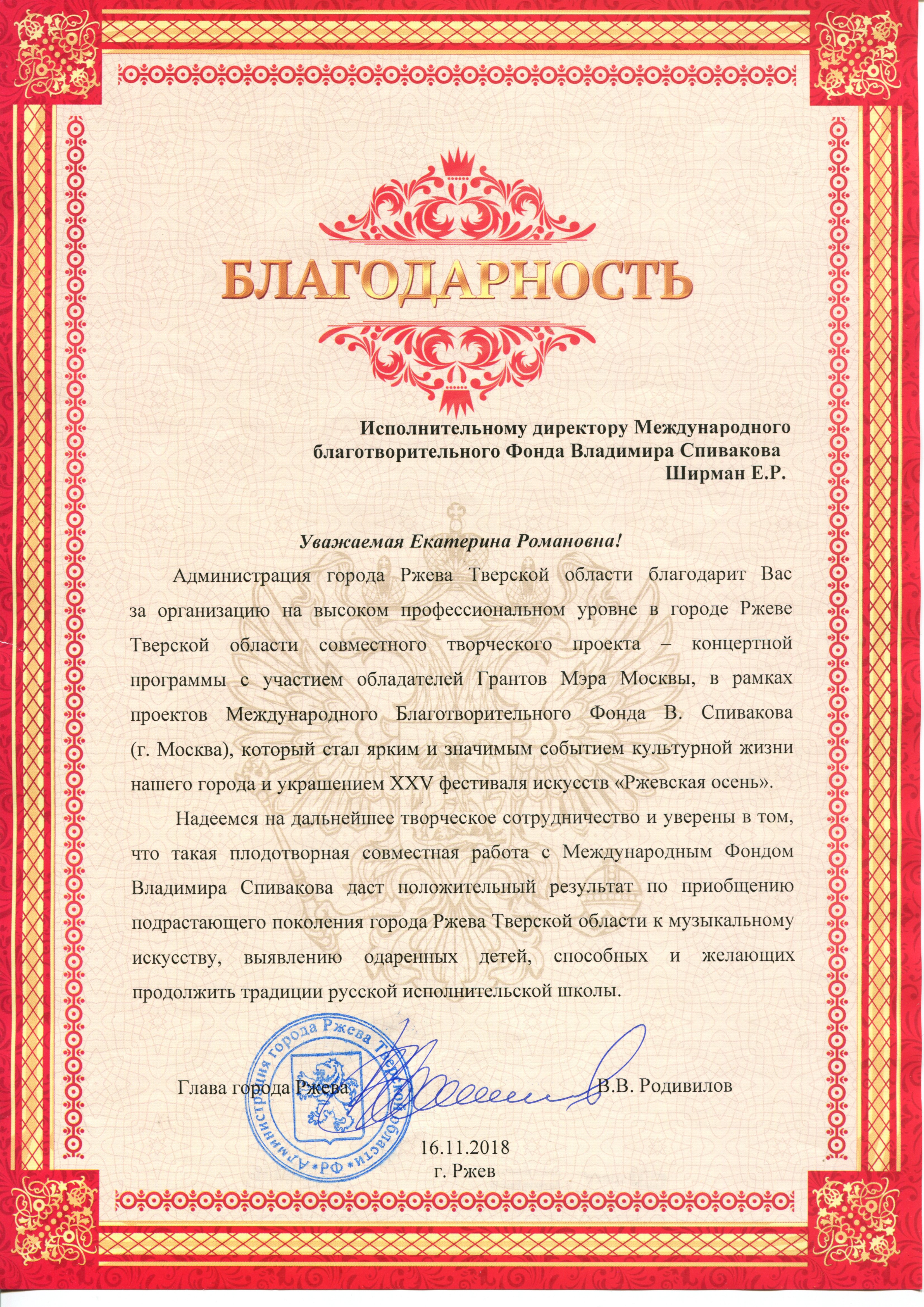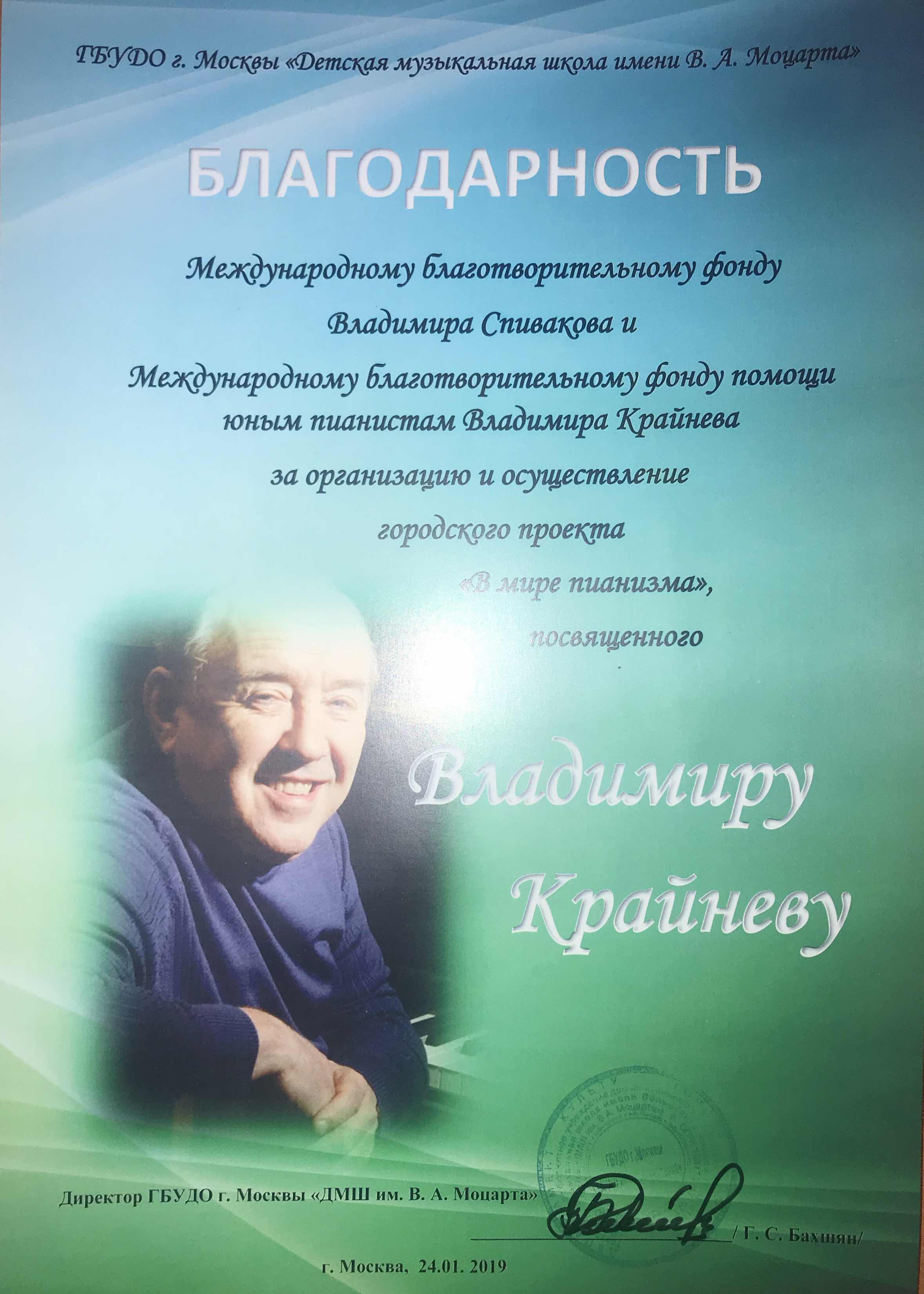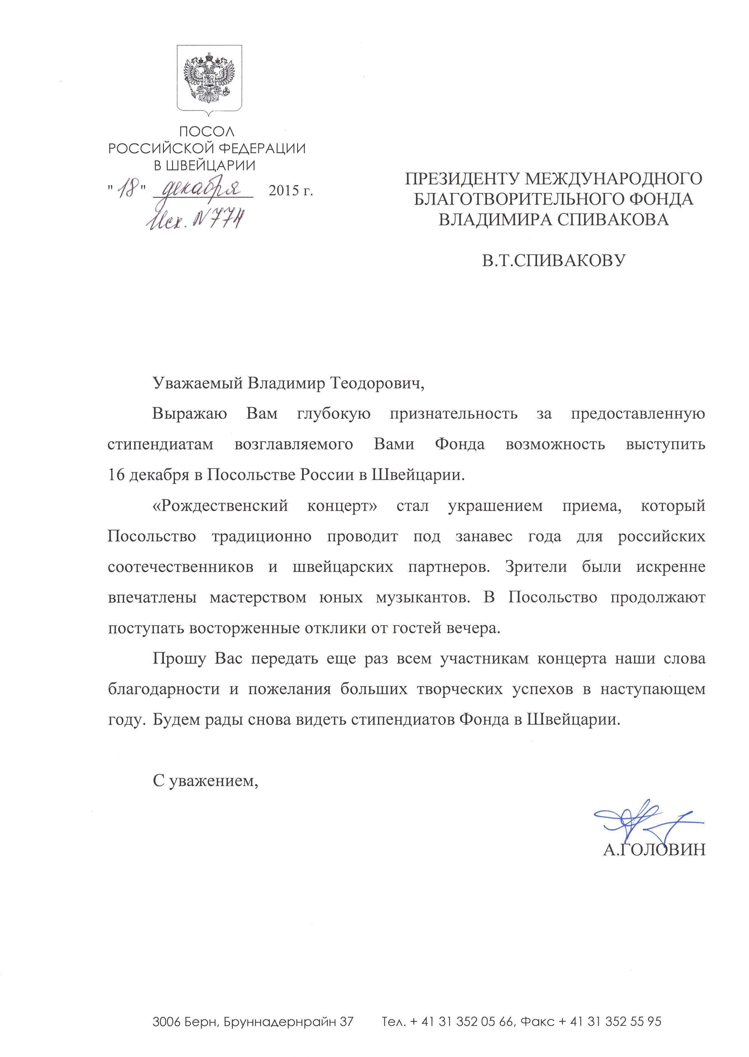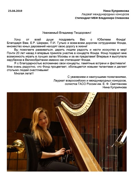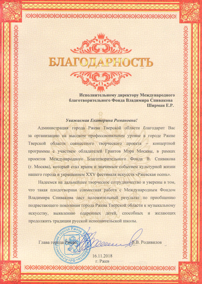 Просим передать слова благодарности президенту Фонда Владимиру Теодоровичу Спивакову. С глубоким уважением,