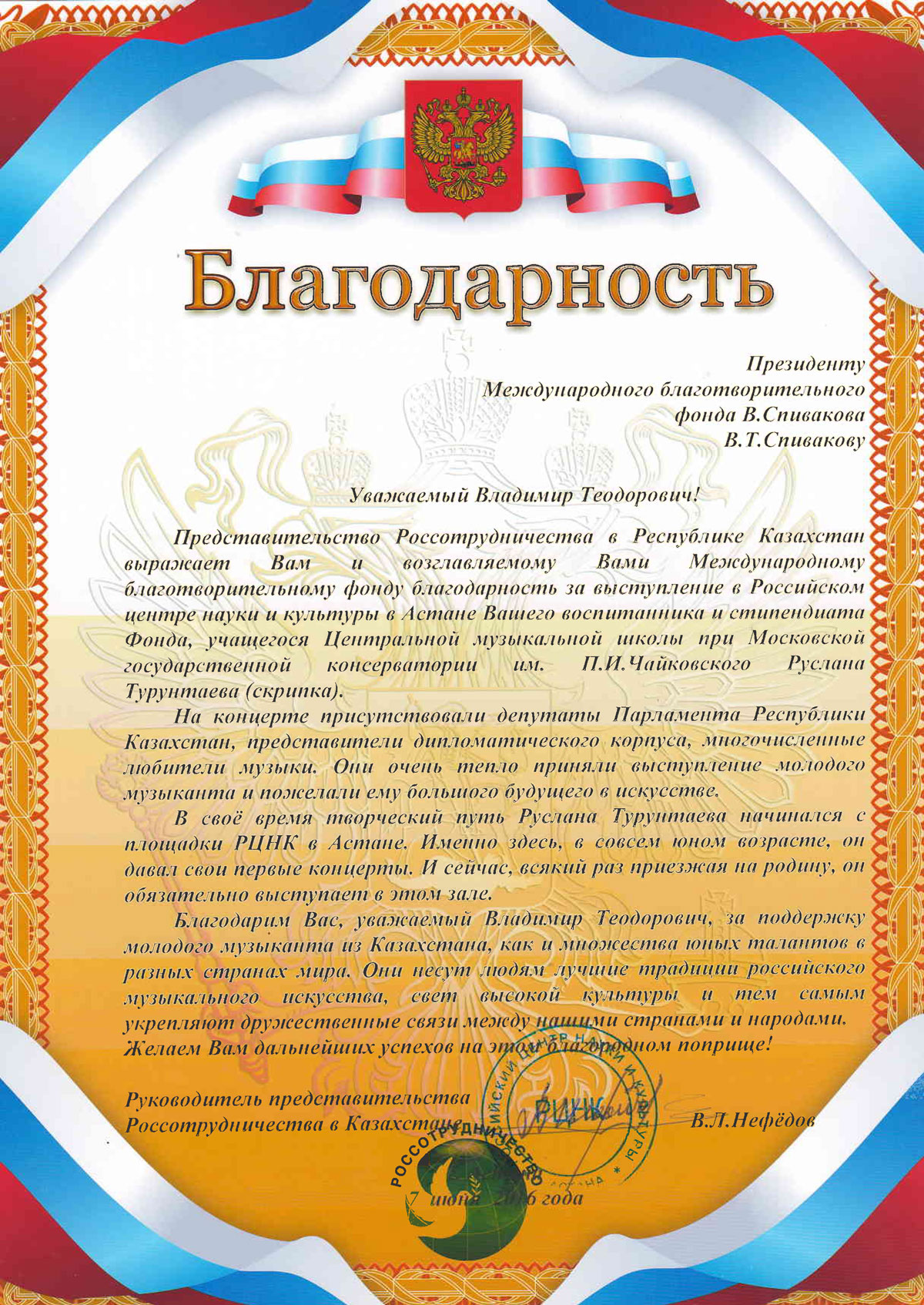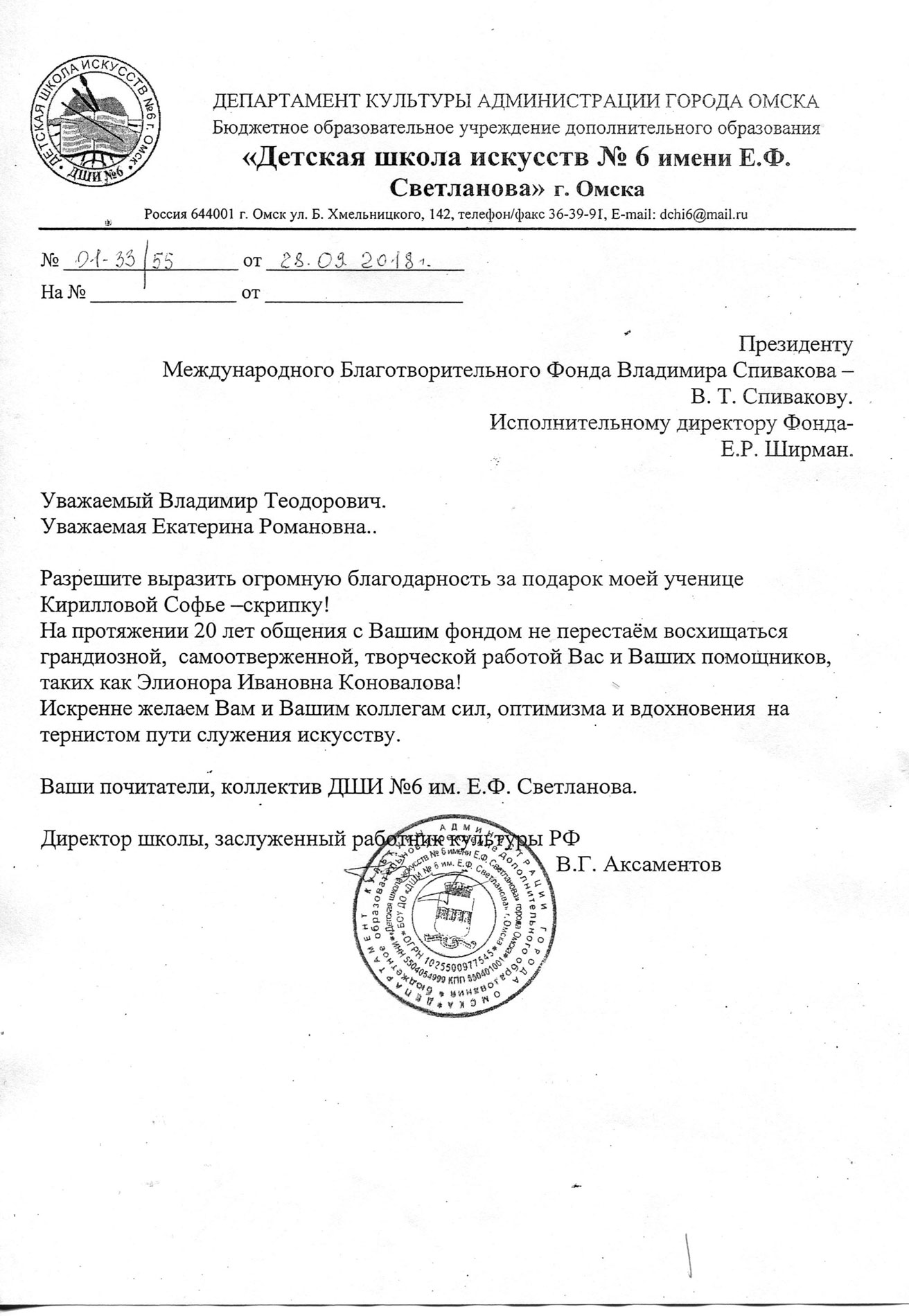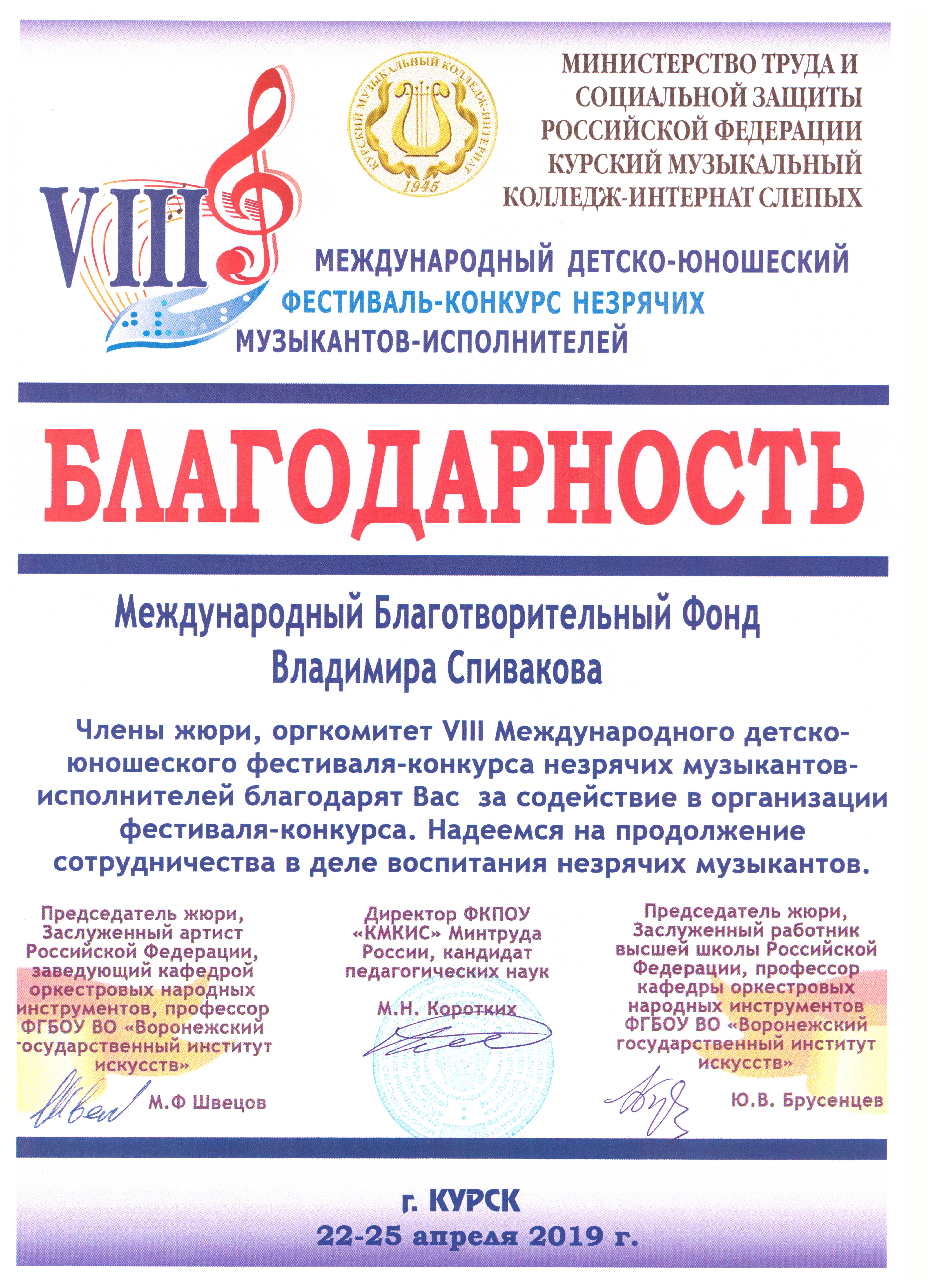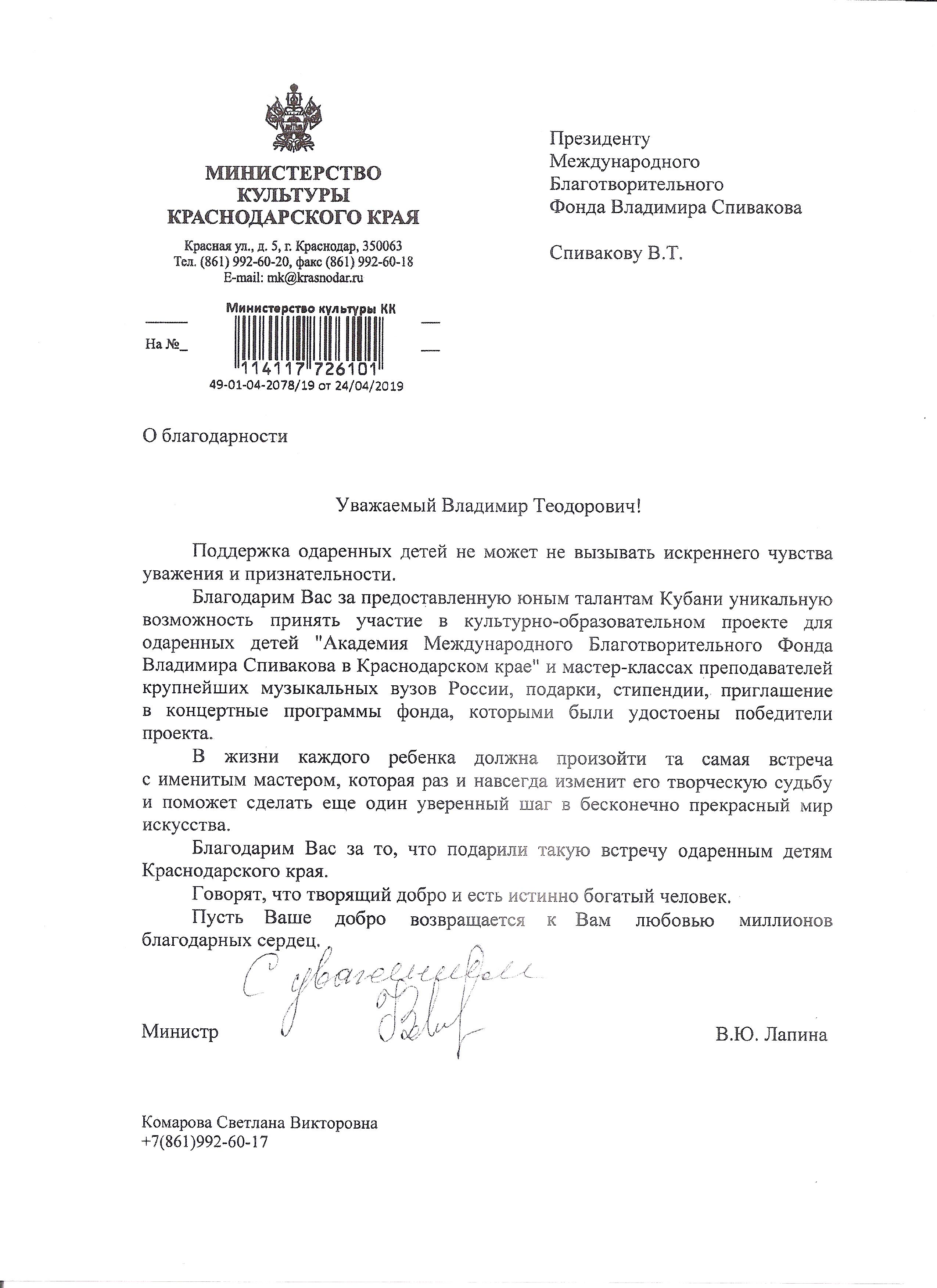 Просим передать слова благодарности президенту Фонда Владимиру Теодоровичу Спивакову. С глубоким уважением,