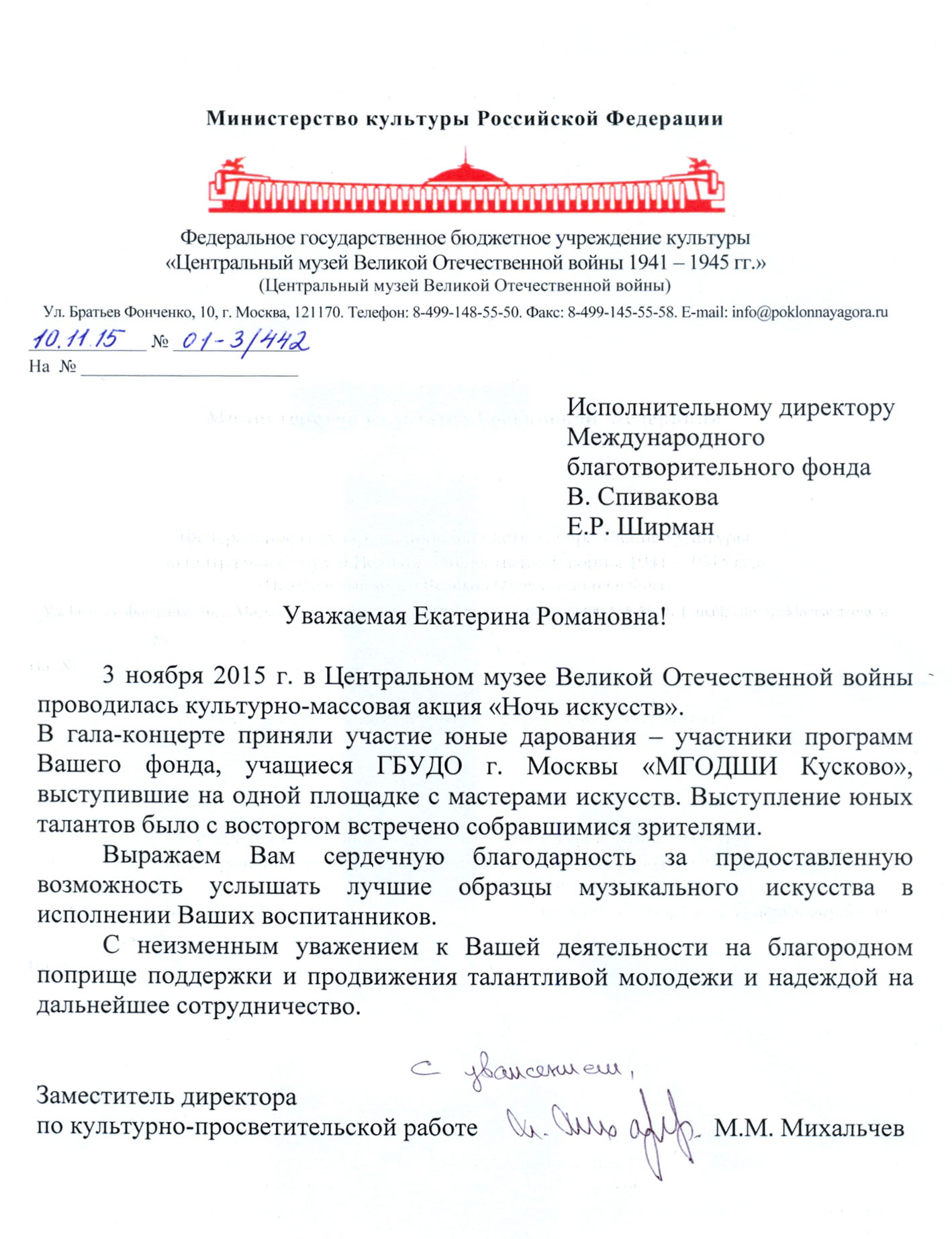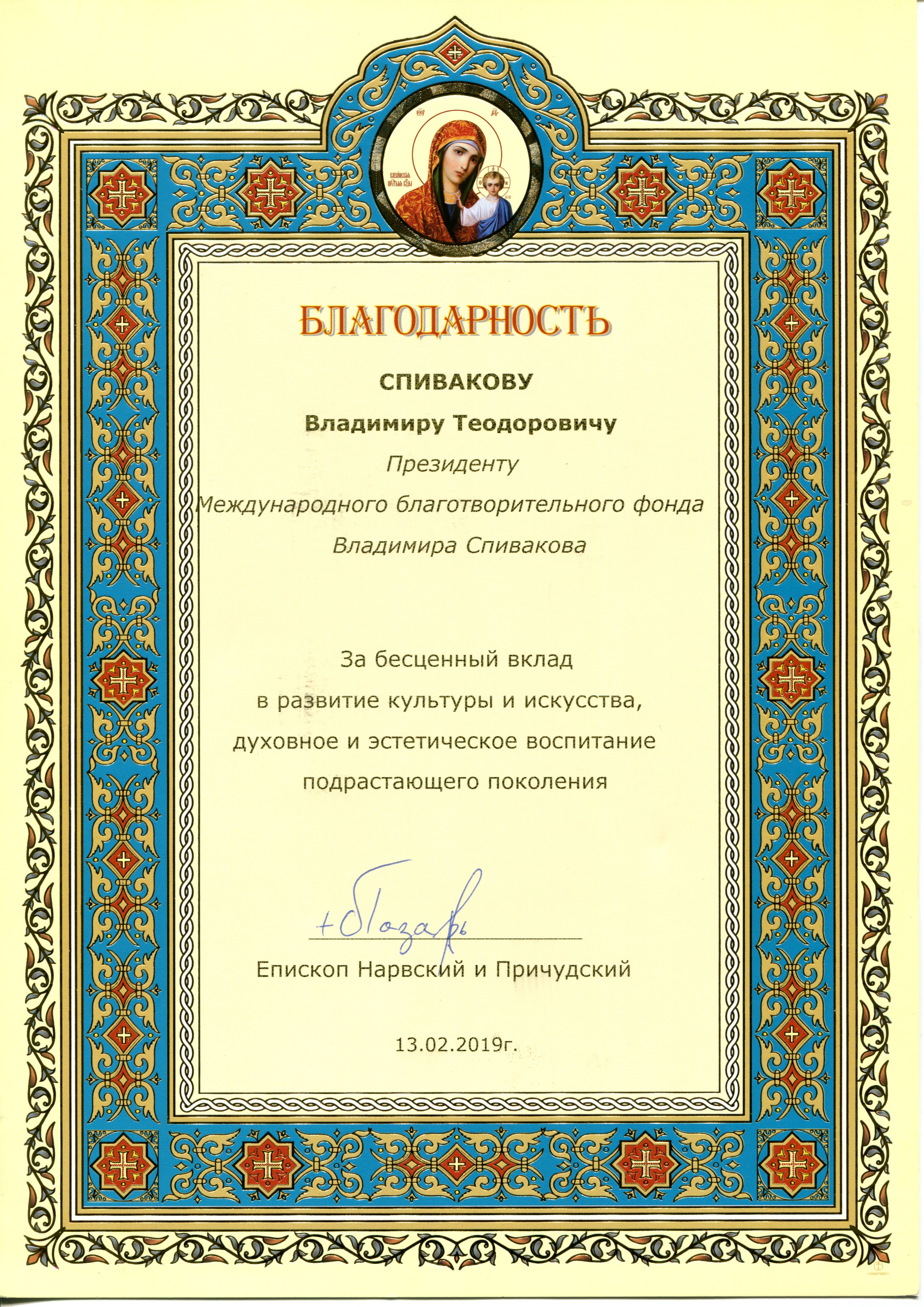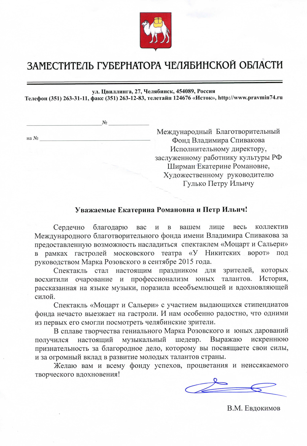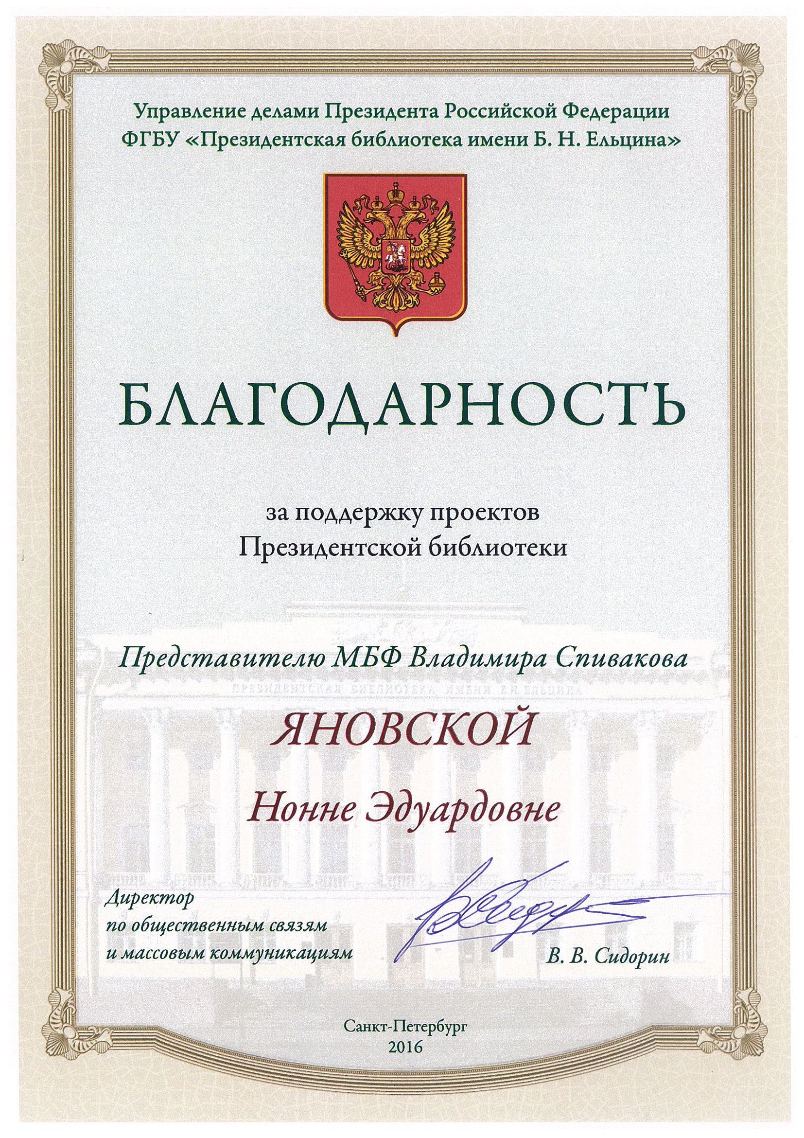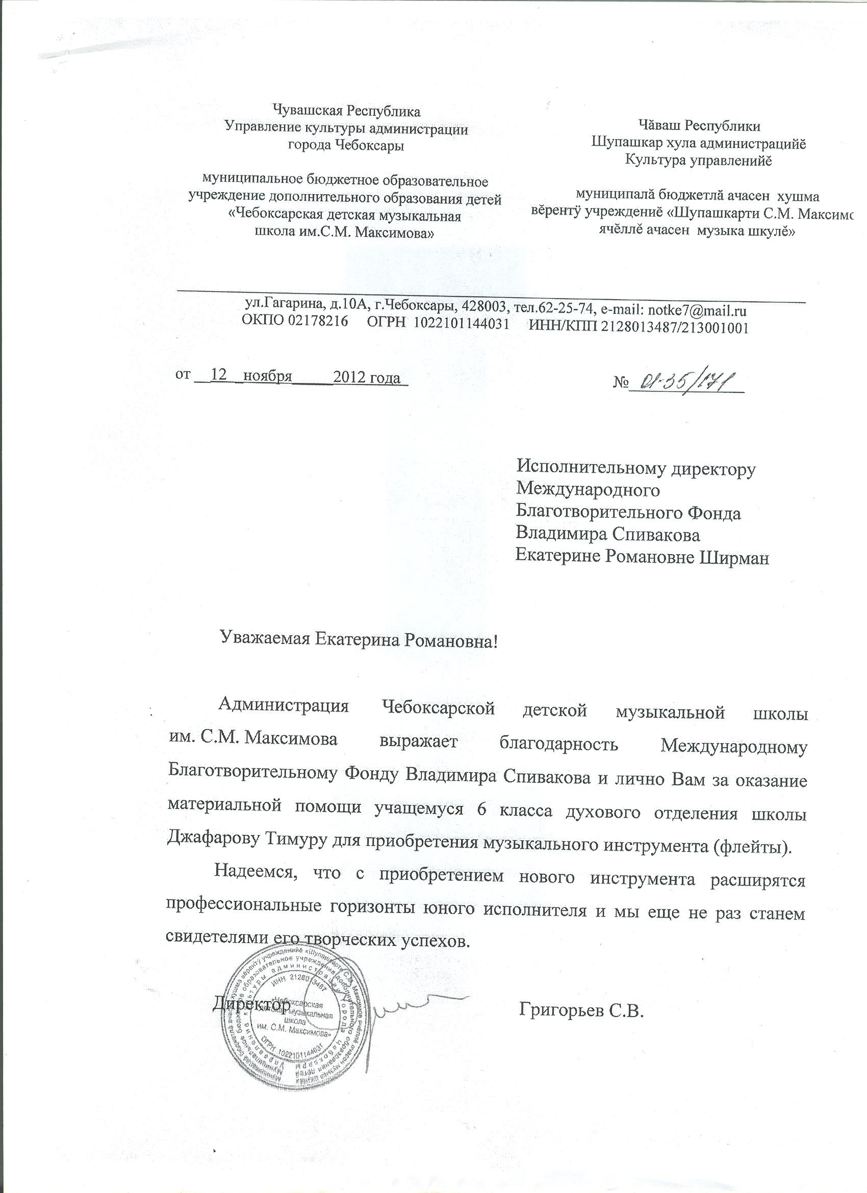Просим передать слова благодарности президенту Фонда Владимиру Теодоровичу Спивакову. С глубоким уважением,
