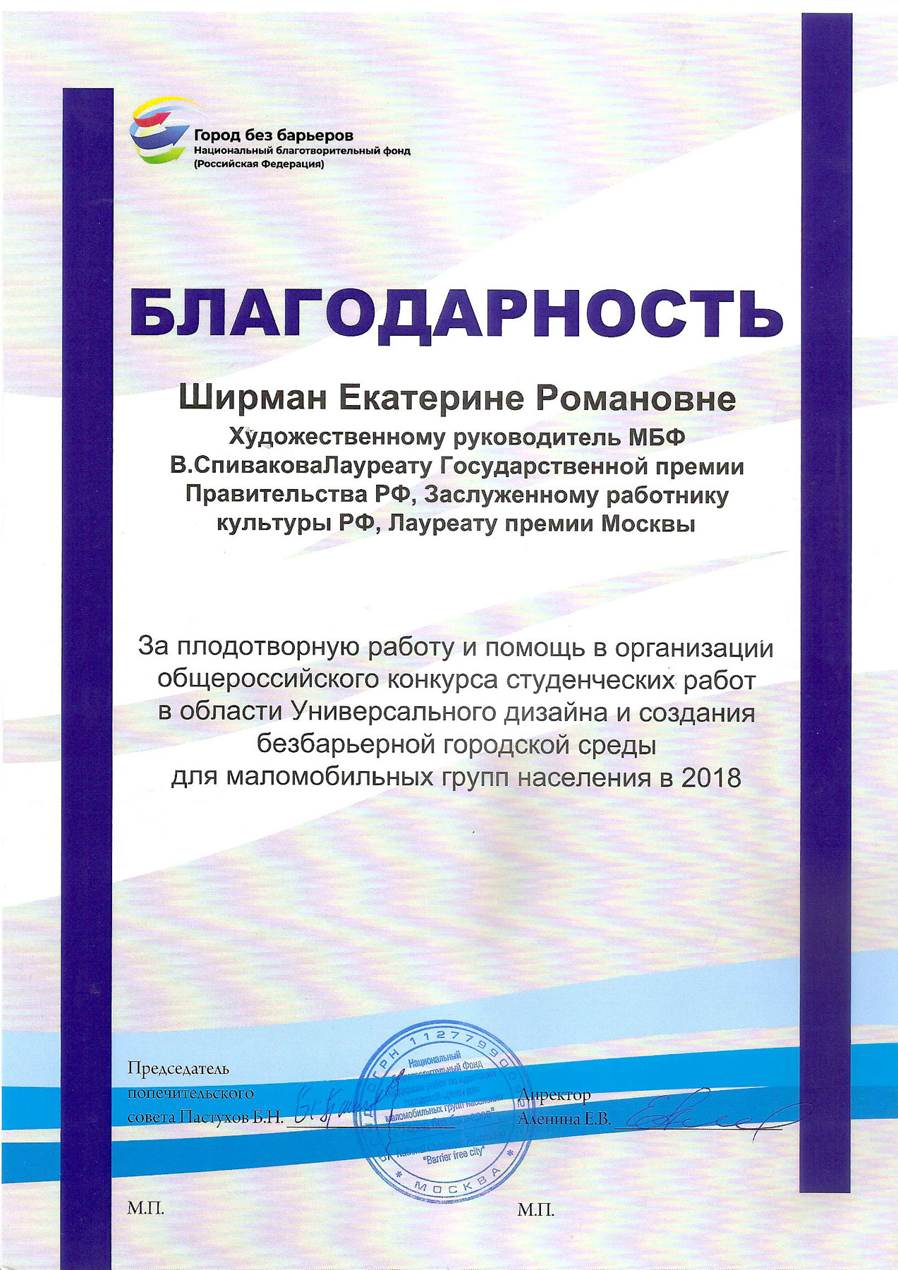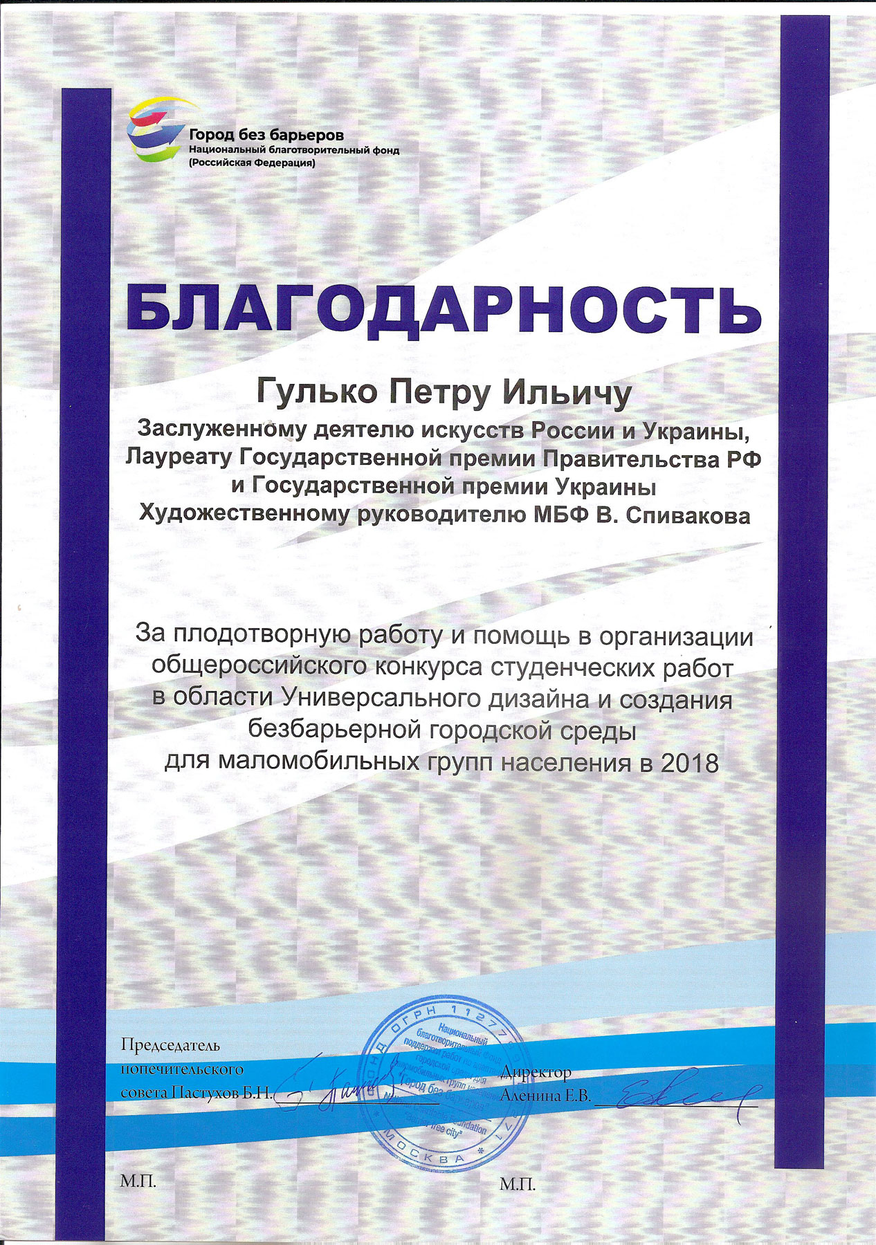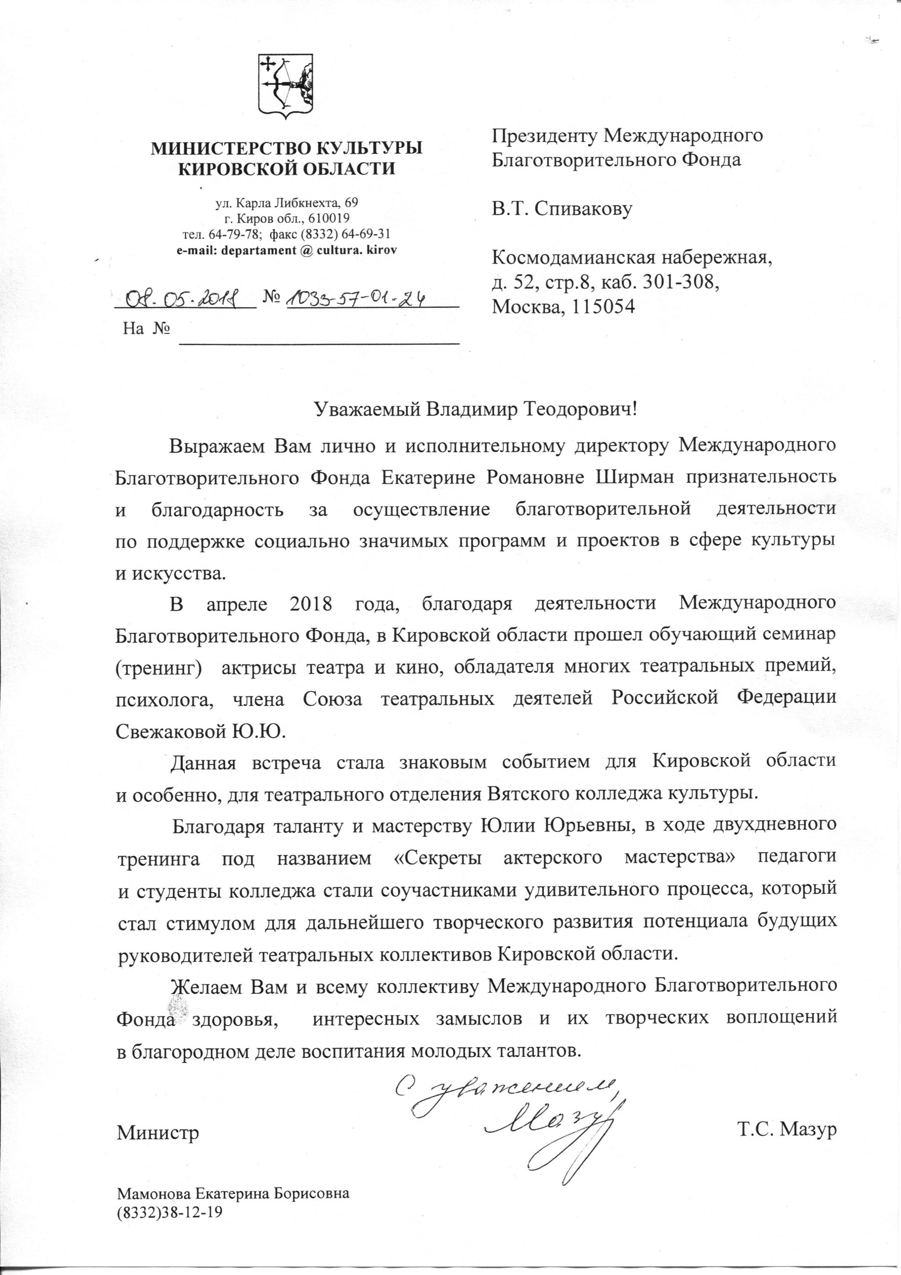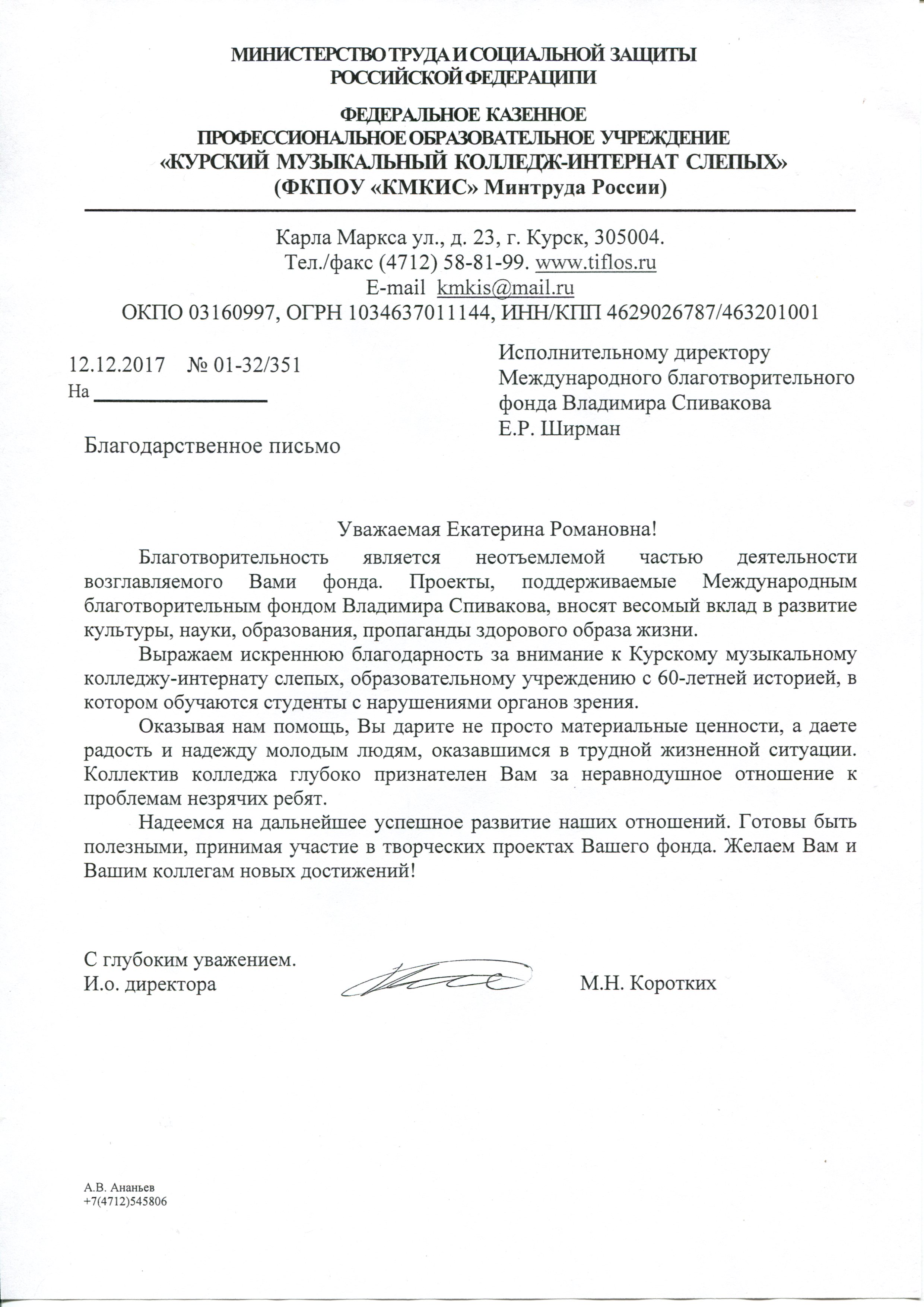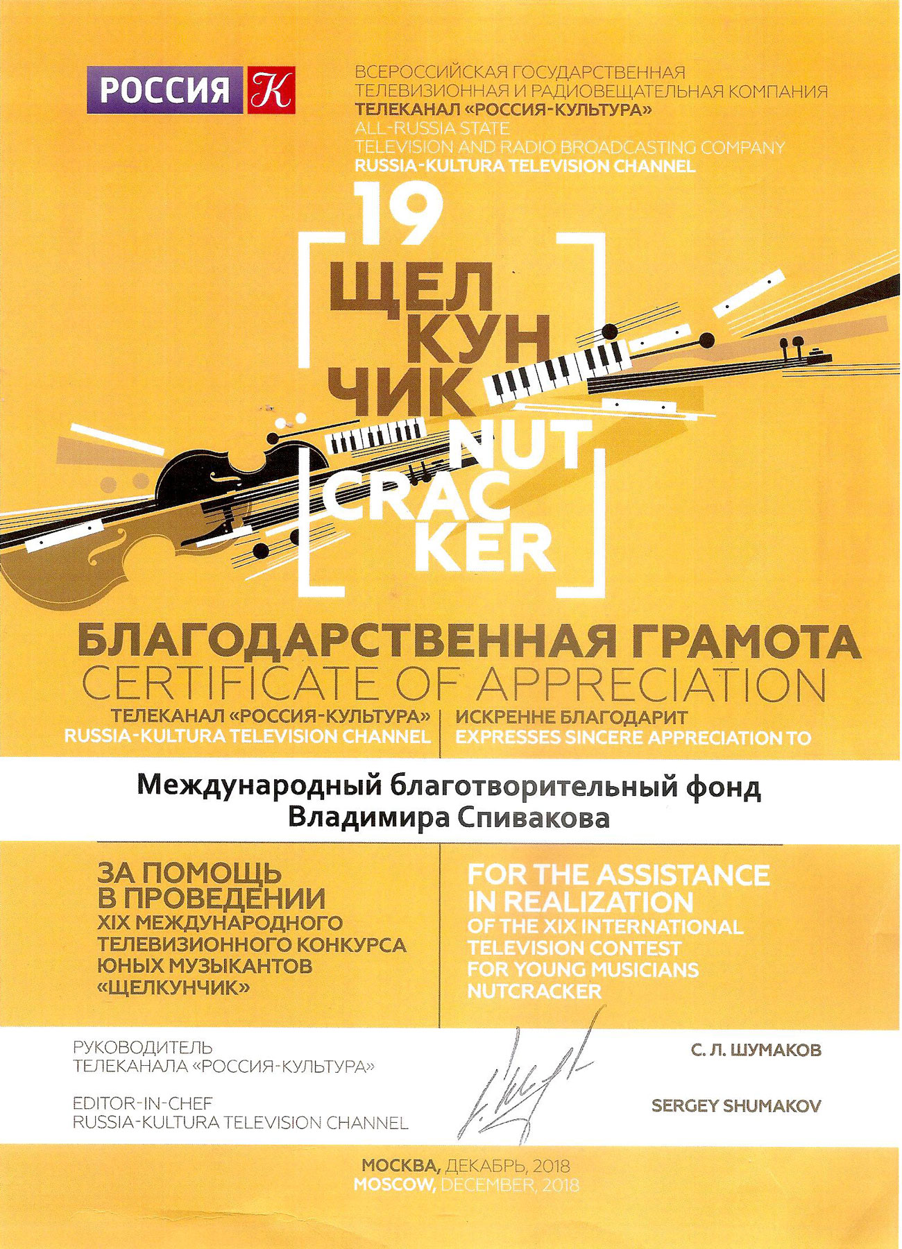 Просим передать слова благодарности президенту Фонда Владимиру Теодоровичу Спивакову. С глубоким уважением,