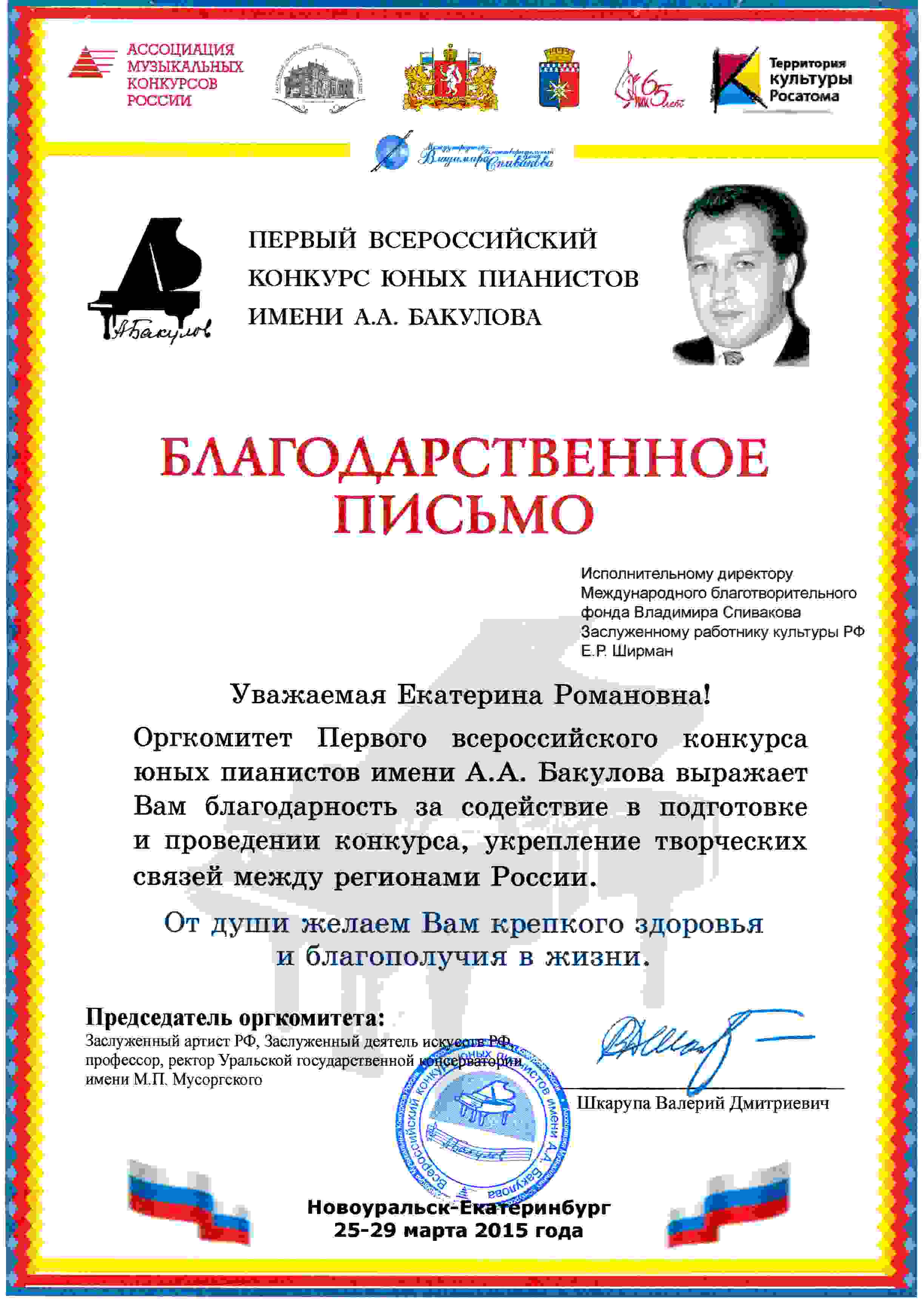 Хочу выразить огромную благодарность- Ширман Екатерине Романовне, за подготовку и проведение грандиозного XI Международного фестиваля «Москва встречает друзей»! Пожелать Вам Екатерина Романовна — долгих лет жизни, здоровья, добра, счастья, мира и благополучия.