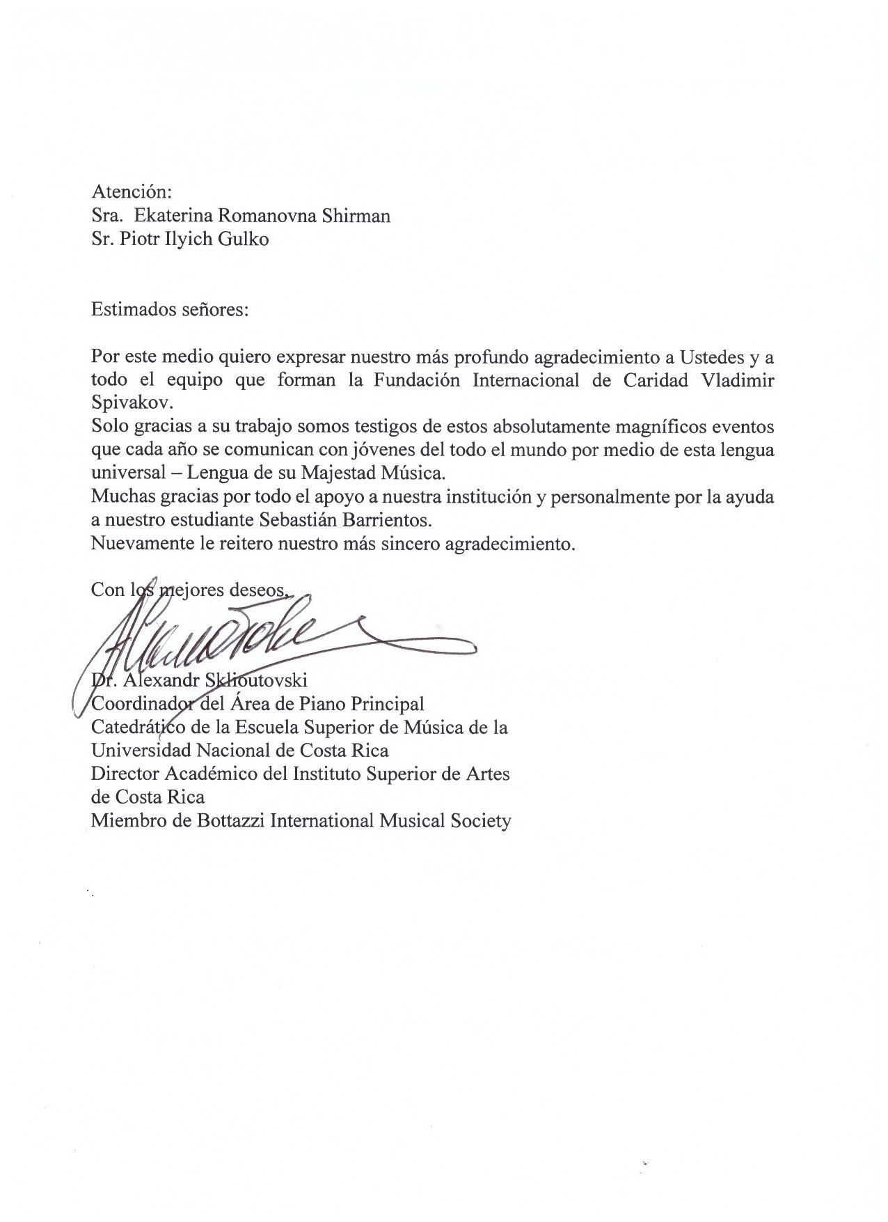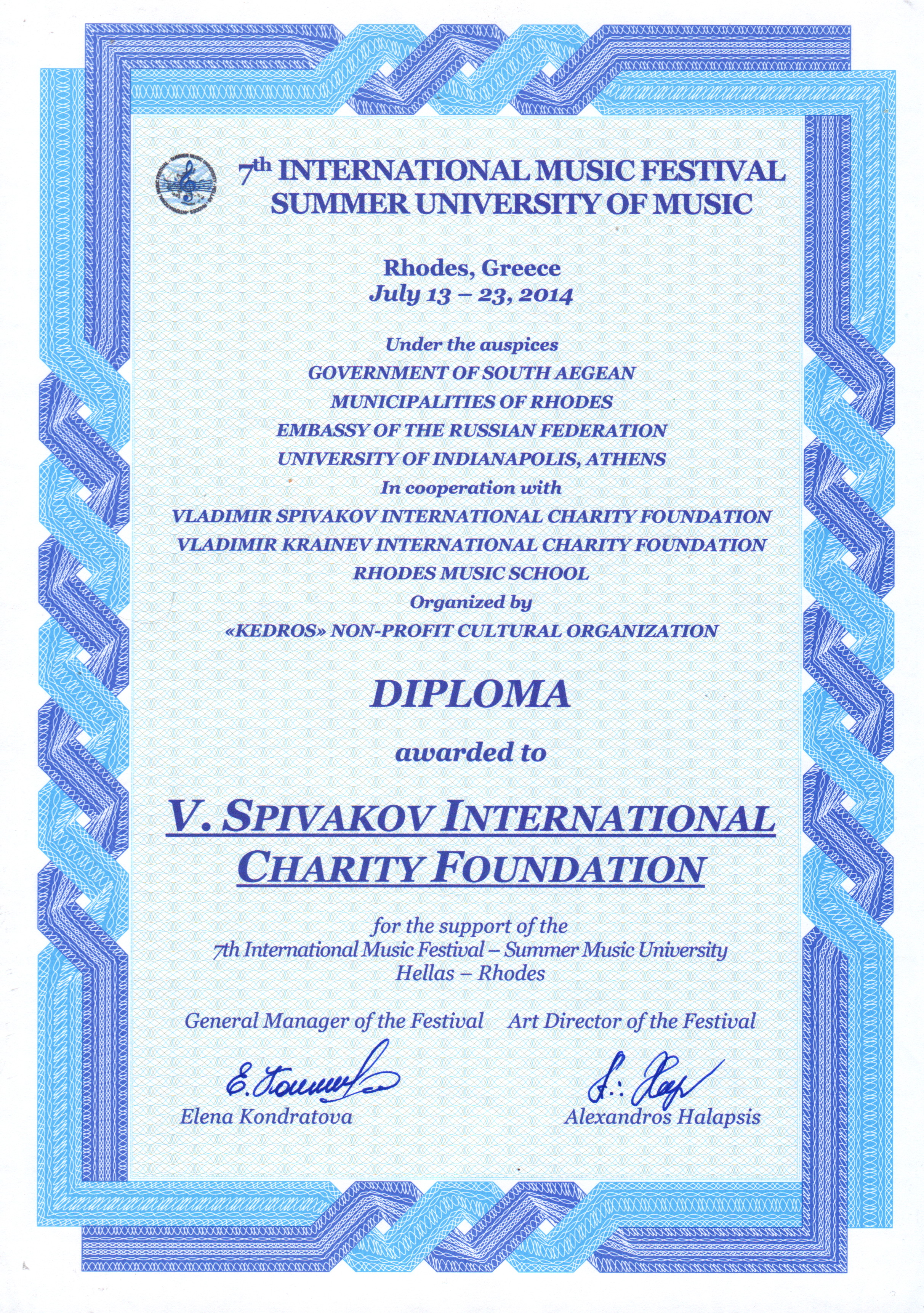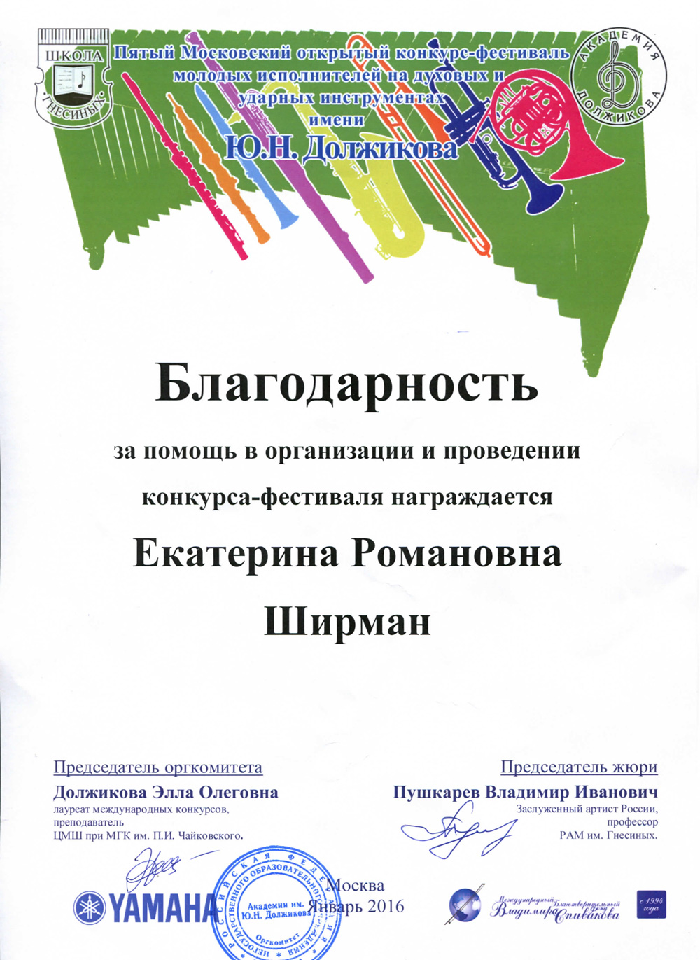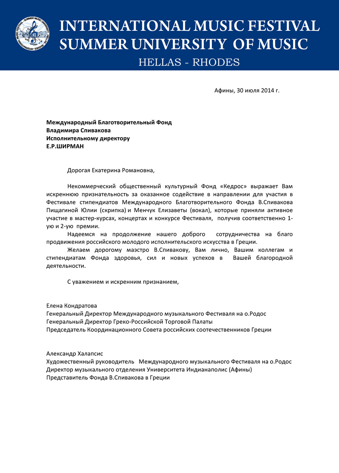 Особую благодарность выражаем Петру Ильичу Гулько и Екатерине Романовне Ширман за содействие и помощь в выделении средств для участия нашей дочери, Свичкаренко Виктории, в летних мастер-классах XI международного музыкального фестиваля в Греции. На уроках преподавателя Марии Тампере-Безродной Виктория получила необходимые знания и ценный опыт, а также возможность совершенствовать свой исполнительский уровень, принимая участие в концертах и конкурсах в рамках фестиваля.