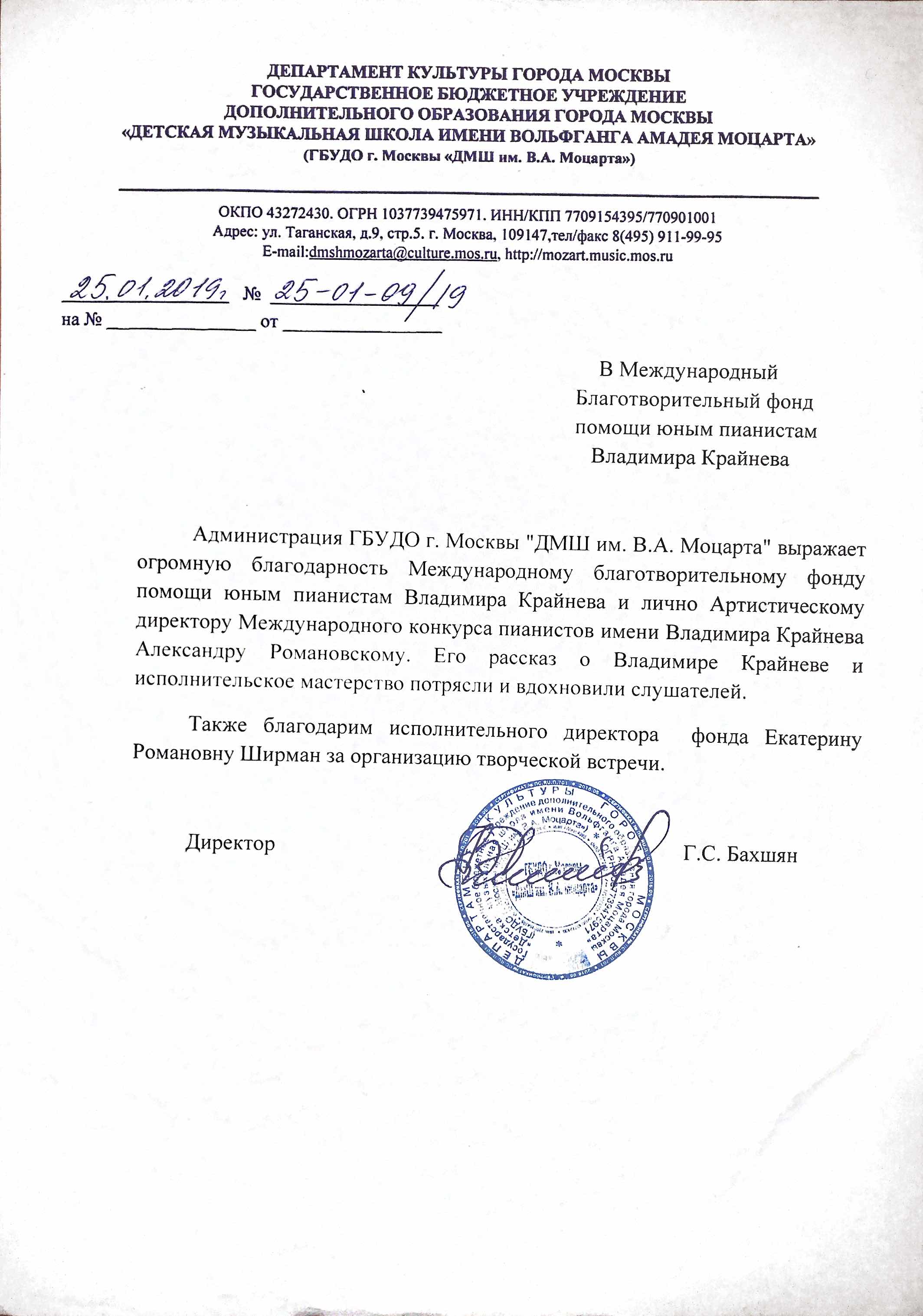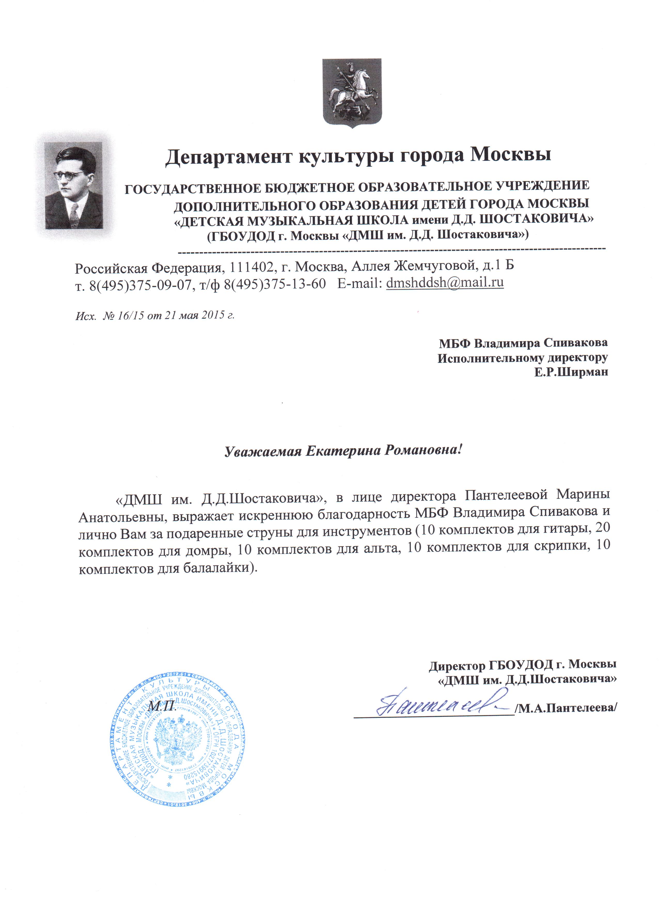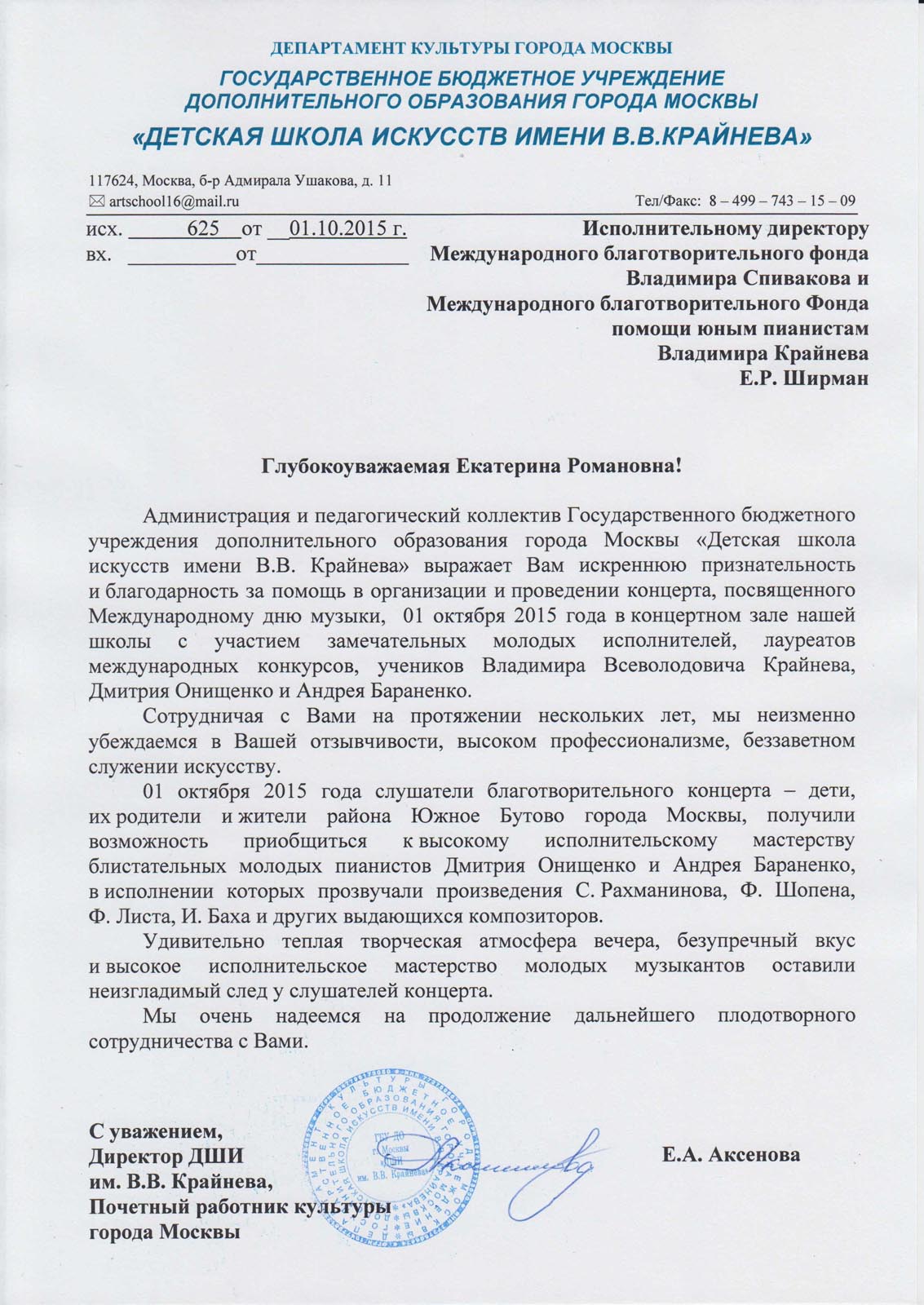 Для нас было большой честью выступить перед Вами и Мэром Москвы Сергеем Семеновичем Собяниным в обновленном здании МГКМИ им. Ф. Шопена в рамках программы «Искусство – детям». Этот проект действительно необходим как учащимся, так и учителям. Открывая новые возможности, он приводит к пониманию важности музыкального искусства в жизни нашего общества. С благодарностью и уважением