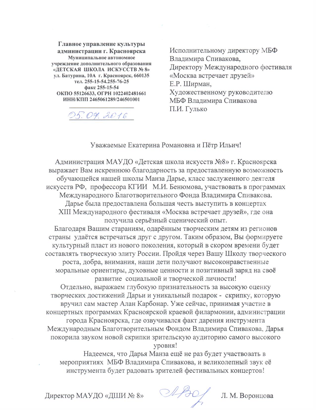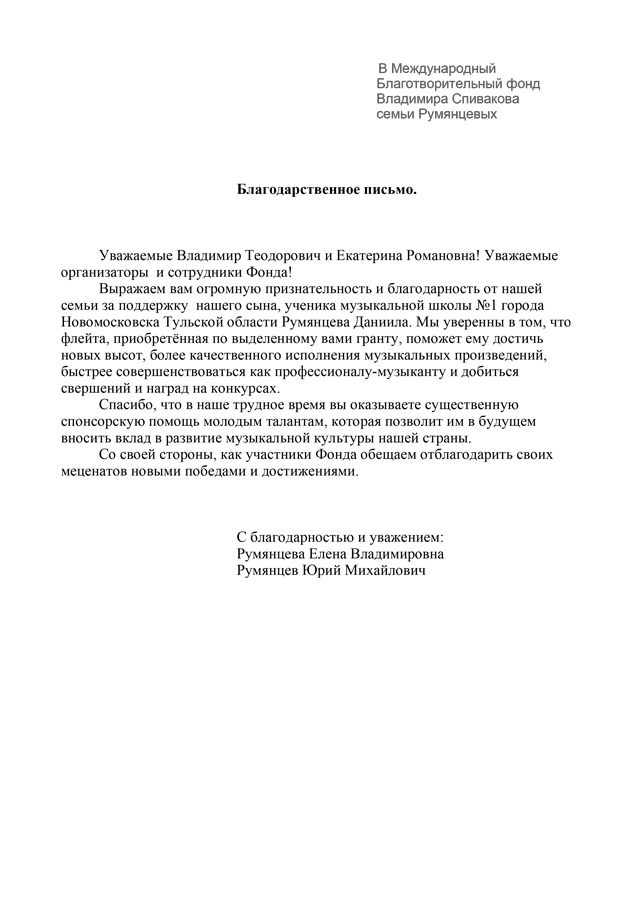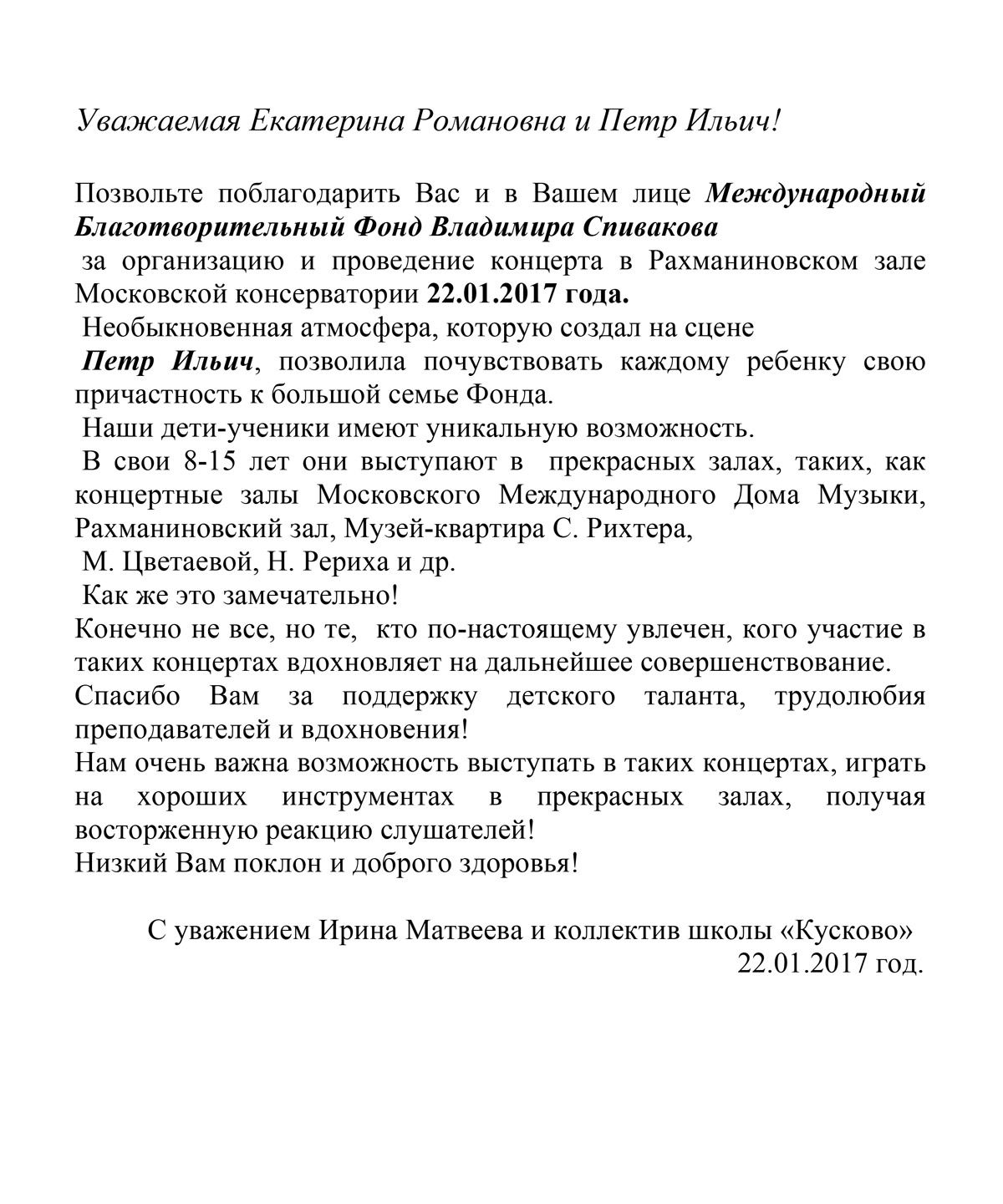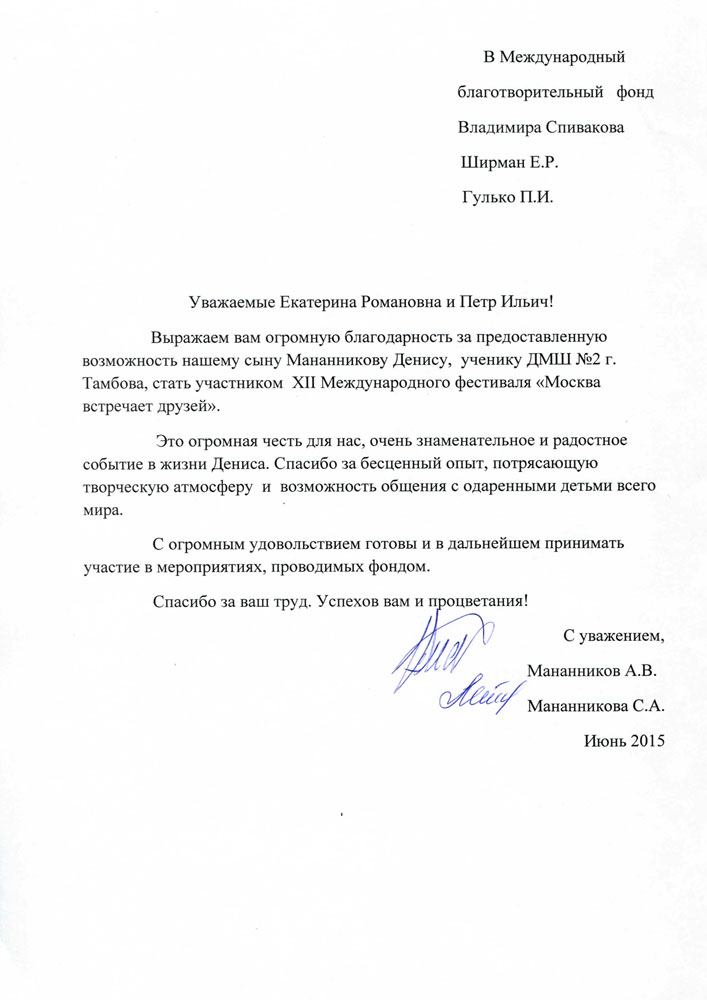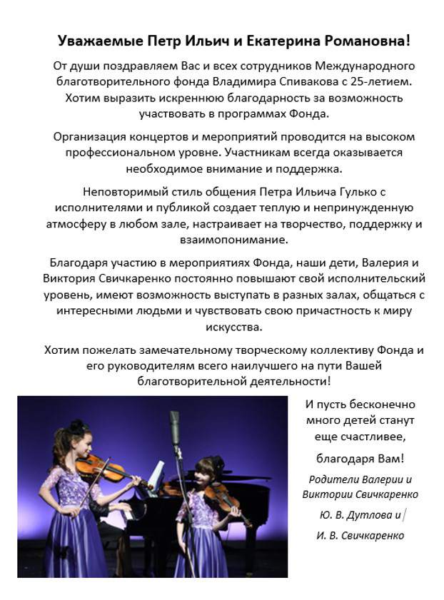 Мы, Свичкаренко Игорь Владимирович и Дутлова Юлия Валерьевна, хотим выразить искреннюю благодарность Международному Благотворительному Фонду Владимира Спивакова и лично Петру Ильичу Гулько и Екатерине Романовне Ширман, за предоставленную возможность нашим детям Валерии и Виктории выступить с концертом в Камерном Зале Московской государственной филармонии. Этот вечер стал яркой страницей в творческом пути наших детей. Такое общение с талантливыми молодыми исполнителями благотворно сказывается на профессиональном развитии наших детей.