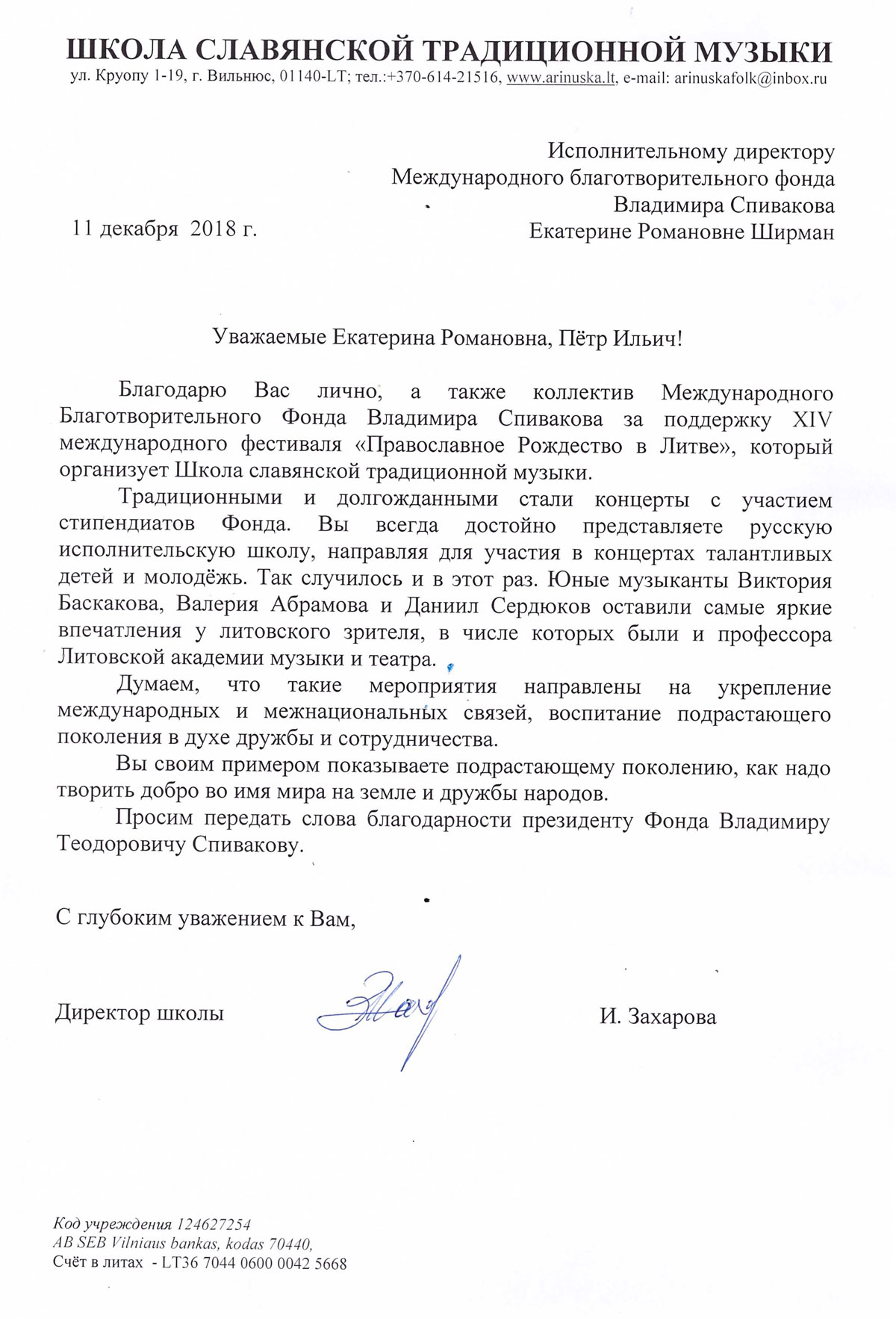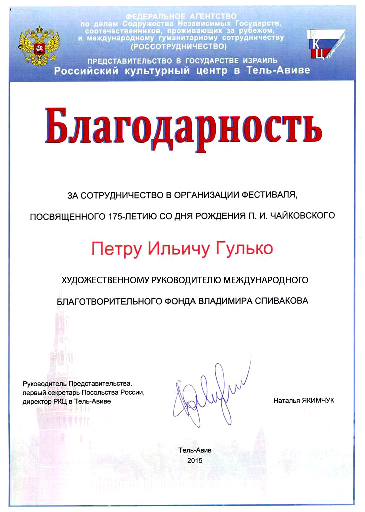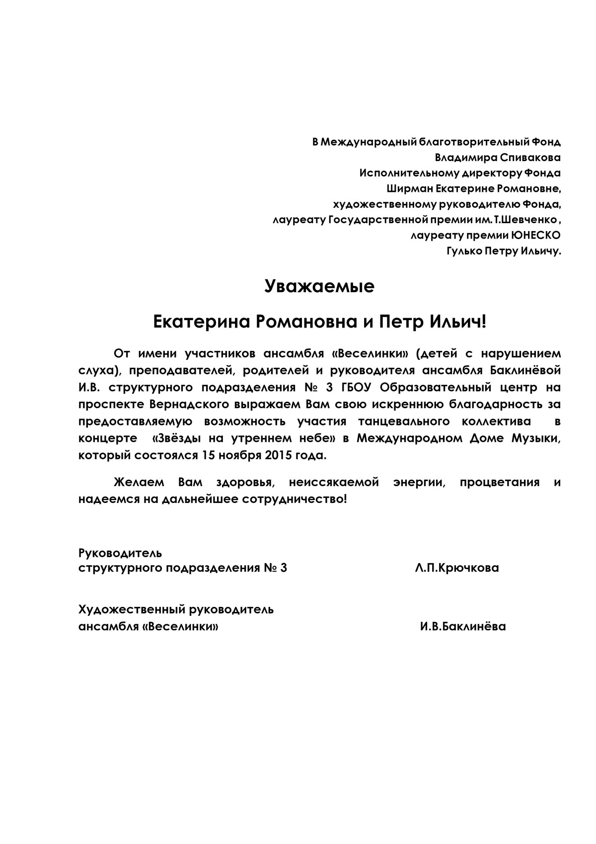Мы, Свичкаренко Игорь Владимирович и Дутлова Юлия Валерьевна, хотим выразить искреннюю благодарность Международному Благотворительному Фонду Владимира Спивакова и лично Петру Ильичу Гулько и Екатерине Романовне Ширман, за предоставленную возможность нашим детям Валерии и Виктории выступить с концертом в Камерном Зале Московской государственной филармонии. Этот вечер стал яркой страницей в творческом пути наших детей. Такое общение с талантливыми молодыми исполнителями благотворно сказывается на профессиональном развитии наших детей.