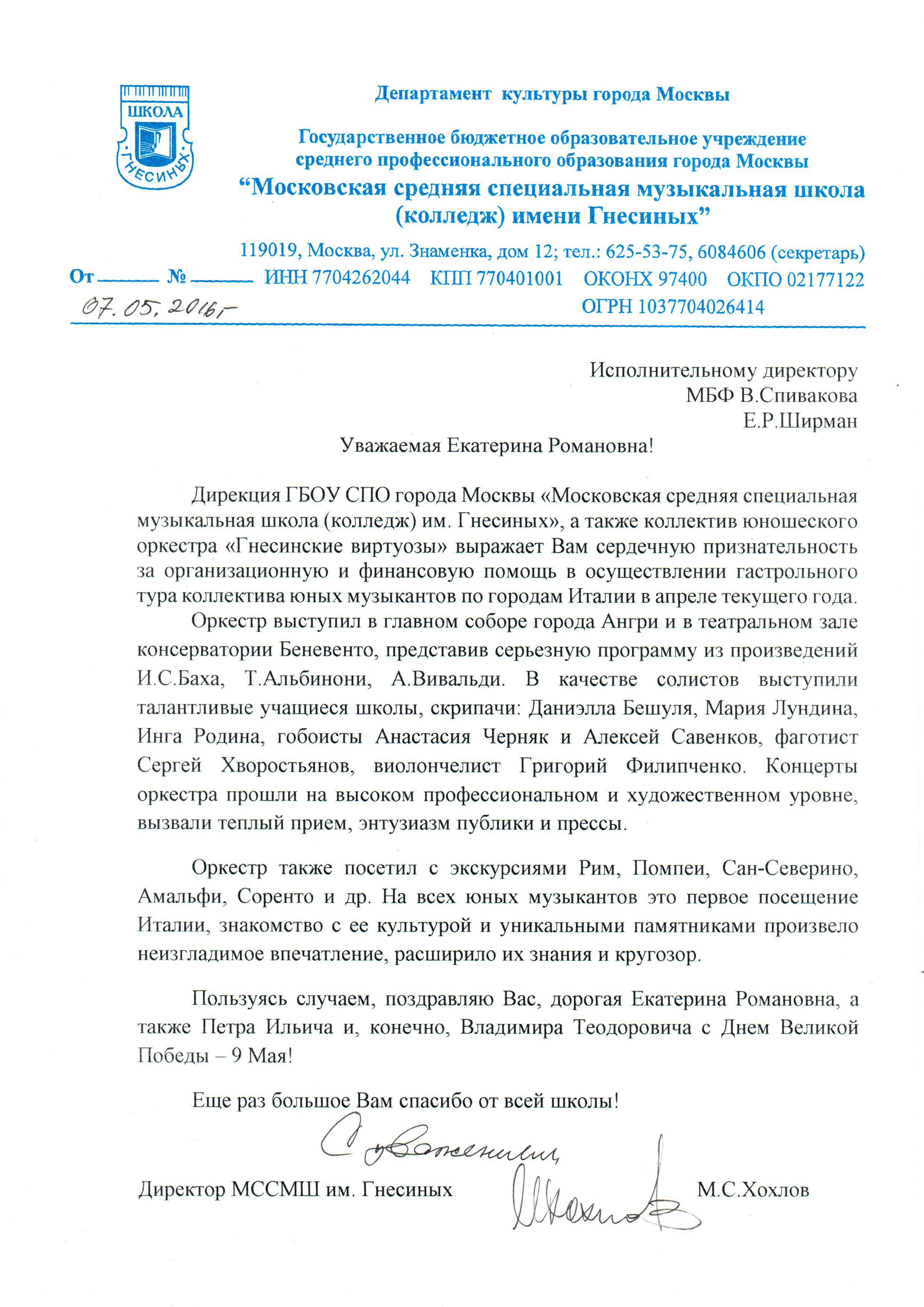 У нас не хватит слов, чтобы выразить Вам всю свою признательность и благодарность за великолепную творческую поездку в Венецию, на которую была приглашена наша дочь гобоистка Алиса Шишкова, ученица Анны Михайловны Варламовой.