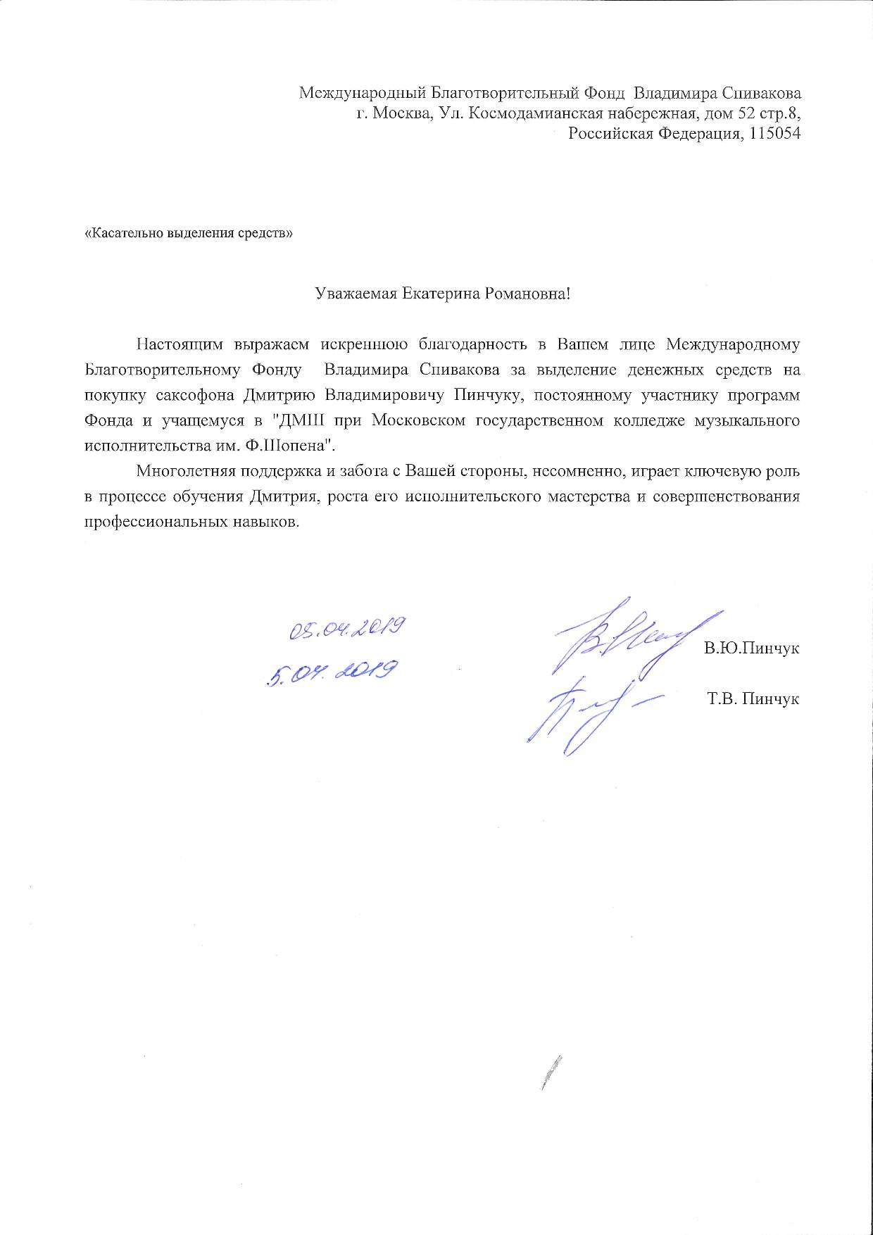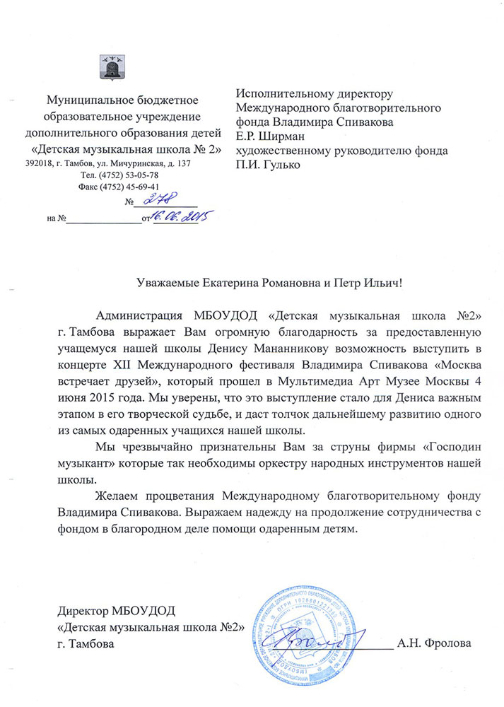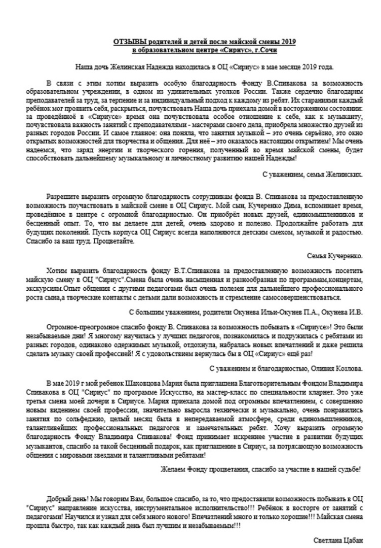 Уважаемые Екатерина Романовна и Пётр Ильич! От всей души выражаем искреннюю благодарность Вам лично и всем сотрудникам Международного Благотворительного Фонда Владимира Спивакова за предоставленную возможность пройти обучение в Образовательном Центре « Сириус» в г. Сочи. Это незабываемое событие в жизни нашего ребенка. Занятия с опытными педагогами, знакомство с музыкантами – ровесниками из других городов, совместные концерты, экскурсии и активный отдых, поздравление с днем рождения, прекрасное место и комфортные условия – двадцать пять дней пролетели как одна неделя. И, конечно же, одним из ярких событий стала встреча с президентами России и Индии — для подростка это очень значимое событие. Много новых друзей, уникальный опыт и навыки работы и игры на инструментах, планы и мечты, горящие глаза и огромное желание творить – все это привез наш ребенок из ОЦ «Сириус». Отдельное спасибо хочется сказать сотрудникам Фонда, организаторам этой удивительной поездки — все прошло четко и слаженно, на все вопросы были оперативно получены ясные и точные ответы.