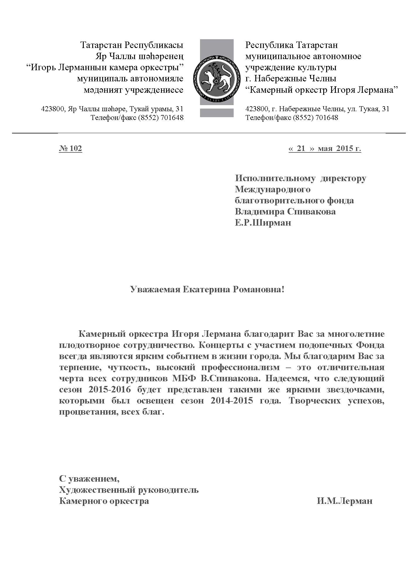 Мы с нетерпением ожидаем следующего концерта, который пройдет в Набережных Челнах с прекрасным оркестром Игоря Лермана. С благодарностью и уважением,