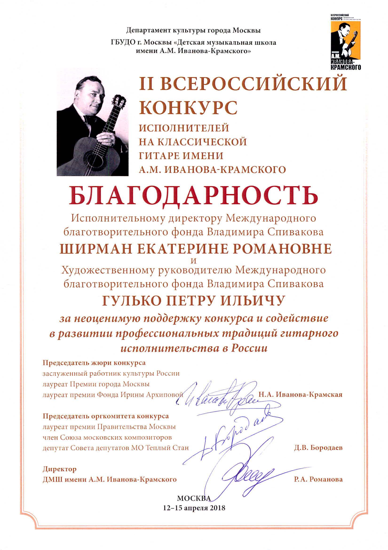 Спасибо огромное за предоставленную возможность посетить концерт «Музыка открывает сердца» с участием Стипендиатов Международного благотворительного фонда Владимира Спивакова, проходивший в концертном зале Московской государственной картинной галерее народного художника СССР Александра Шилова 1 апреля 2018 г.