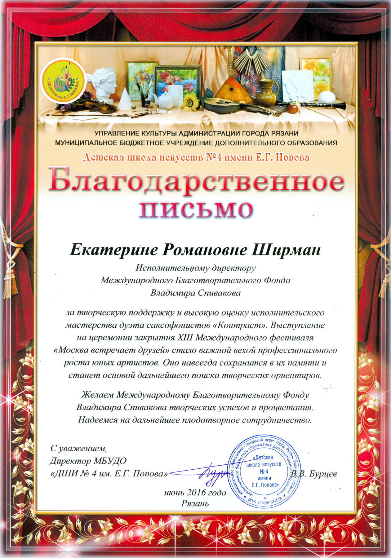 Мы благодарим директора фестиваля Екатерину Романовну Ширман за предоставленную нам возможность участия в ХI Международном фестивале » Москва встречает друзей» Это замечательный проект,который помогает всем детям,особенно из глубинки , раскрыть свой талант и развиваться.