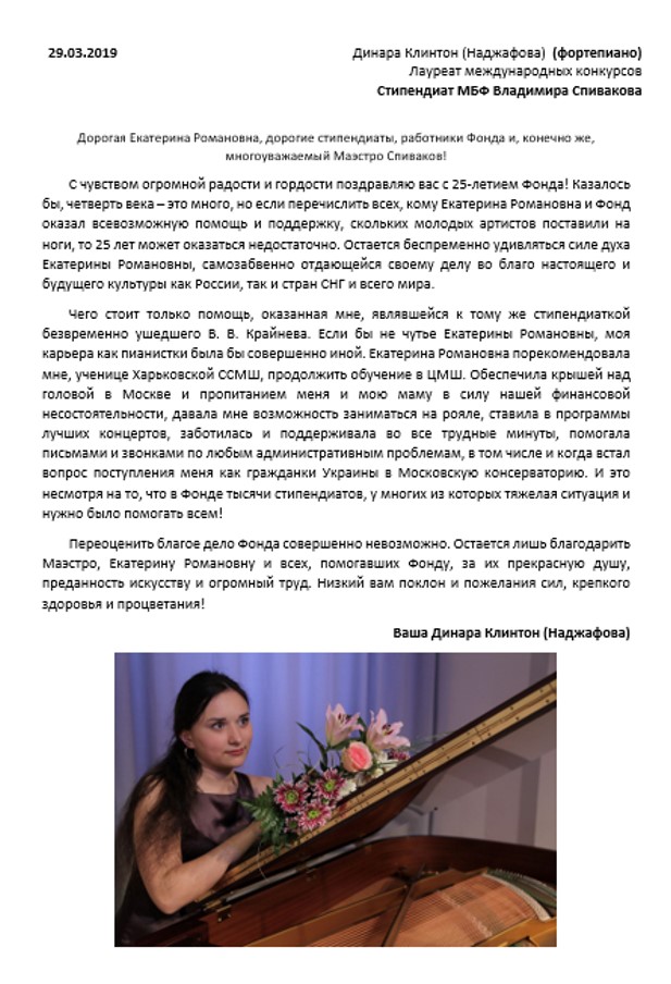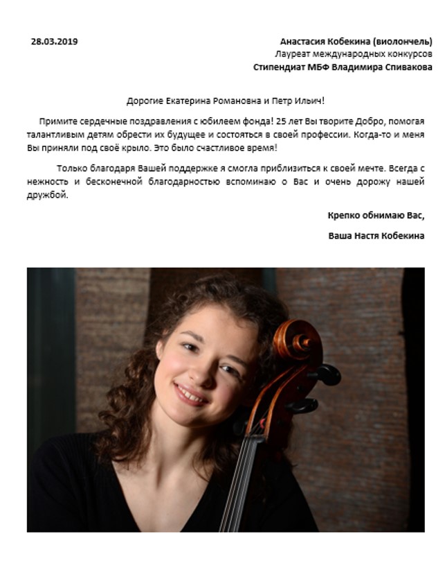 Уважаемые Екатерина Романовна и Петр Ильич, дорогой и любимый фонд! Хочется поздравить вас с этой прекрасной датой — 25 лет, четверть века! Вот уже 25 лет Вы открываете новые таланты, помогаете детям в профессиональном становлении, это неоценимо и благородно.