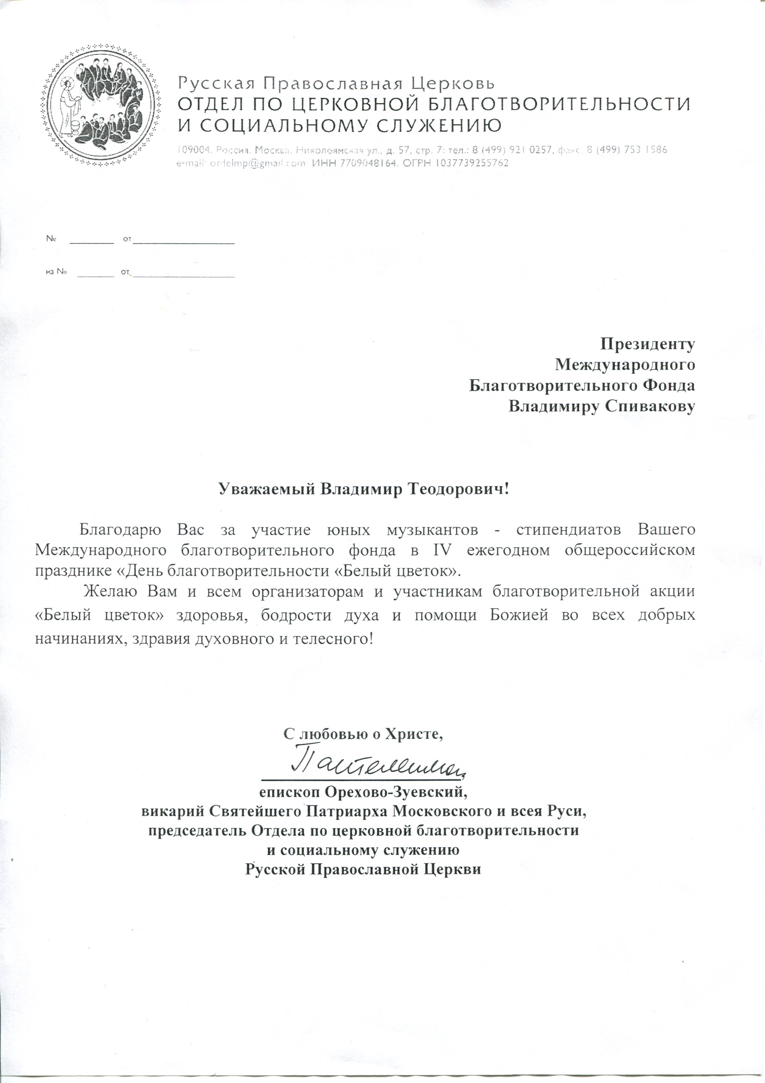 Прежде всего благодарю за Ваше письмо, в котором Вы высказываете желание ознакомить в Ватикане Его Святейшество Папу Франциска с творчеством талантливых детей, которым Вы оказываете помощь в развитии музыкальных талантов.