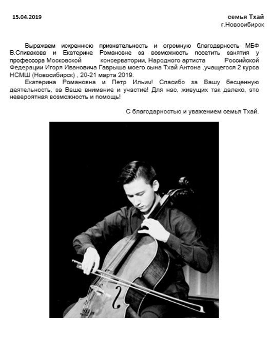 Здравствуйте! От всей нашей музыкальной семьи хотим выразить большую благодарность фонду Владимира Спивакова за предоставленную возможность поездки в образовательный центр «Сириус» нашего сына, Никонова Петра в мае 2018 года. Петр провел незабываемый месяц, под руководством прекрасных педагогов вырос как музыкант, приобрел новых друзей, повстречался с огромным количеством интересных людей, укрепил своё здоровье. Он вернулся из Сириуса окрыленный, полный творческих планов, от инструмента не отходит — занимается с огромным воодушевлением, Спасибо за это вашему фонду! Вы даете нашим детям уверенность в себе и своем деле — а это так важно! Петр находится рядом, пишем вам вместе с ним. Конечно, от него лично — огромное спасибо Фонду!