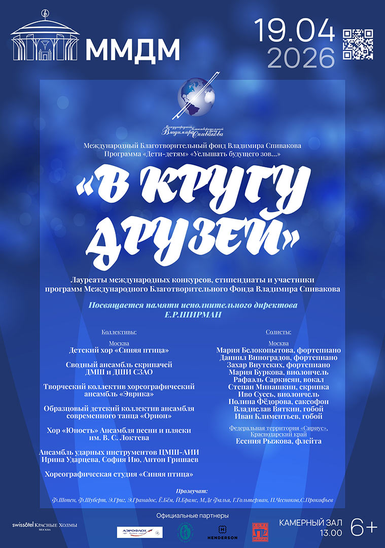 А в Москве в 13:00 состоится большой концерт «В кругу друзей» в Камерном зале Московского международного Дома музыки. Он будет посвящен памяти Екатерины Романовны Ширман, исполнительного директора Фонда Владимира Спивакова.