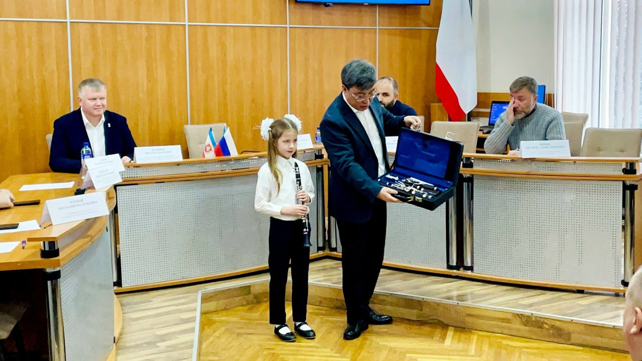 Полина Харланова получила кларнет, на который Фонд Владимира Спивакова собрал деньги благодаря проекту «СберВместе». Само по себе событие радостное, но впечатляет и обстановка, в которой состоялось вручение: кларнет Полине 9 февраля передал глава Феодосии Владимир Ким в администрации города.