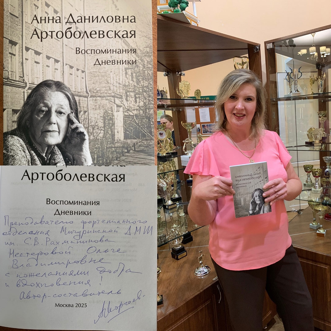 К 1 сентября Детская музыкальная школа им. Рахманинова в Мичуринске получила, как известно, самый лучший подарок — книги. Это издание, которое особенно интересно преподавателям школы: А. С. Моргоев «Анна Даниловна Артоболевская. Воспоминания. Дневники» — с автографом самого автора-составителя книги.