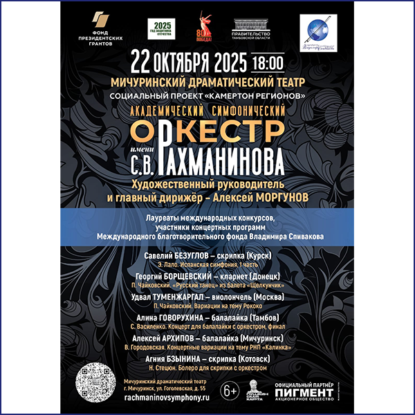 В этот день на сцену театра выйдет Академический симфонический оркестр им. С.В. Рахманинова (г. Тамбов) под управлением Алексея Моргунова, а солировать будут лауреаты международных конкурсов, воспитанники Фонда Владимира Спивакова и местные юные звезды.