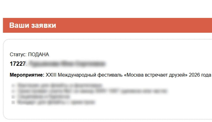 Мы видим, что во многих профилях в личном кабинете (lk.spivakov.ru/) в феврале была активность, но далеко не всегда она привела к отправке заявок на фестиваль. Чтобы убедиться, что вы все правильно сделали и заявка действительно подана, посмотрите на ее статус на главной странице личного кабинета. Там должна отображаться эта информация так, как показано на скриншоте, который мы приложили к этому сообщению.