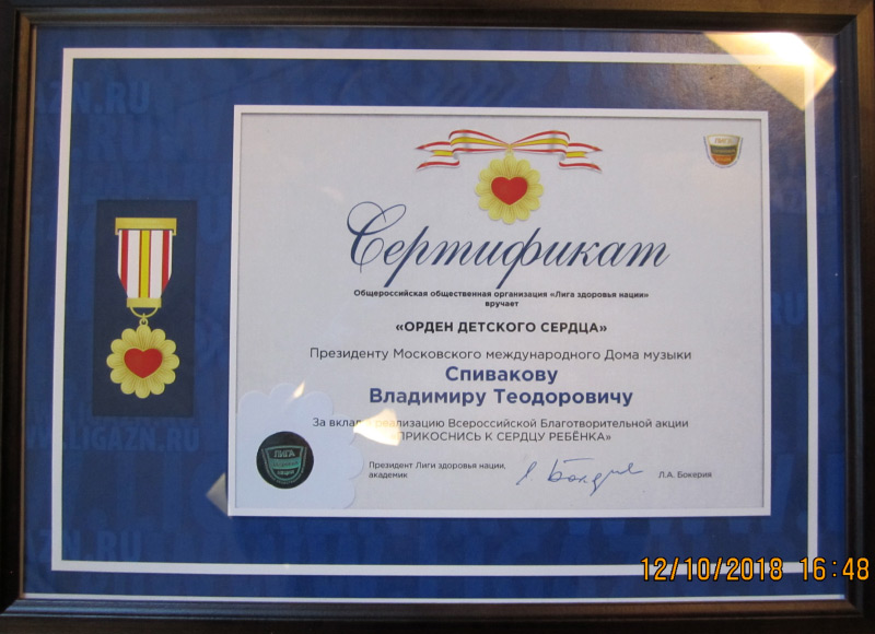 Ведущий детский кардиохирург, профессор Лео Антонович Бокерия и Президиум Лиги здоровья нации наградил маэстро Владимира Теодоровича Спивакова, президента Международного благотворительного фонда В. Спивакова «Орденом детского сердца» за вклад в реализацию программ «Прикоснись к сердцу ребенка».