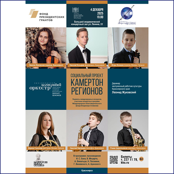 Концерт пройдет в Большом академическом концертом зале на улице Ленина, 22 в четверг, 4 декабря, в 19:00. На сцену с Красноярским камерным оркестром выйдут юные талантливые солисты-инструменталисты.