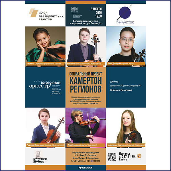 Но кульминацией программы проекта станет концерт 6 апреля в 19:00 в Большом академическом зале Сибирского государственного института искусств имени Дмитрия Хворостовского. На сцену выйдут юные музыканты из Красноярска и других городов России. Они выступят вместе с Красноярским камерным оркестром под управлением художественного руководителя и главного дирижера, заслуженного деятеля искусств России Михаила Бенюмова.
