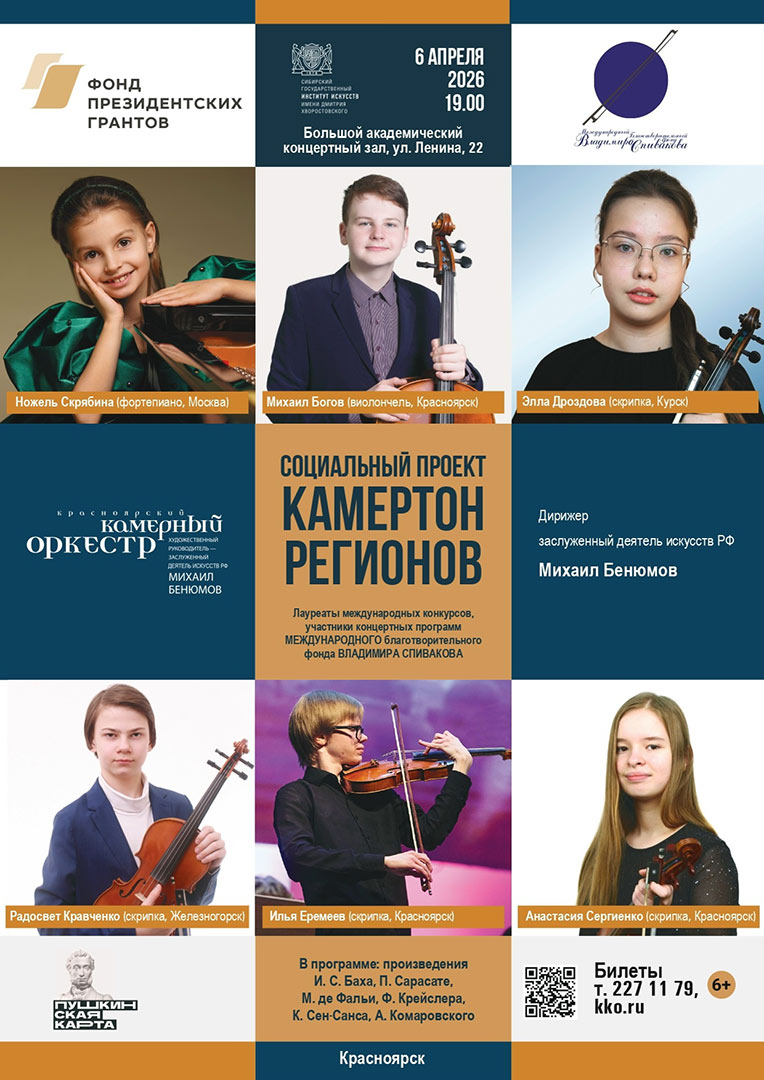 Но кульминацией программы проекта станет концерт 6 апреля в 19:00 в Большом академическом зале Сибирского государственного института искусств имени Дмитрия Хворостовского. На сцену выйдут юные музыканты из Красноярска и других городов России. Они выступят вместе с Красноярским камерным оркестром под управлением художественного руководителя и главного дирижера, заслуженного деятеля искусств России Михаила Бенюмова.
