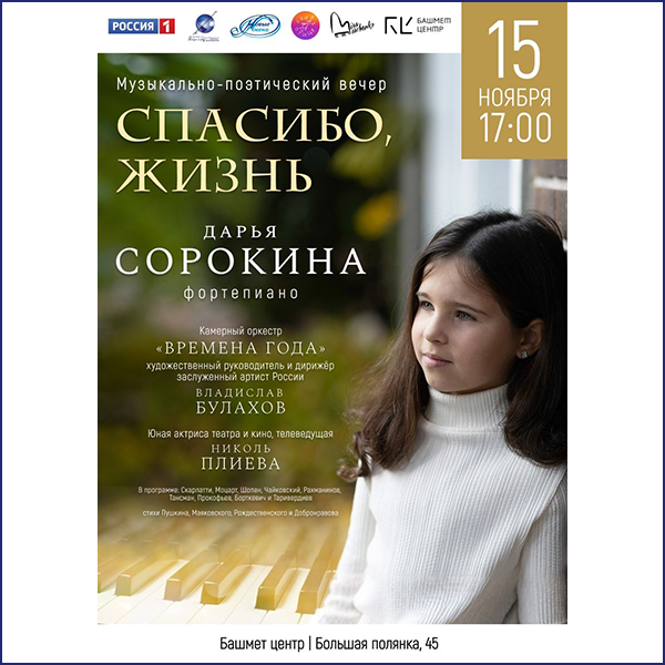 Пианистка Дарья Сорокина 15 ноября в «Башмет Центре» в Москве выступила на музыкально-поэтическом вечере «Спасибо, жизнь». Она играла с камерным оркестром «Времена года» под руководством заслуженного артиста России Владислава Булахова.