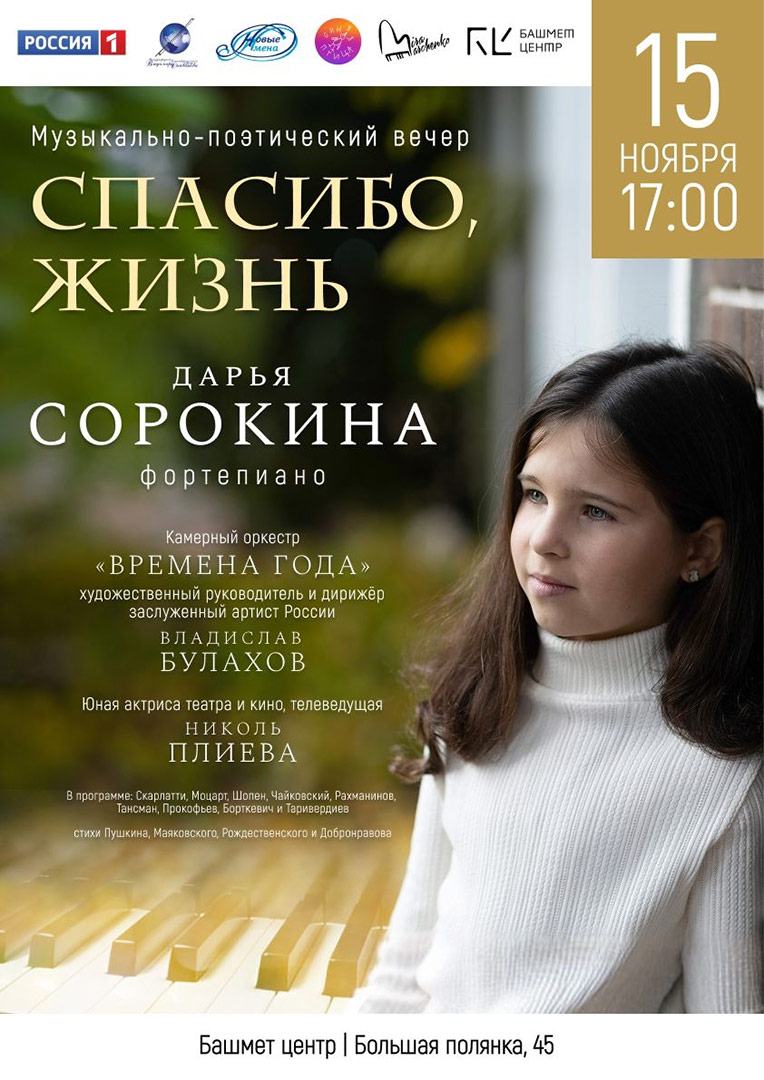 Пианистка Дарья Сорокина 15 ноября в «Башмет Центре» в Москве выступила на музыкально-поэтическом вечере «Спасибо, жизнь». Она играла с камерным оркестром «Времена года» под руководством заслуженного артиста России Владислава Булахова.